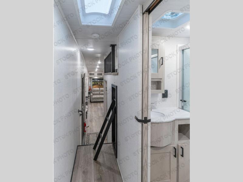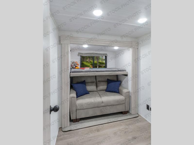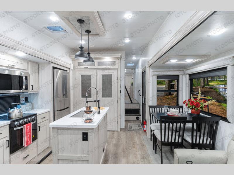 Use this Tandara fifth wheel for the grandest adventures with a large group of people! You can fit a total of nine travelers in this unit because there is a king-size bed, two hide-a-bed sofas, a fold-down bunk, and a loft for sleeping. Additionally, the opposing slides in the main living area give you more space for all of these people to sit down and chat or gather around the kitchen island. The 16 cu. ft. 12V refrigerator can store anything your group will need to stay fed throughout your trip, and the four-burner range can cook up that food with plenty of ease. On the exterior, there is an oversized pass-through storage compartment that can be used when you want to bring along beach umbrellas, picnic blankets, and outdoor games, and the two electric awnings offer protection from the sun while you relax outside.