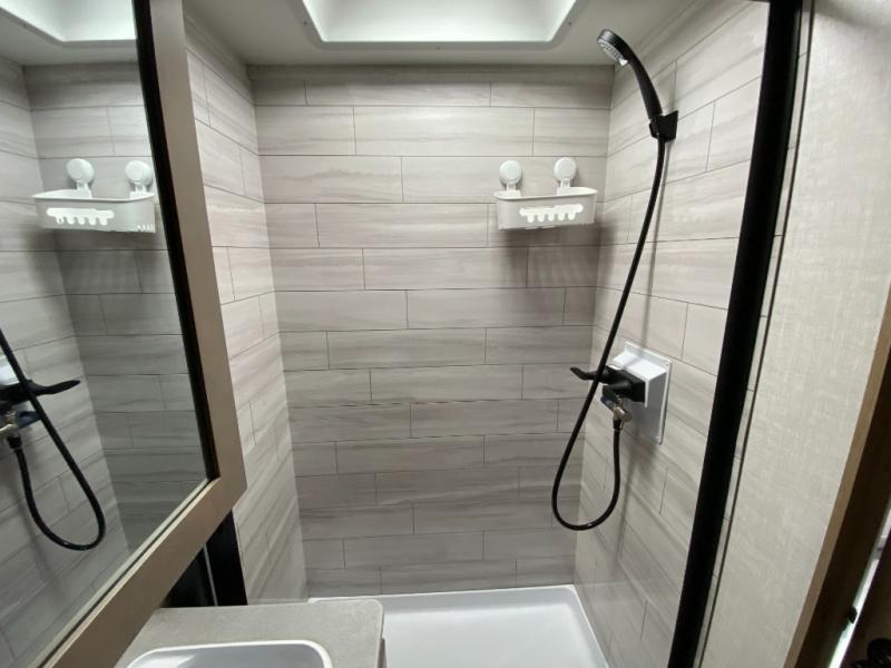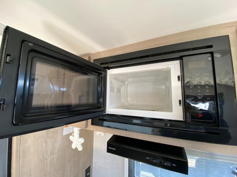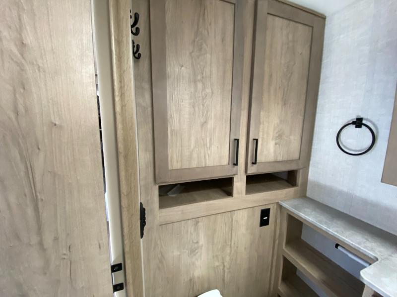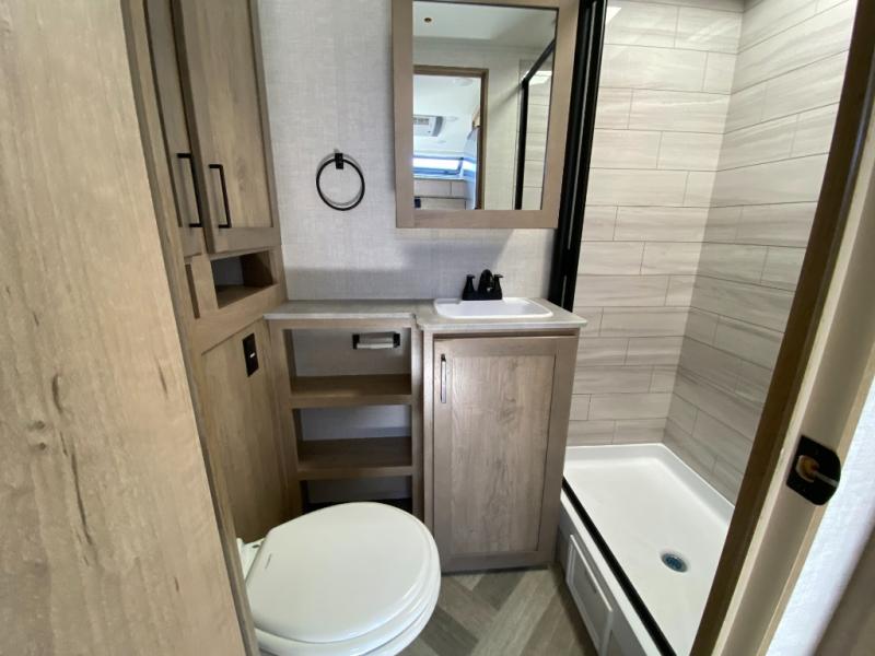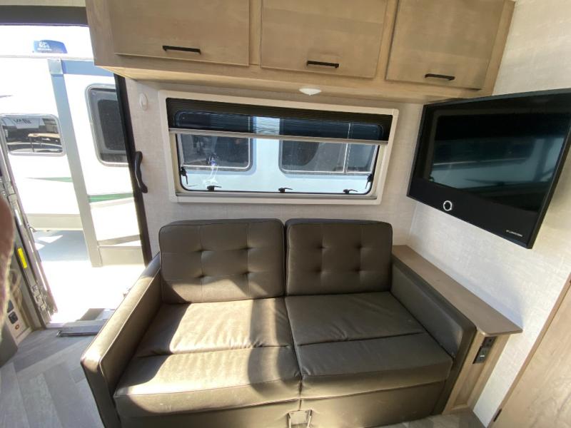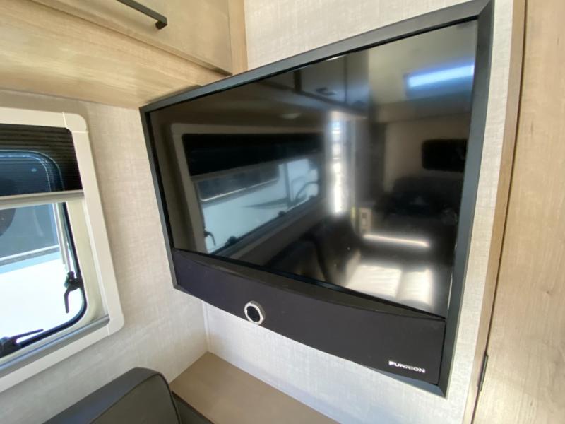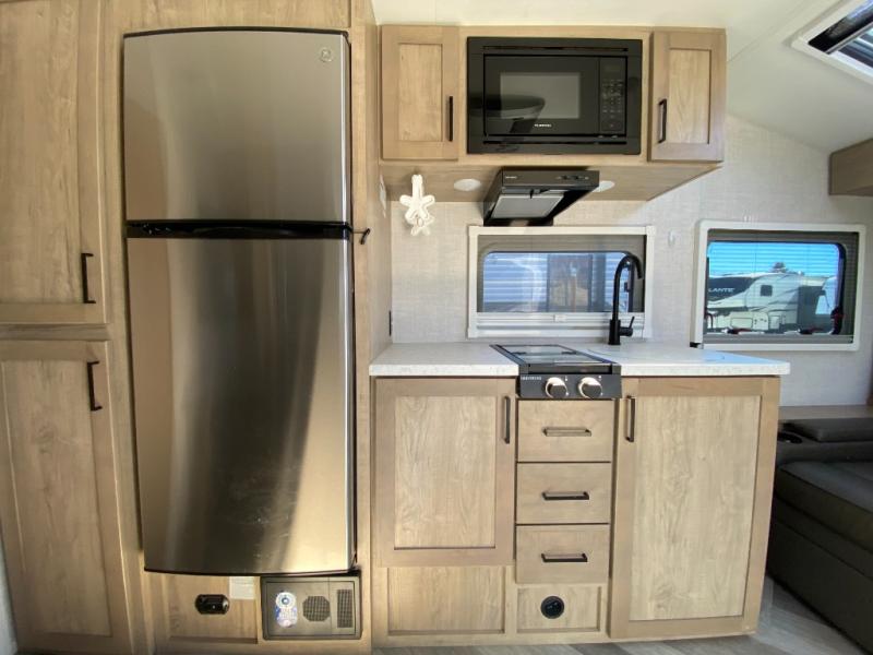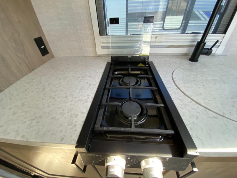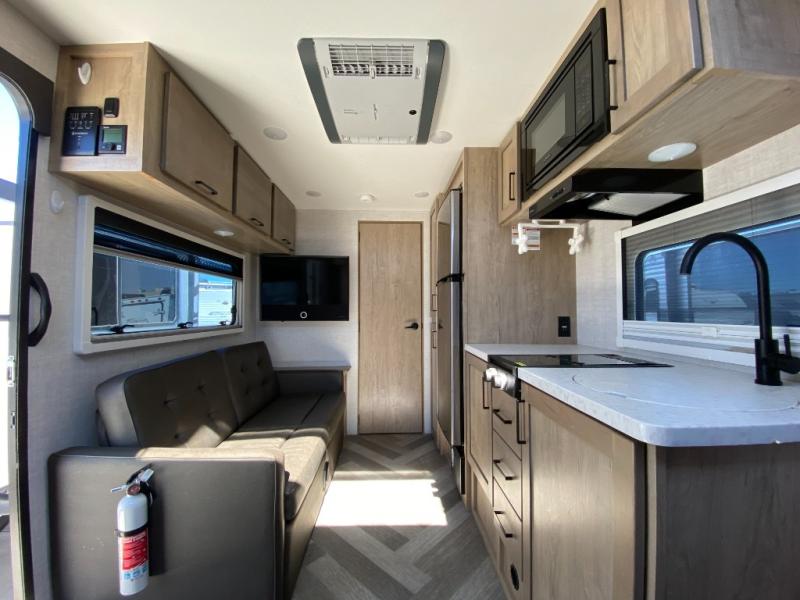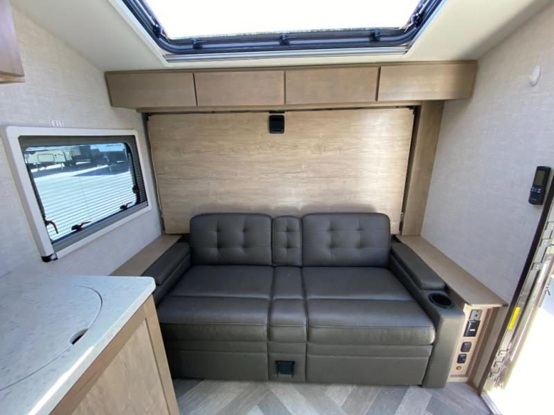 Go off-grid camping in comfort with this travel trailer! It features a full rear bathroom with a 24" x 40" shower to clean up in after a day of exploring and there is a wardrobe/linen closet to keep your towels close by as well. You can prepare your best meals with the two burner cooktop and 12V refrigerator, then enjoy them at the jackknife sofa with a removable table which is across from a 12V HDTV/AV system. Store all of your outdoor gear in the exterior pass-through storage areas and stay protected by the 12' electric awning with dimmable LED light while you cook at the outside kitchen which has a 1.6 cu. ft. refrigerator and an optional griddle. When you're ready to wind down your nights, lay down on the front 60" x 80" Murphy bed and admire the beautiful stars through the "Stargazer" skylight!