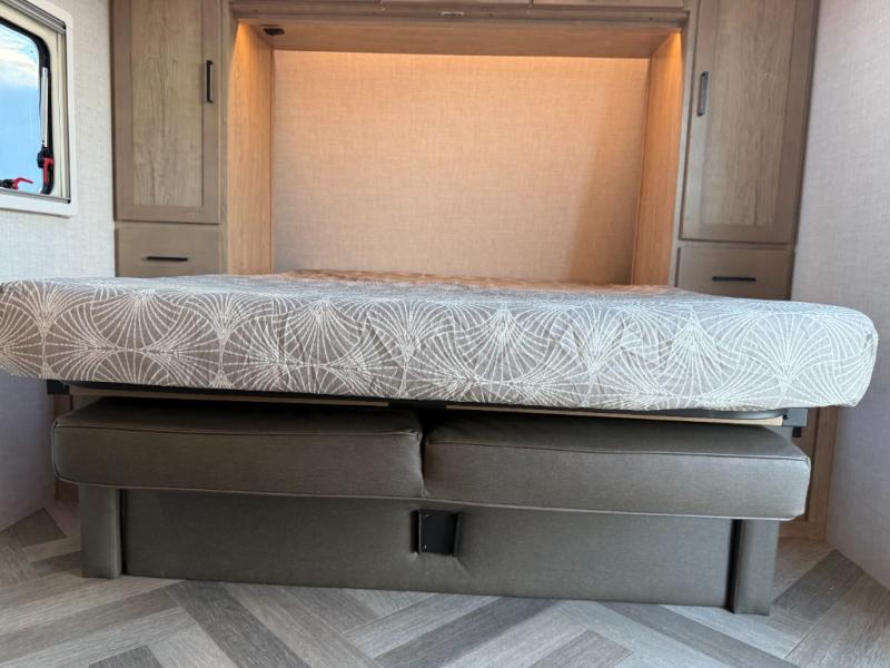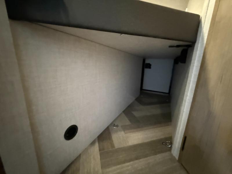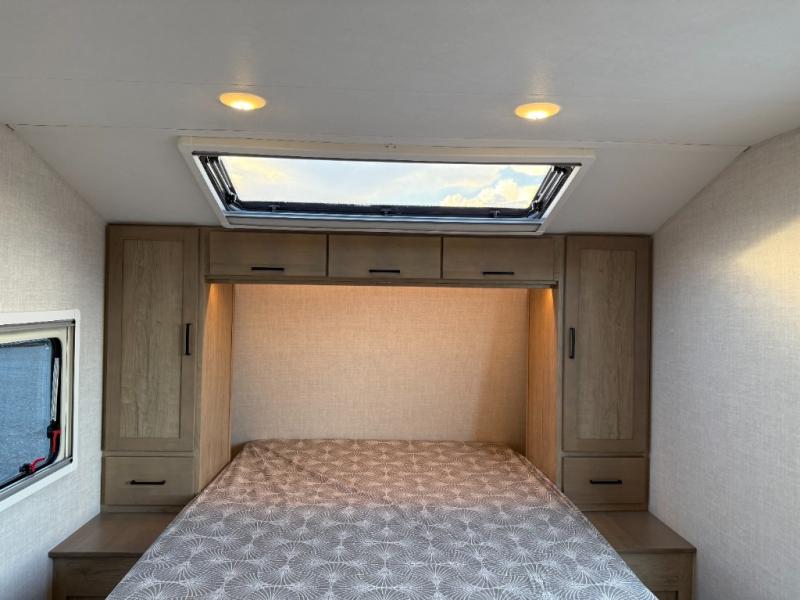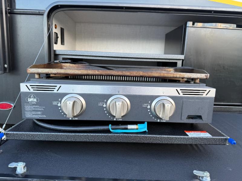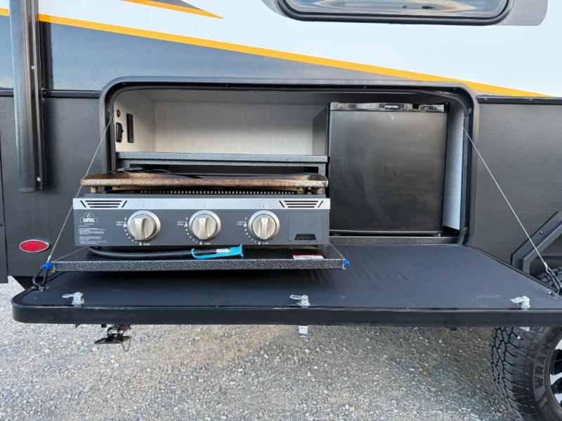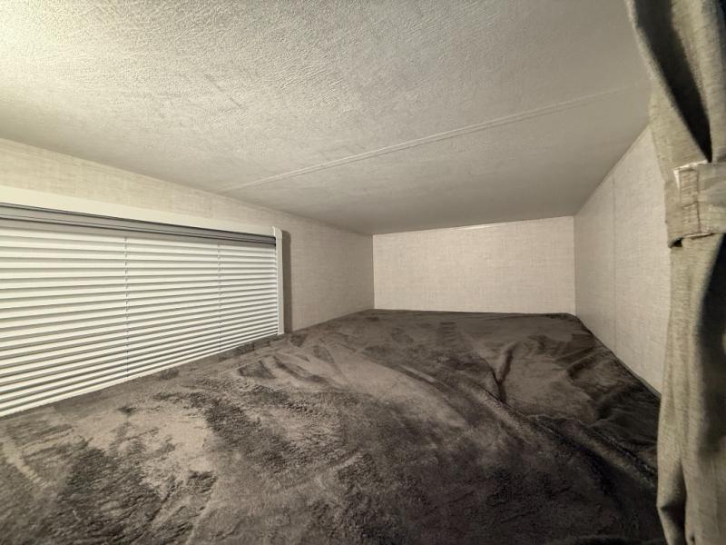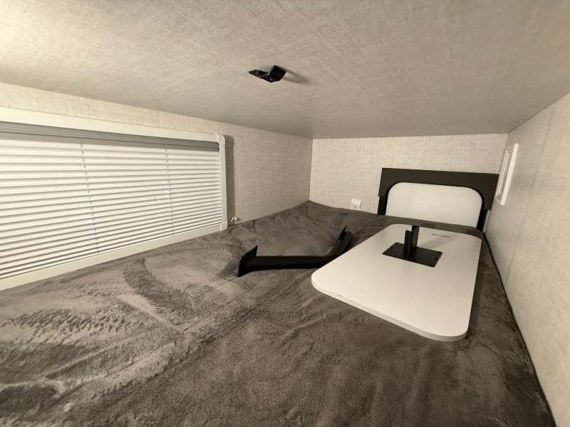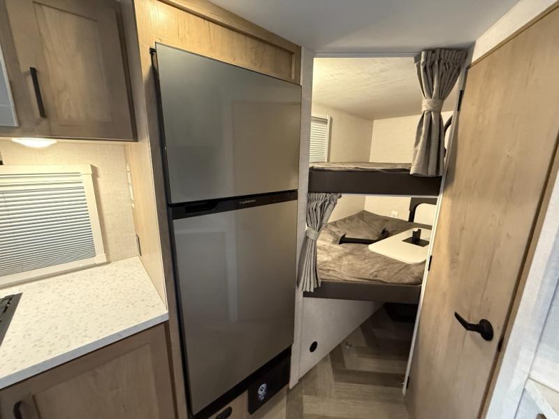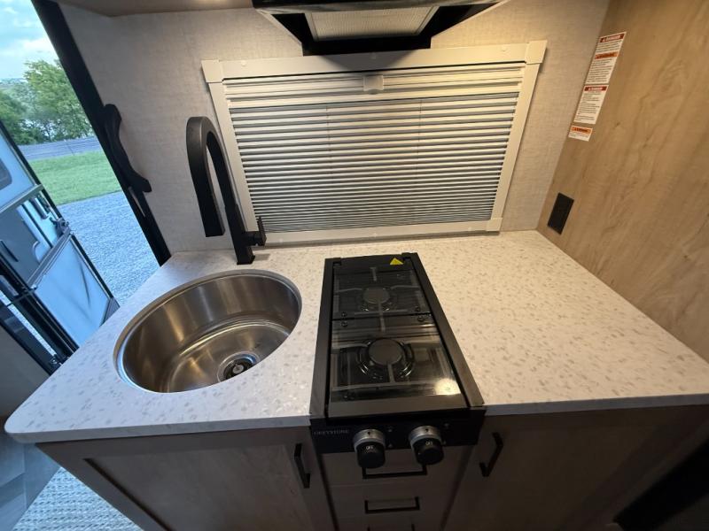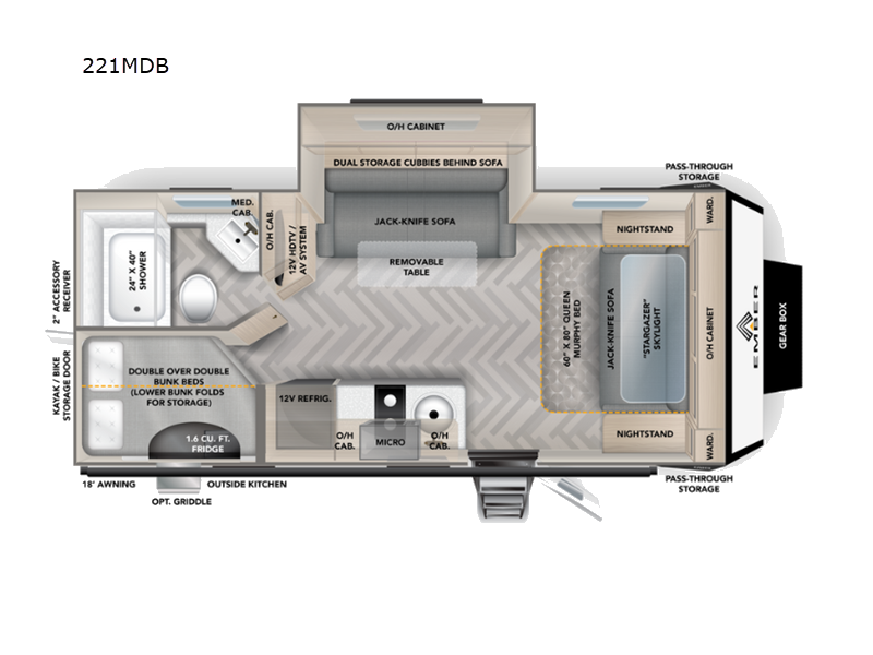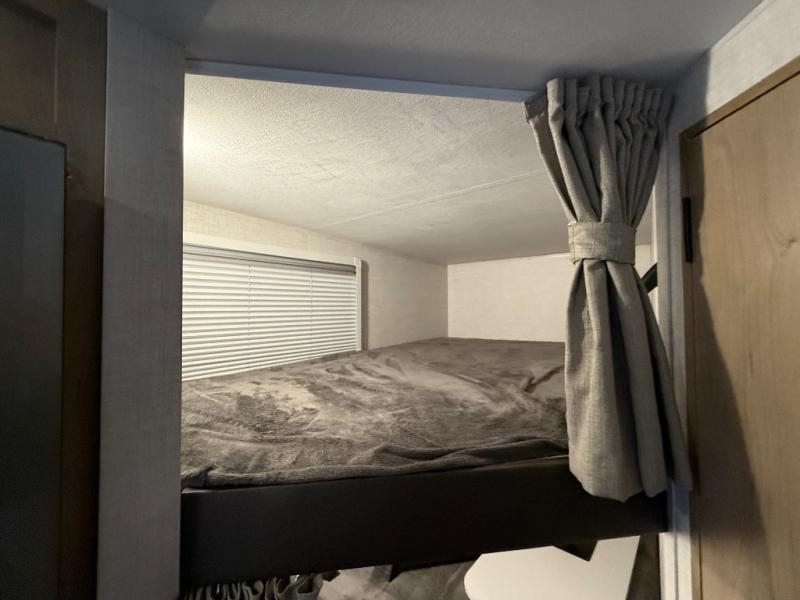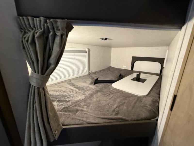 You can gaze at the stars in the comfort of your bed in this travel trailer with the "Stargazer" skylight! The front Murphy bed not only provides a 60" x 80" queen bed for at night, but also a jackknife sofa to sit on during the day while you watch a movie across from the 12V HDTV/AV system. You also have a second jackknife sofa on a slide with a removable table and dual storage cubbies behind it. The kiddos will get a good night's rest each night on the set of double-sized bunk beds and the lower bunk even folds for storage space, plus there is a kayak/bike door for easy access. Everyone will stay squeaky clean with the 24" x 40" shower in the rear corner bathroom, and their bellies full with the two burner cooktop and the outside kitchen which has a 1.6 cu. ft. refrigerator and optional griddle!