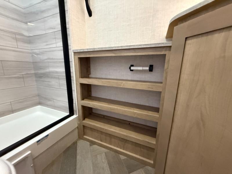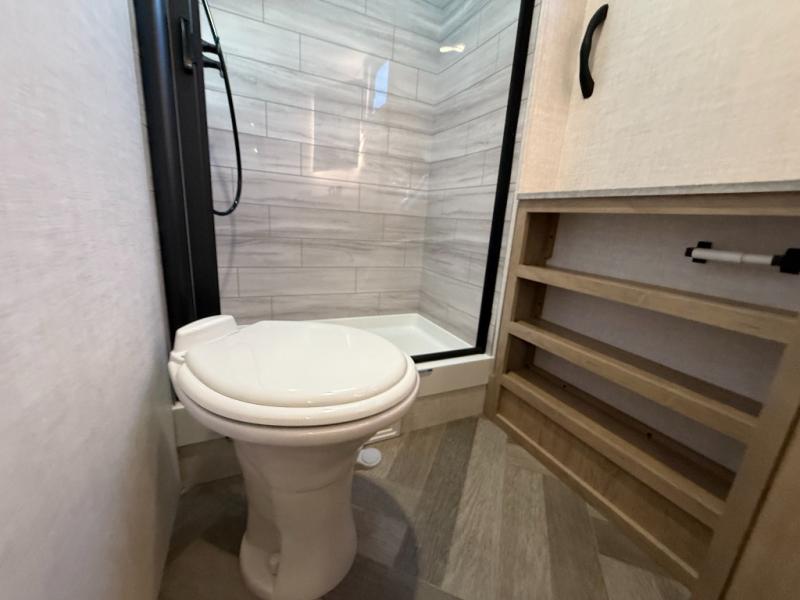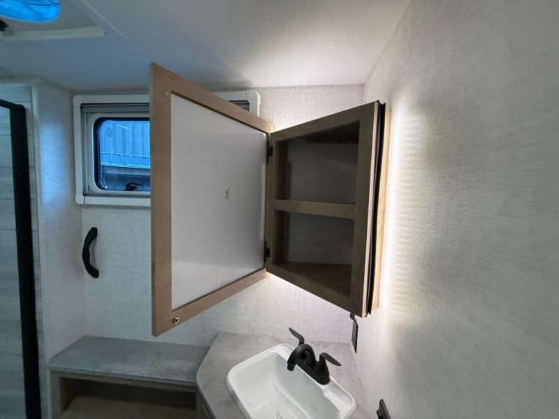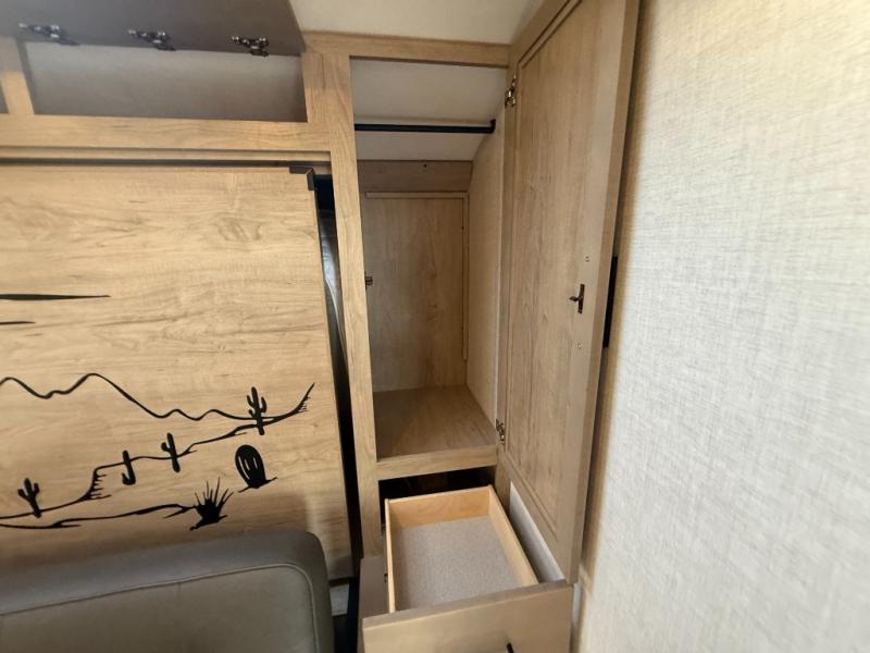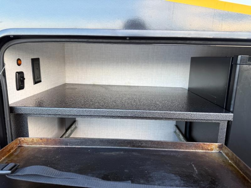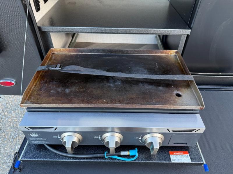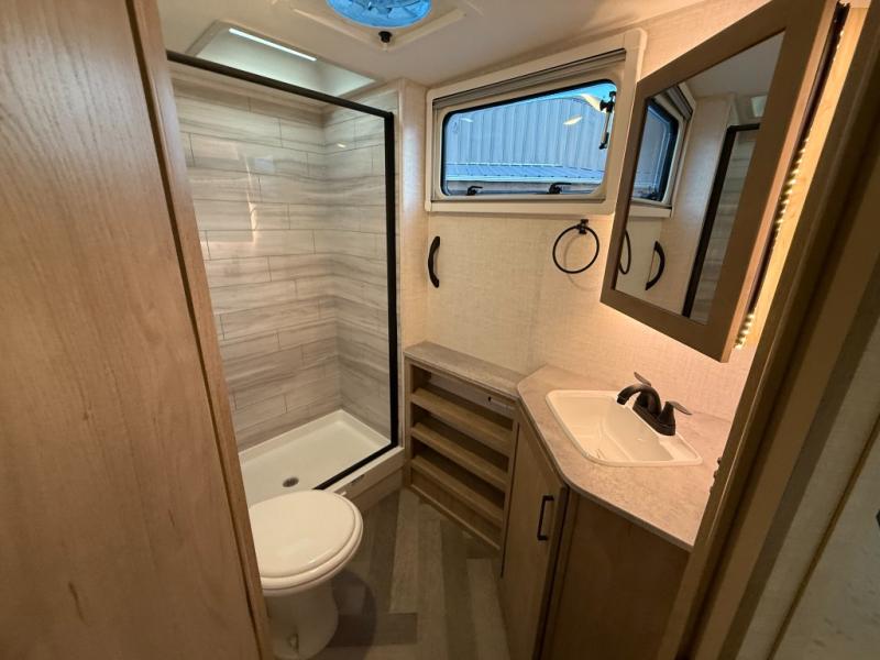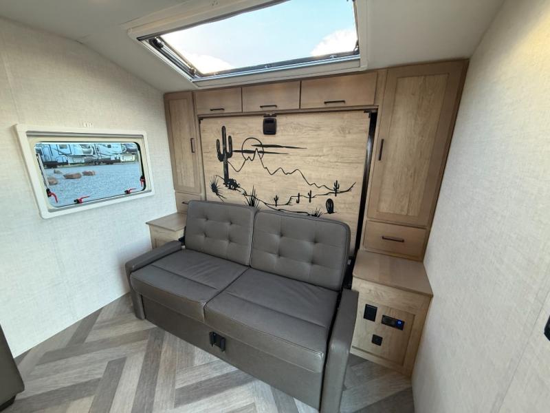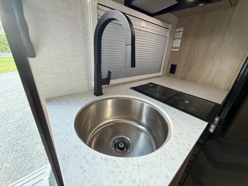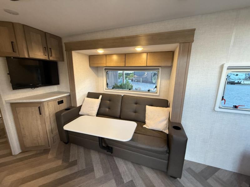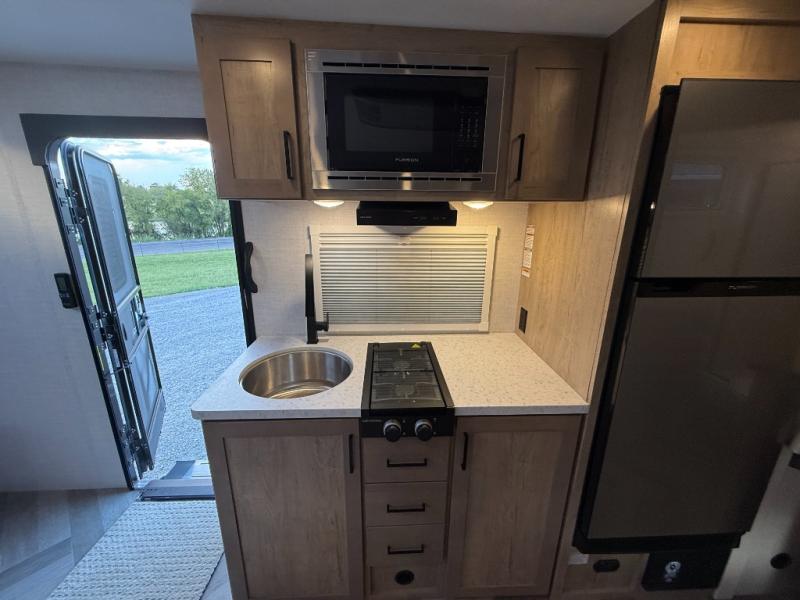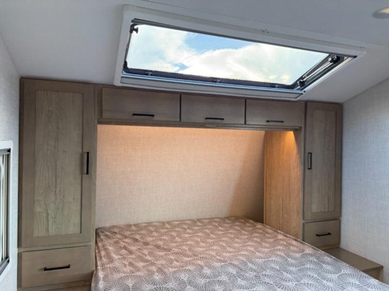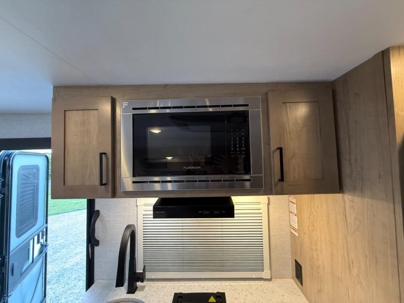 You can gaze at the stars in the comfort of your bed in this travel trailer with the "Stargazer" skylight! The front Murphy bed not only provides a 60" x 80" queen bed for at night, but also a jackknife sofa to sit on during the day while you watch a movie across from the 12V HDTV/AV system. You also have a second jackknife sofa on a slide with a removable table and dual storage cubbies behind it. The kiddos will get a good night's rest each night on the set of double-sized bunk beds and the lower bunk even folds for storage space, plus there is a kayak/bike door for easy access. Everyone will stay squeaky clean with the 24" x 40" shower in the rear corner bathroom, and their bellies full with the two burner cooktop and the outside kitchen which has a 1.6 cu. ft. refrigerator and optional griddle!