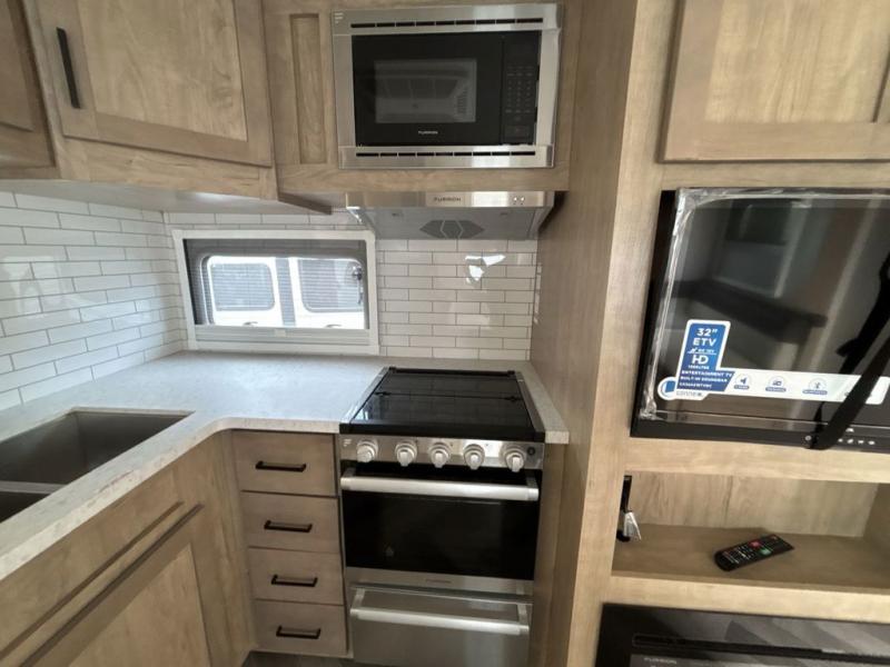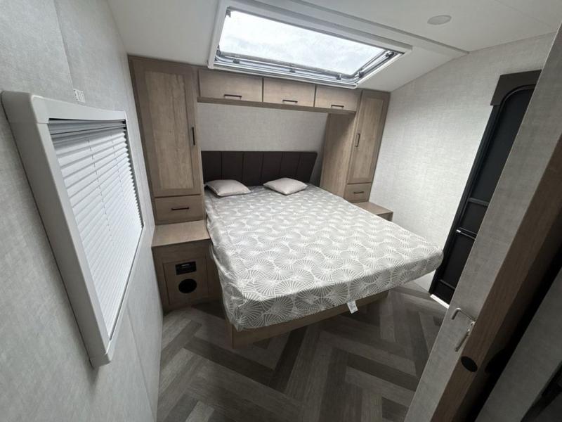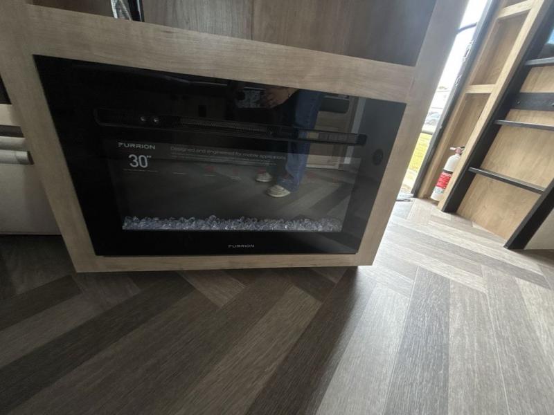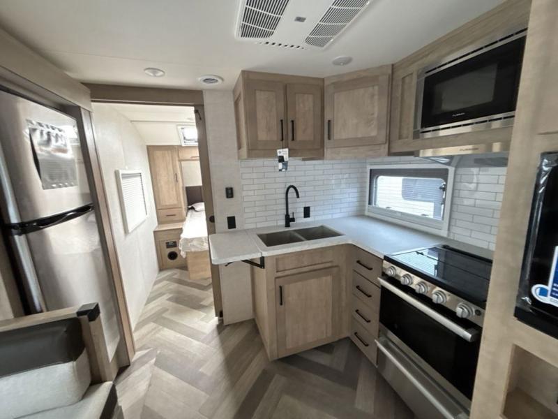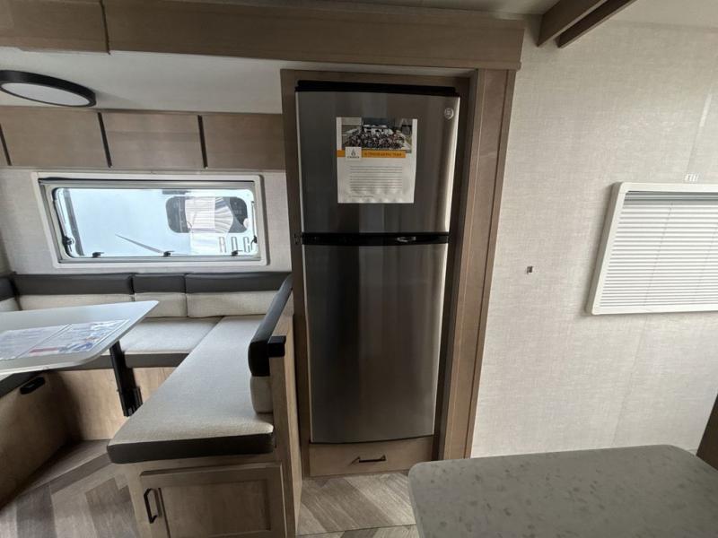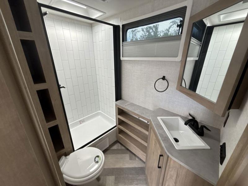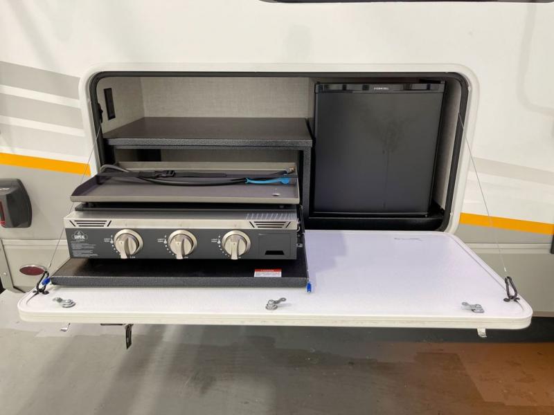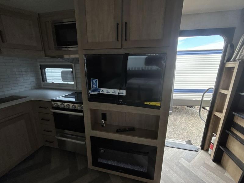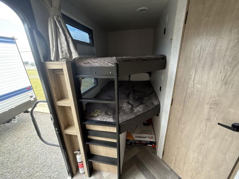 The whole family will love camping in this travel trailer! There is a set of double over double bunk beds with the lower bunk being able to fold for storage. You will have your own privacy with the front private bedroom which has a queen bed with a "Stargazer" skylight above it and one of the dual entry doors to the unit. The chef can prepare their best meals in the fully equipped kitchen with a flip-up countertop for even more prepping space. The U-shaped dinette with removable table not only provides a comfortable place to enjoy meals. but also to play games and transform into a sleeping space. Everyone can freshen up in the rear corner bathroom with the 30" x 34" shower. You could even add the optional outside kitchen to enjoy meals underneath the 21' electric awning with dimmable lights!