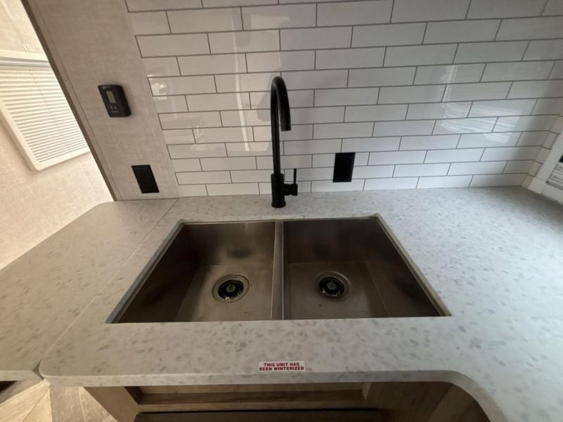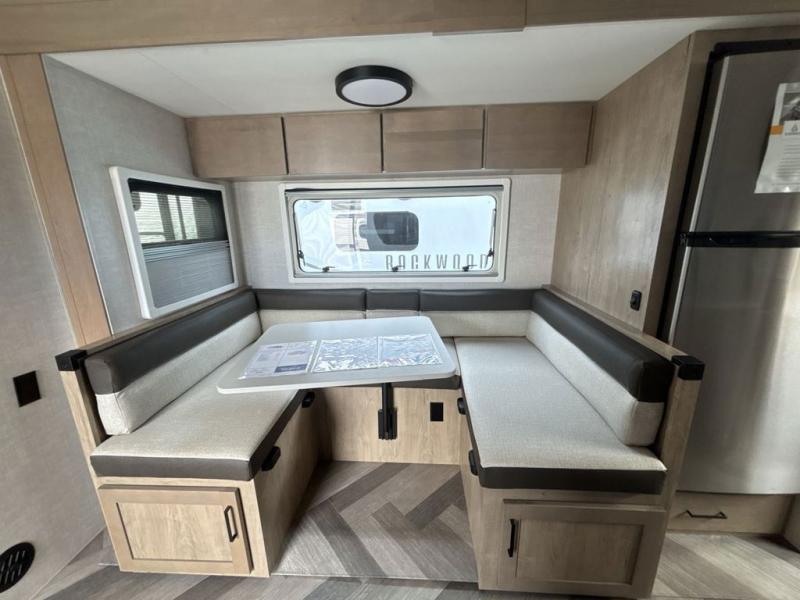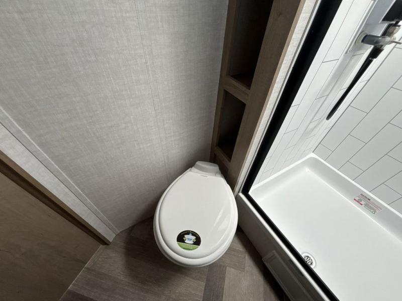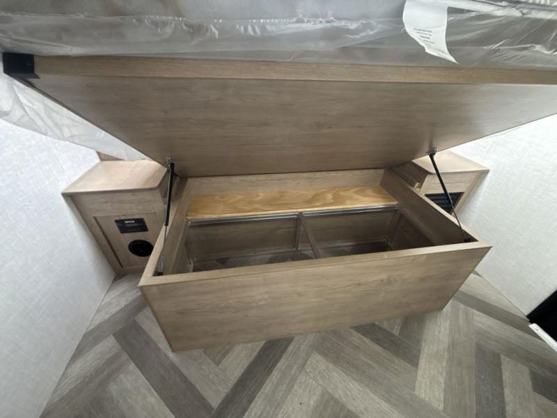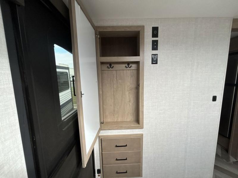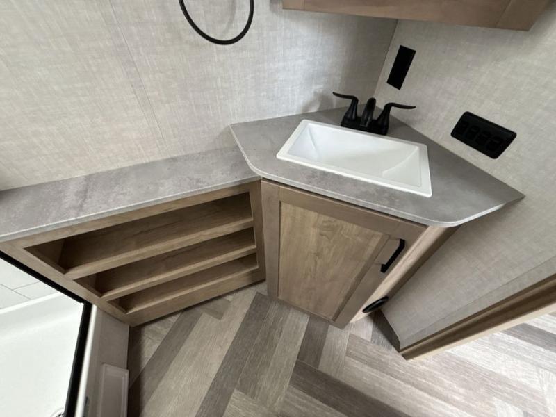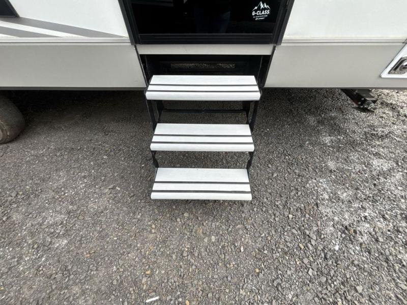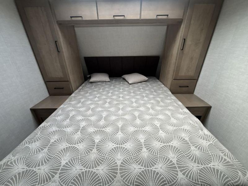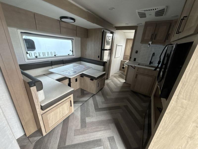 The whole family will love camping in this travel trailer! There is a set of double over double bunk beds with the lower bunk being able to fold for storage. You will have your own privacy with the front private bedroom which has a queen bed with a "Stargazer" skylight above it and one of the dual entry doors to the unit. The chef can prepare their best meals in the fully equipped kitchen with a flip-up countertop for even more prepping space. The U-shaped dinette with removable table not only provides a comfortable place to enjoy meals. but also to play games and transform into a sleeping space. Everyone can freshen up in the rear corner bathroom with the 30" x 34" shower. You could even add the optional outside kitchen to enjoy meals underneath the 21' electric awning with dimmable lights!