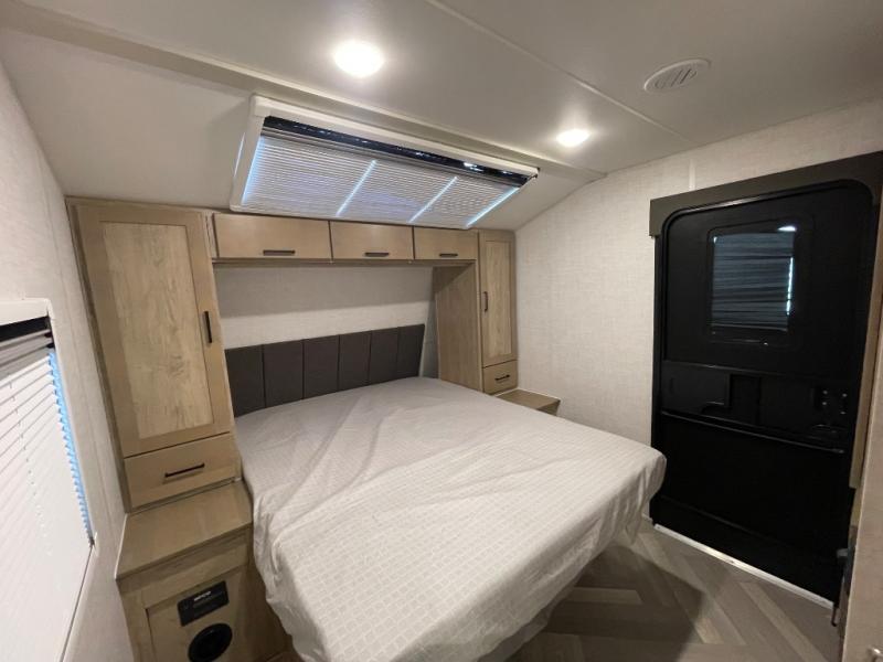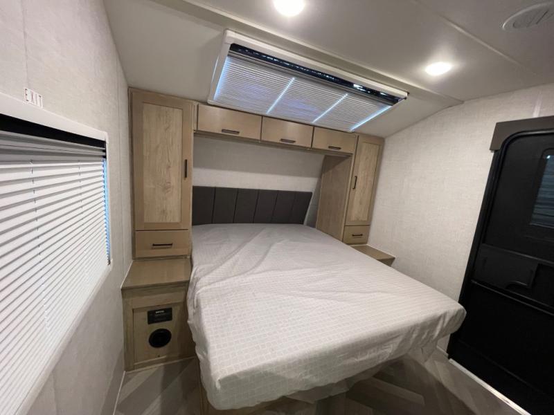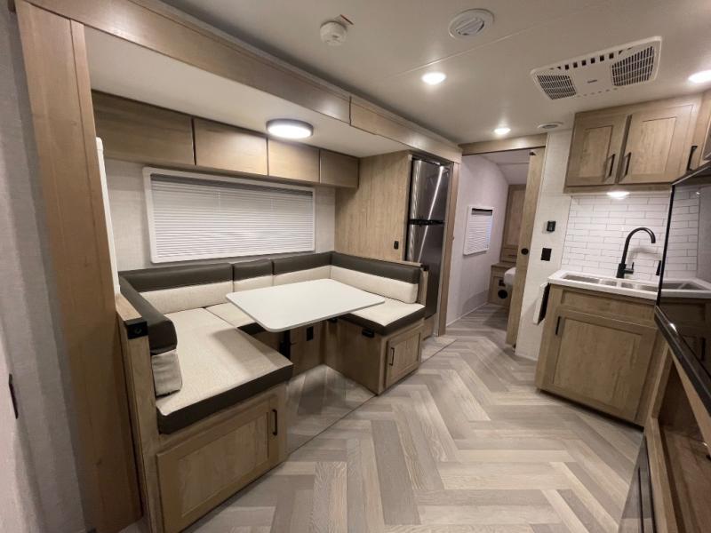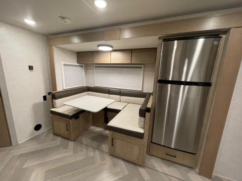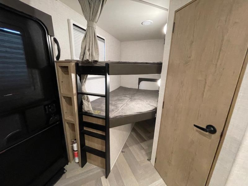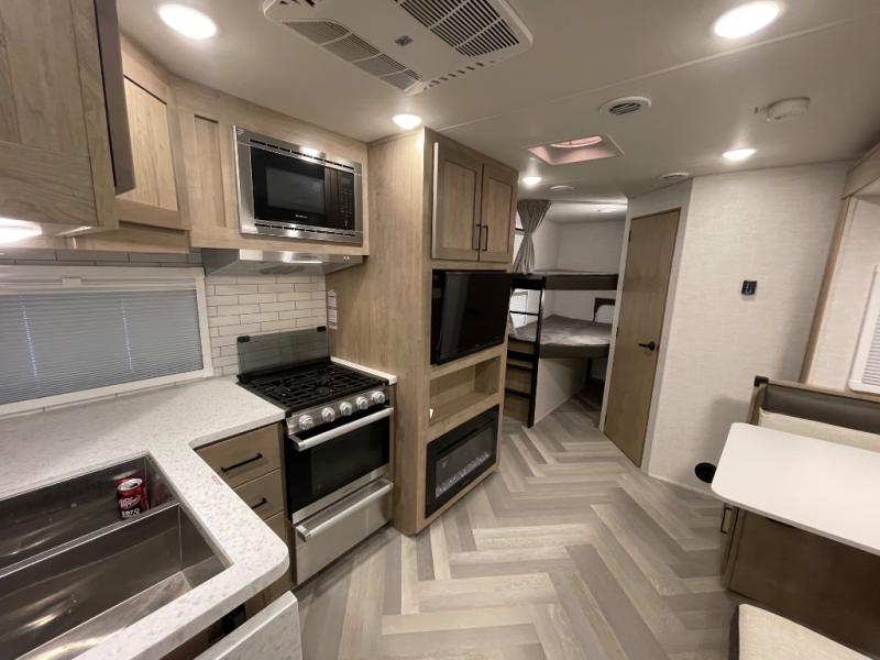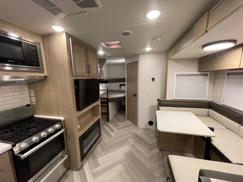 The whole family will love camping in this travel trailer! There is a set of double over double bunk beds with the lower bunk being able to fold for storage. You will have your own privacy with the front private bedroom which has a queen bed with a "Stargazer" skylight above it and one of the dual entry doors to the unit. The chef can prepare their best meals in the fully equipped kitchen with a flip-up countertop for even more prepping space. The U-shaped dinette with removable table not only provides a comfortable place to enjoy meals. but also to play games and transform into a sleeping space. Everyone can freshen up in the rear corner bathroom with the 30" x 34" shower. You could even add the optional outside kitchen to enjoy meals underneath the 21' electric awning with dimmable lights!