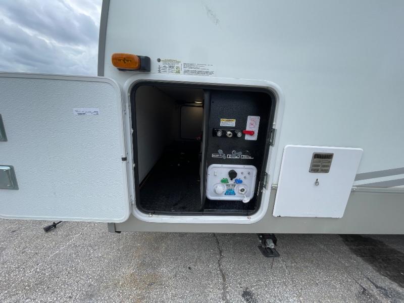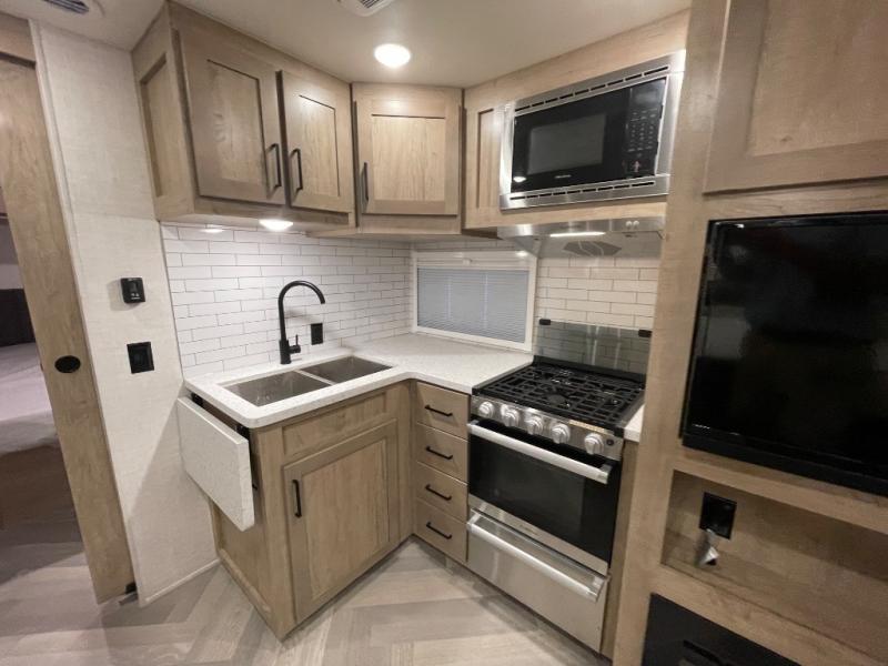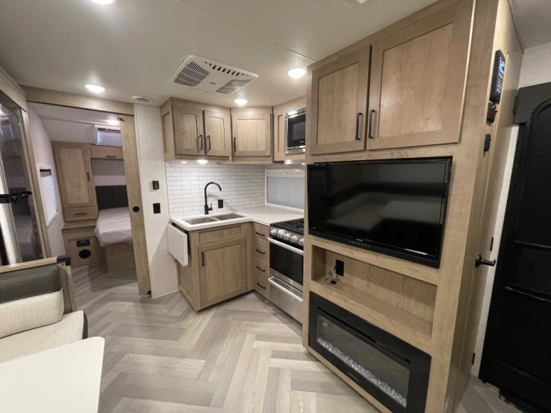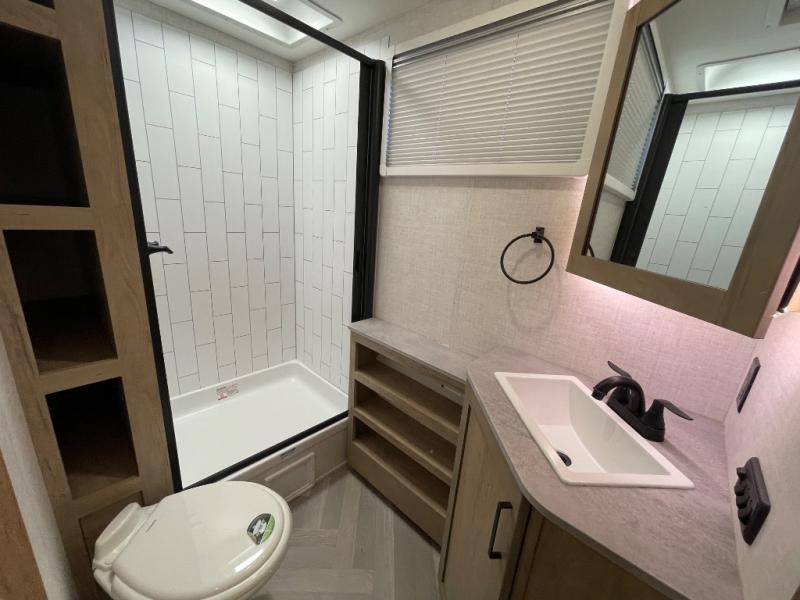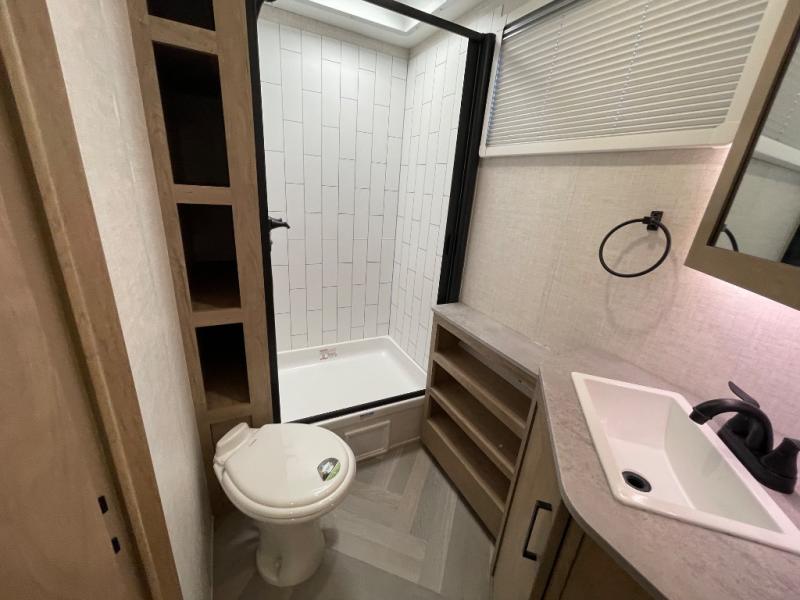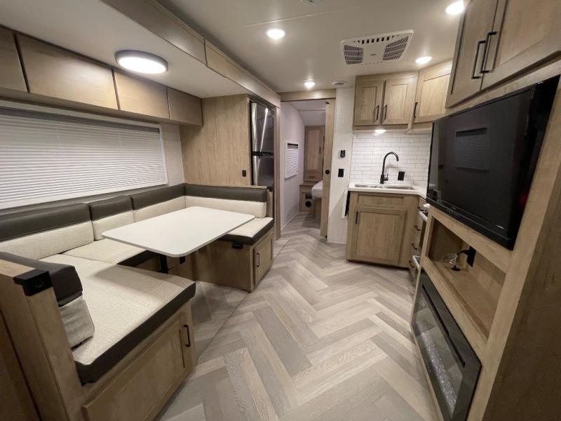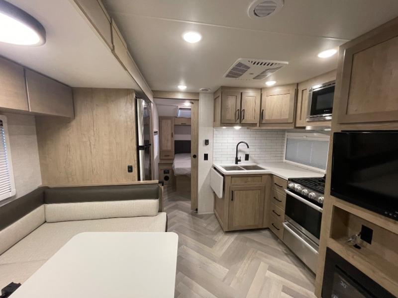 The whole family will love camping in this travel trailer! There is a set of double over double bunk beds with the lower bunk being able to fold for storage. You will have your own privacy with the front private bedroom which has a queen bed with a "Stargazer" skylight above it and one of the dual entry doors to the unit. The chef can prepare their best meals in the fully equipped kitchen with a flip-up countertop for even more prepping space. The U-shaped dinette with removable table not only provides a comfortable place to enjoy meals. but also to play games and transform into a sleeping space. Everyone can freshen up in the rear corner bathroom with the 30" x 34" shower. You could even add the optional outside kitchen to enjoy meals underneath the 21' electric awning with dimmable lights!