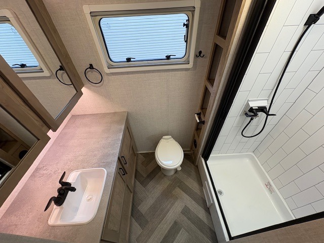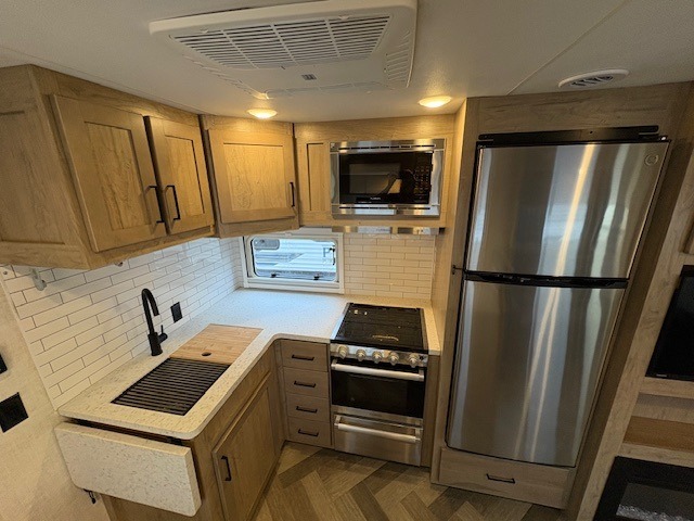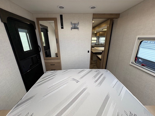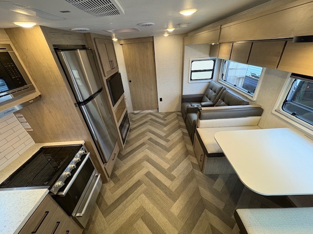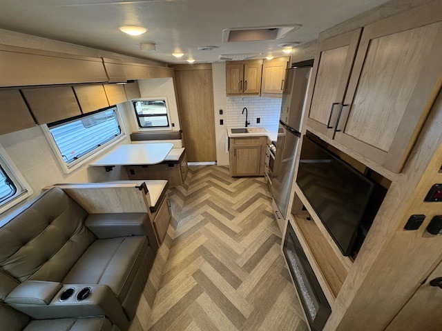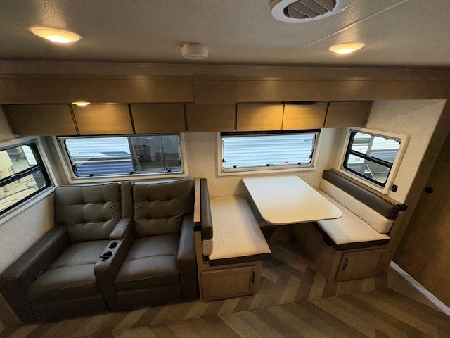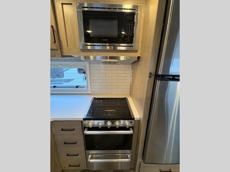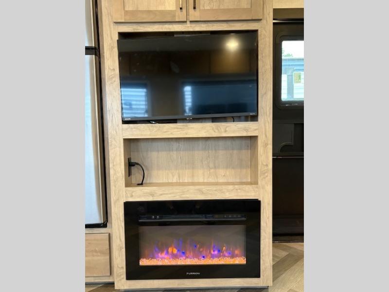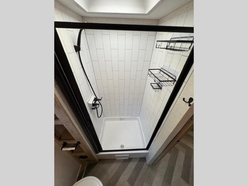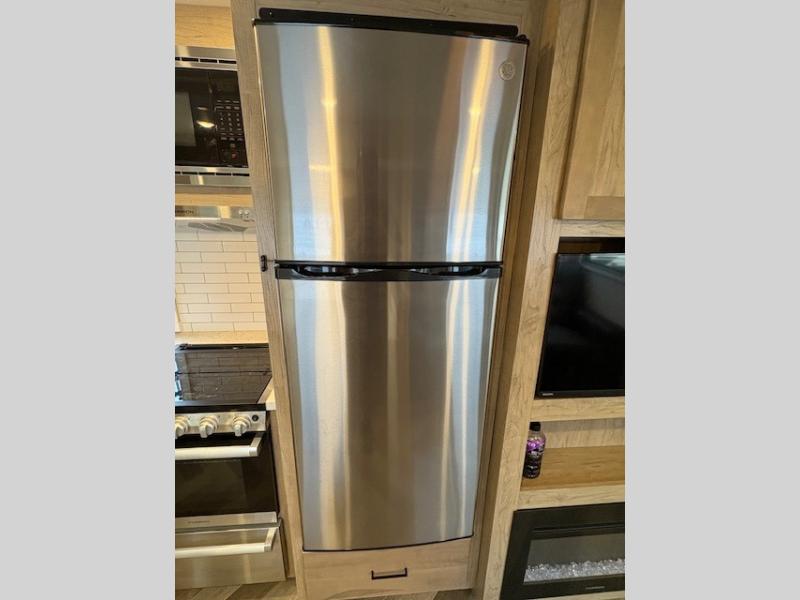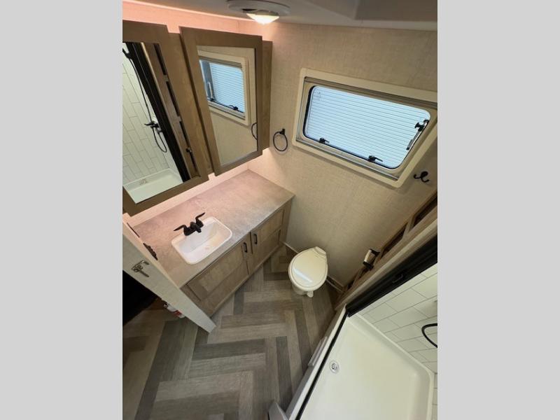 You won't want to camp any other way once you step inside this travel trailer! The front private bedroom will have you feeling right at home with the queen bed that has nightstands on either side and a "Stargazer" skylight above it, plus there is one of the dual entry doors to the unit so you can easily slip out for an early morning walk. After you get back, you can grab some eggs from the 12V refrigerator and fry them up on the three burner cooktop then eat them at the legless dinette or you can switch it out for an optional free standing table and chairs. The theater seating is directly across from the 12V LED HDTV and can also be switched out for an optional hide-a-bed sofa. Clean up in the full bathroom with the 30" x 36" shower after a fun filled day outdoors!