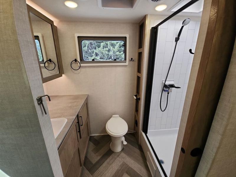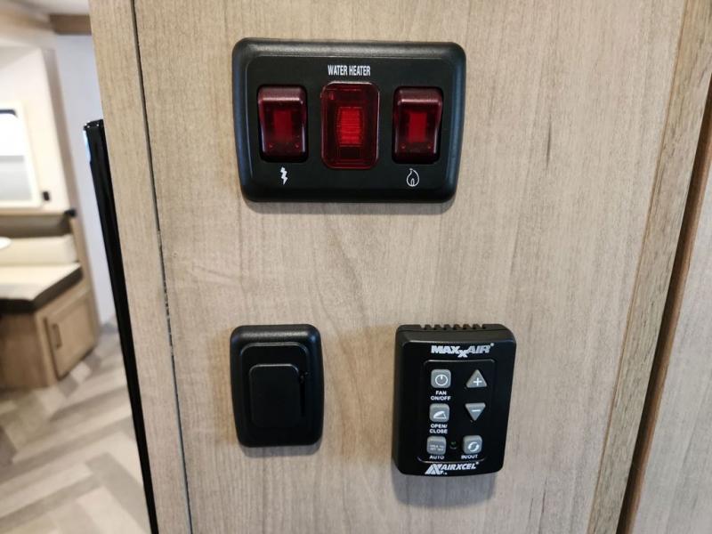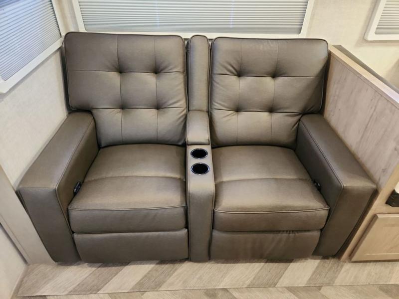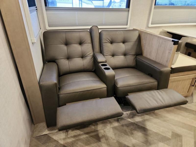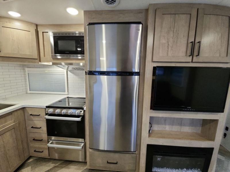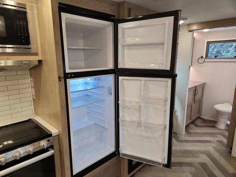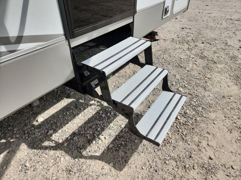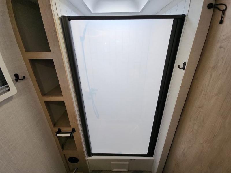 You won't want to camp any other way once you step inside this travel trailer! The front private bedroom will have you feeling right at home with the queen bed that has nightstands on either side and a "Stargazer" skylight above it, plus there is one of the dual entry doors to the unit so you can easily slip out for an early morning walk. After you get back, you can grab some eggs from the 12V refrigerator and fry them up on the three burner cooktop then eat them at the legless dinette or you can switch it out for an optional free standing table and chairs. The theater seating is directly across from the 12V LED HDTV and can also be switched out for an optional hide-a-bed sofa. Clean up in the full bathroom with the 30" x 36" shower after a fun filled day outdoors!