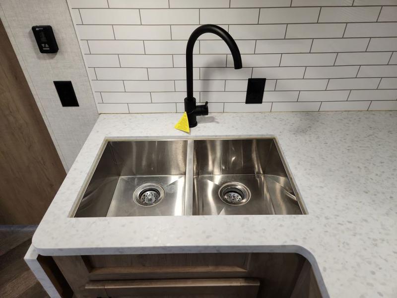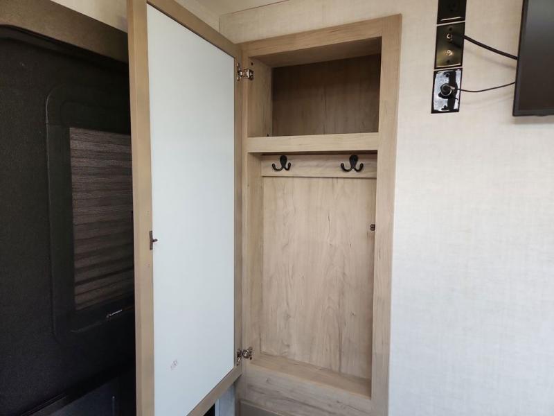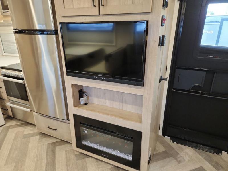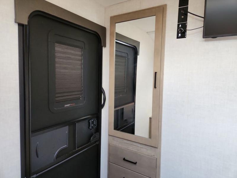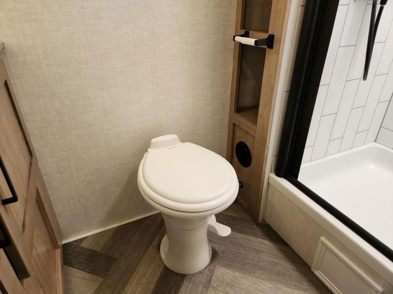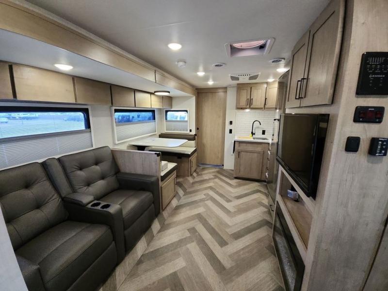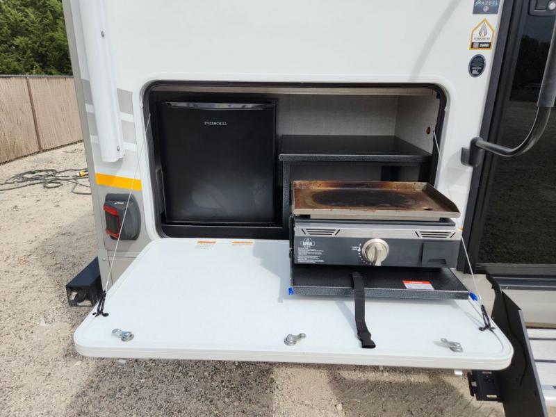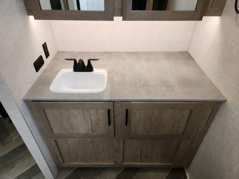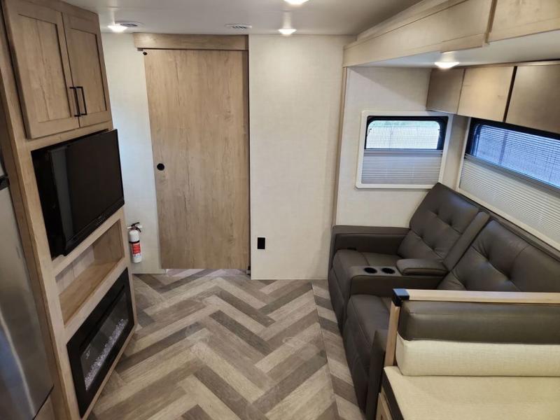 You won't want to camp any other way once you step inside this travel trailer! The front private bedroom will have you feeling right at home with the queen bed that has nightstands on either side and a "Stargazer" skylight above it, plus there is one of the dual entry doors to the unit so you can easily slip out for an early morning walk. After you get back, you can grab some eggs from the 12V refrigerator and fry them up on the three burner cooktop then eat them at the legless dinette or you can switch it out for an optional free standing table and chairs. The theater seating is directly across from the 12V LED HDTV and can also be switched out for an optional hide-a-bed sofa. Clean up in the full bathroom with the 30" x 36" shower after a fun filled day outdoors!