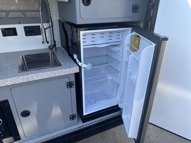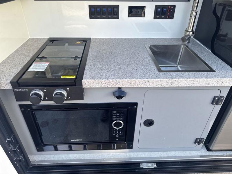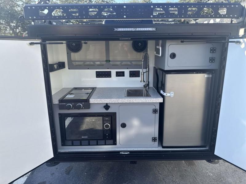 You will be so excited to test out this ROG travel trailer for yourself! The interior has great storage solutions with a front and rear recessed overhead cabinets, a storage closet with two shelves, and two storage nets for more gear. There are four LED ceiling lights to keep the interior bright, and you will appreciate two LED reading lights as you rest on the 60" x 80" futon/mattress. The rear outdoor kitchen has convenient amenities to help you eat well while you're away. You'll find a two-burner stove with cast-iron grates, a flush-mount microwave oven, a solid-surface countertop, and commercial-style faucet, plus a 12V 3.3-cubic foot refrigerator to keep your perishables nice and cold.