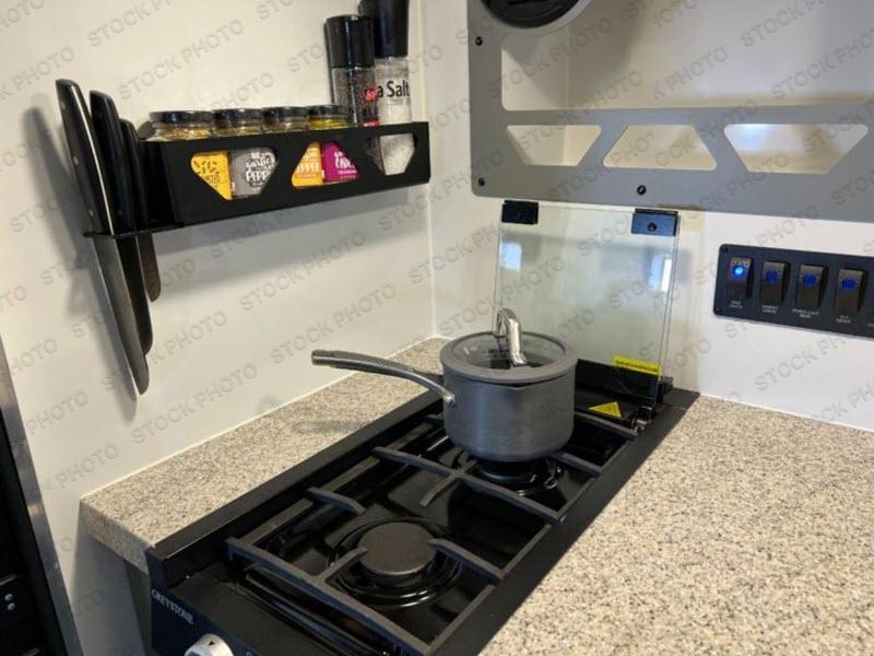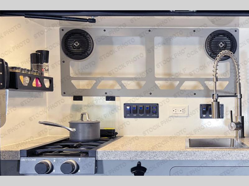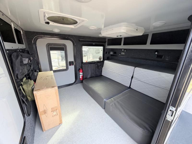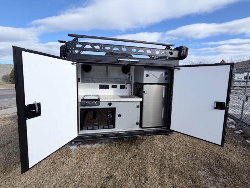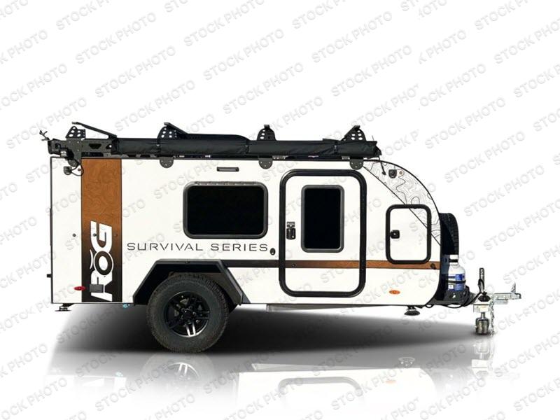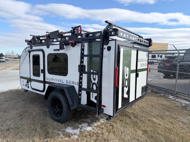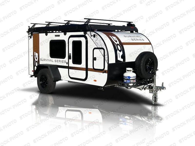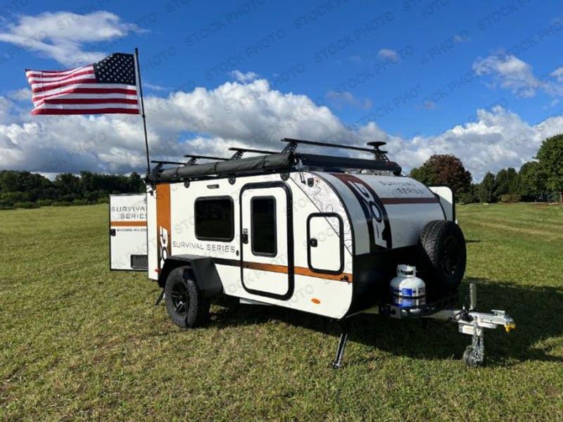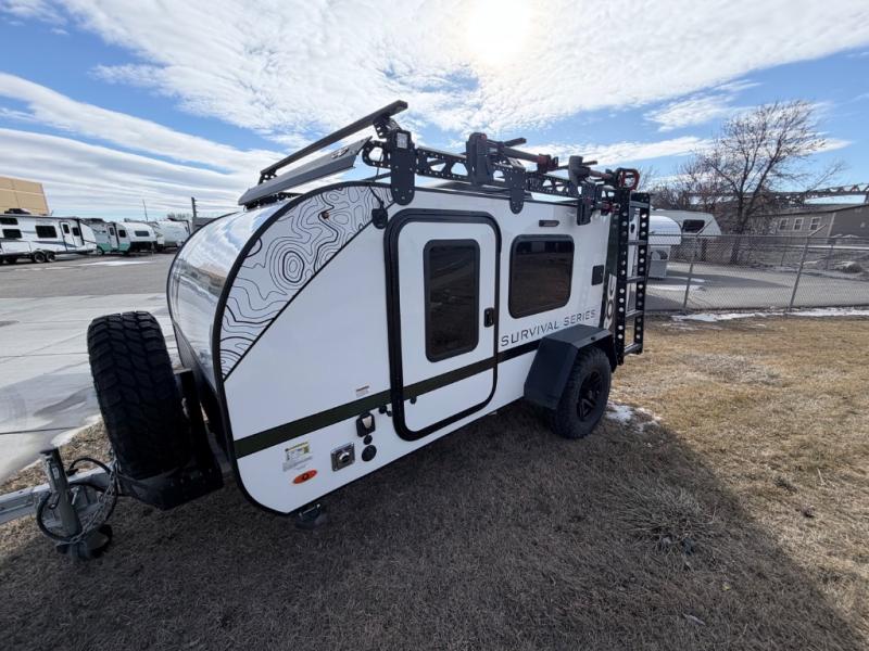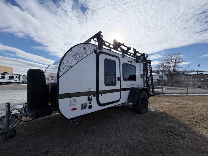 You'll be ready for anything in the 12RKSS Survival Series travel trailer! The rugged Survival Series upgrades make it suitable for the most extreme adventures, but you'll still love the comfortable living space, with amenities like a queen futon/mattress, AM/FM Bluetooth stereo, and tons of storage space. Outside you'll find a fully-equipped kitchen, with a removable table, 25" LP griddle, two burner cooktop, 3.3 cu. ft. refrigerator, and a stainless steel sink. The optional Power-Up package adds a 200-watt portable solar panel, 12V lithium battery, and two extra battery trays so you will be prepared to go truly off-grid.
