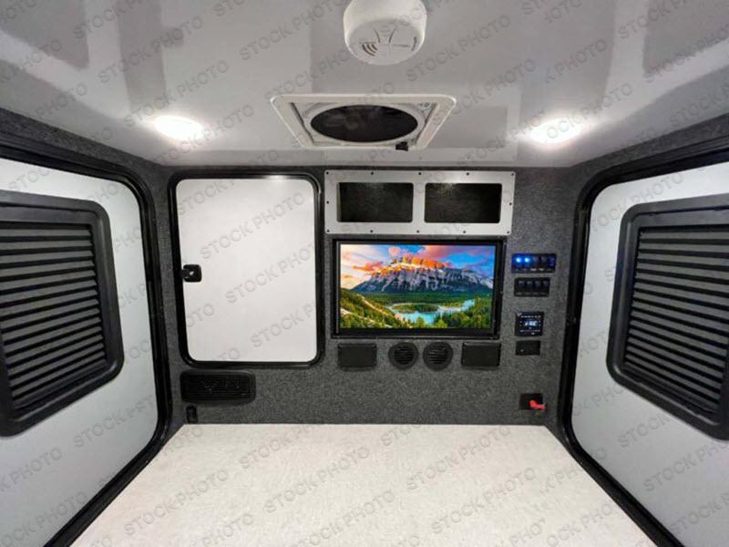 The Encore RV ROG Survival Series travel trailers offers tons of extra features for those who want to take on tougher terrain. The exterior is equipped with useful tools like an off-grid ladder, a splitting axe and a chopping axe, and an overland shovel. The roof rack has four crossbars and can carry up to 400 lbs, and a pair of flood lights are mounted there as well. Custom Survival Series graphics also set this one apart, and the standard flag bracket with mount and pole can be equipped with an American or Canadian flag. A 32" TV is mounted on an articulating and locking mount so it stays in place no matter where you go. And for some extra bonus items, you will love the LifeStraw personal water filtration system, first aid kit, and the Survival Hacks book, which will surely come in handy!