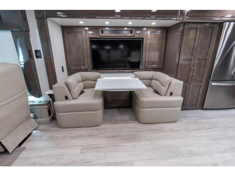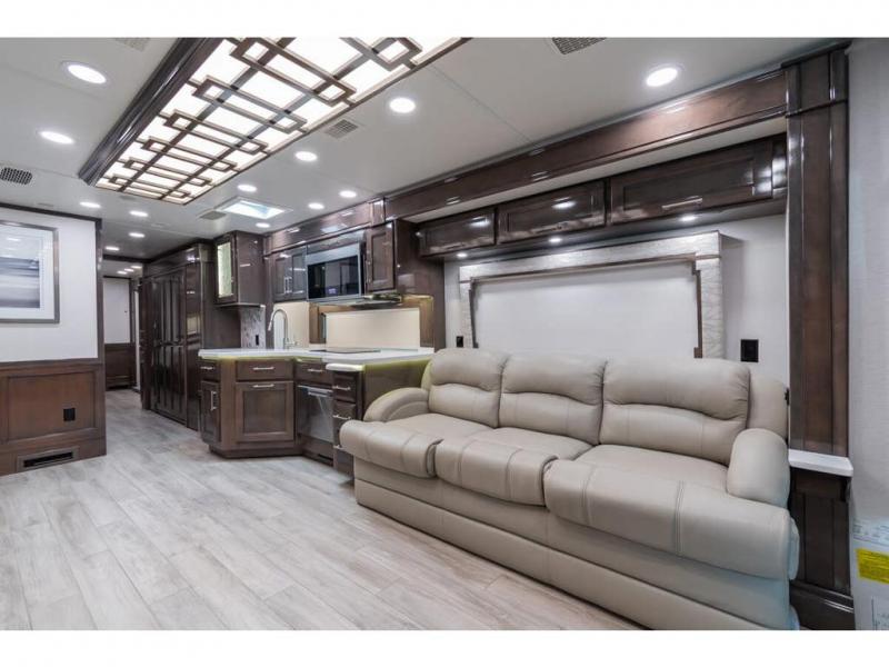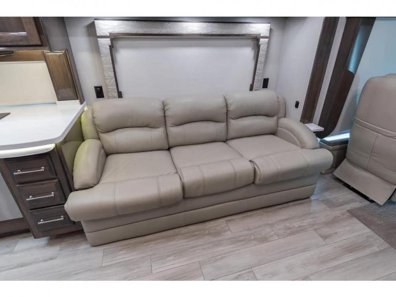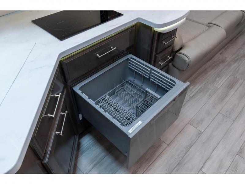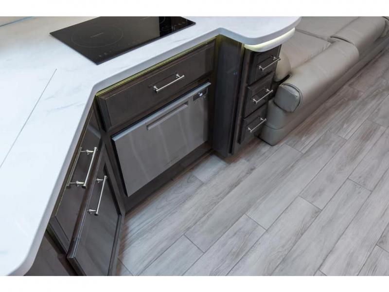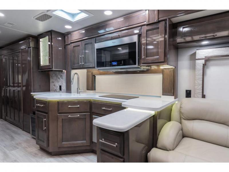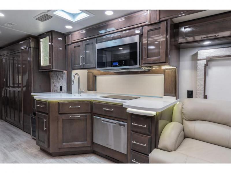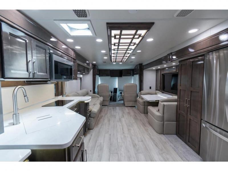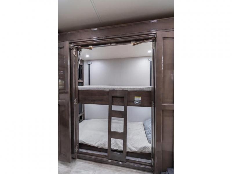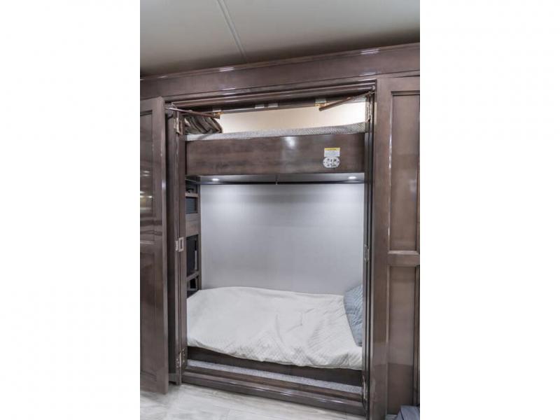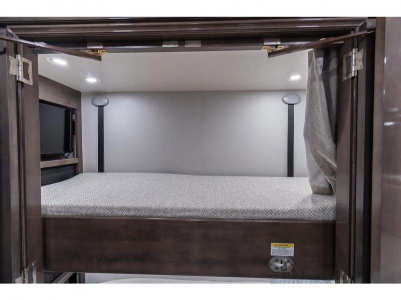 Your search for a family-friendly coach is over with this Aspire 44R! The power bunks include their own 24" TV's, and one of the full baths is right across from the bunks for convenience. You will enjoy the master bedroom all to yourselves with a king bed slide out, a 32" TV, and your own full rear bath with a spacious bath wardrobe. The kitchen is any chef's dream kitchen with its two burner induction cooktop, stainless steel residential refrigerator, two pantries, plus an additional refrigerator/cooler for drinks! This model also includes a hide-a-bed sofa for even more sleeping space, or you can add the optional power theater seating.