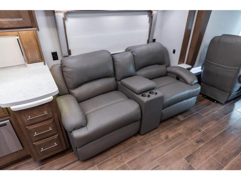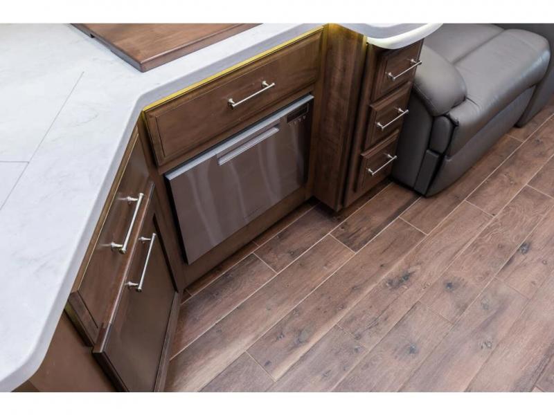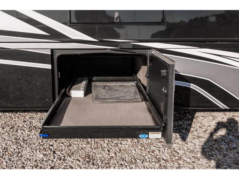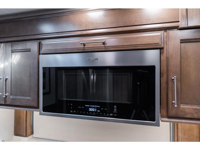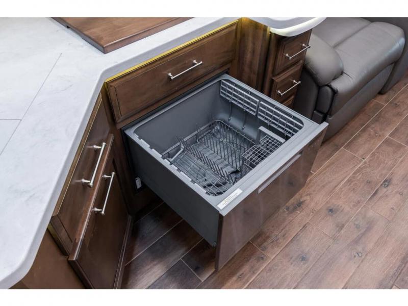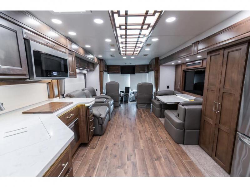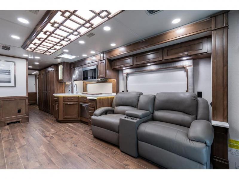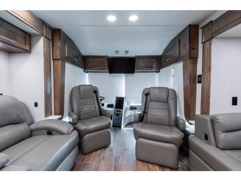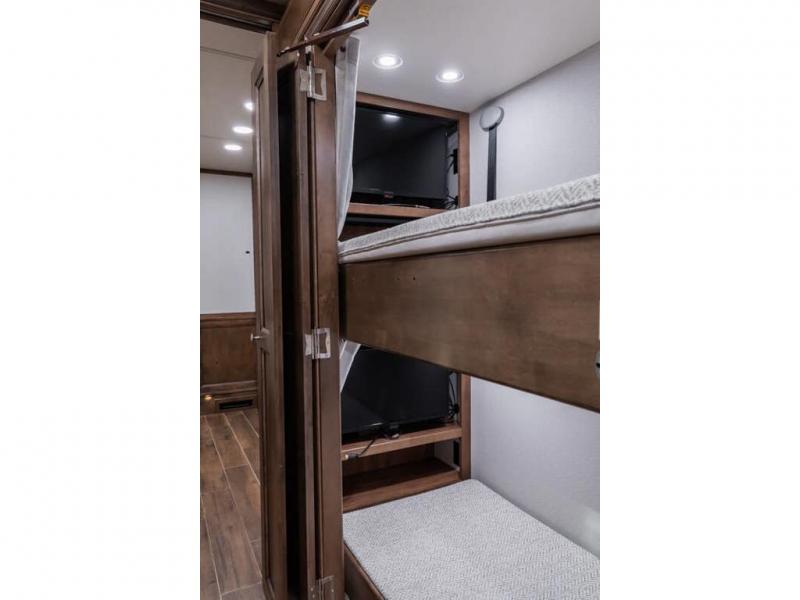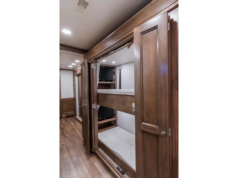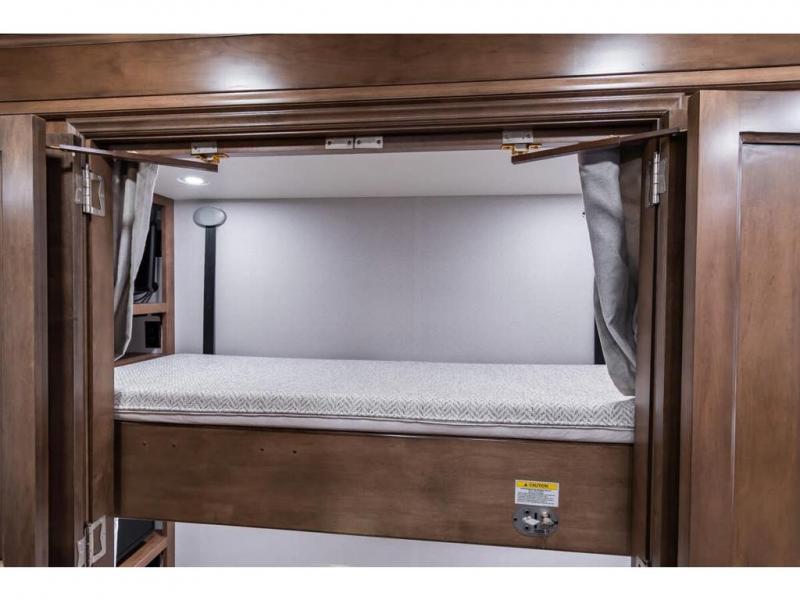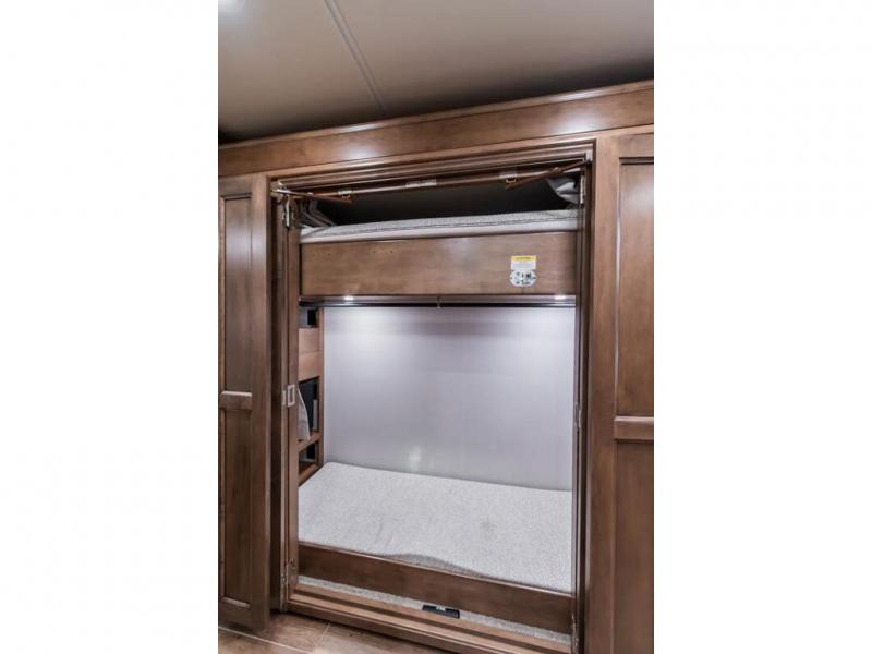 Your search for a family-friendly coach is over with this Aspire 44R! The power bunks include their own 24" TV's, and one of the full baths is right across from the bunks for convenience. You will enjoy the master bedroom all to yourselves with a king bed slide out, a 32" TV, and your own full rear bath with a spacious bath wardrobe. The kitchen is any chef's dream kitchen with its two burner induction cooktop, stainless steel residential refrigerator, two pantries, plus an additional refrigerator/cooler for drinks! This model also includes a hide-a-bed sofa for even more sleeping space, or you can add the optional power theater seating.