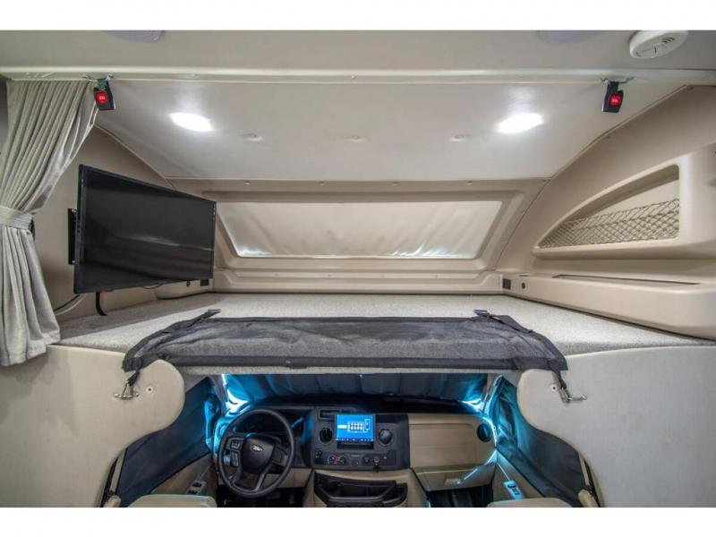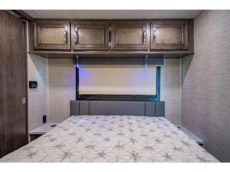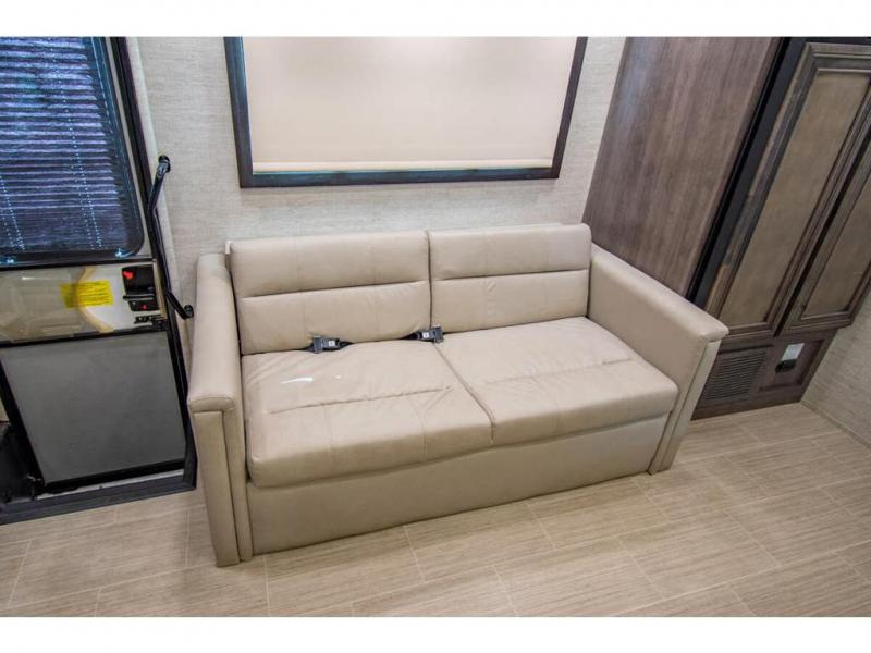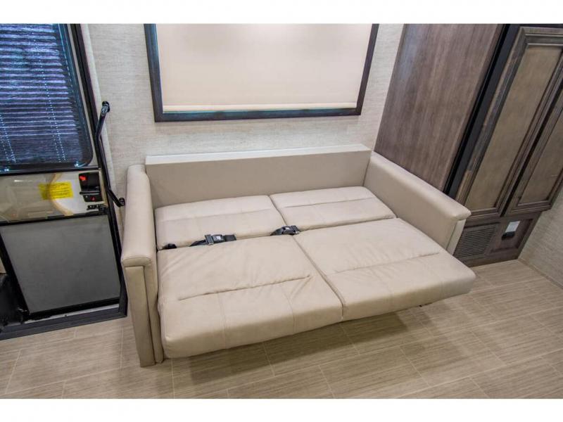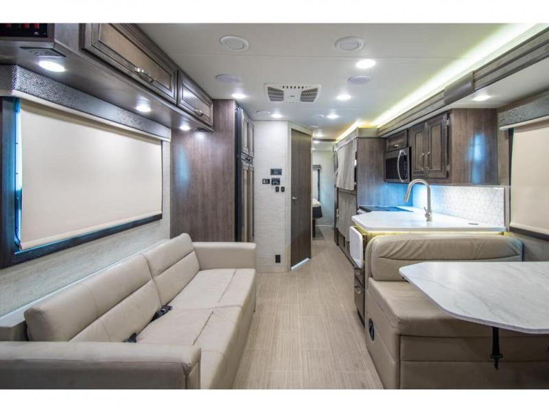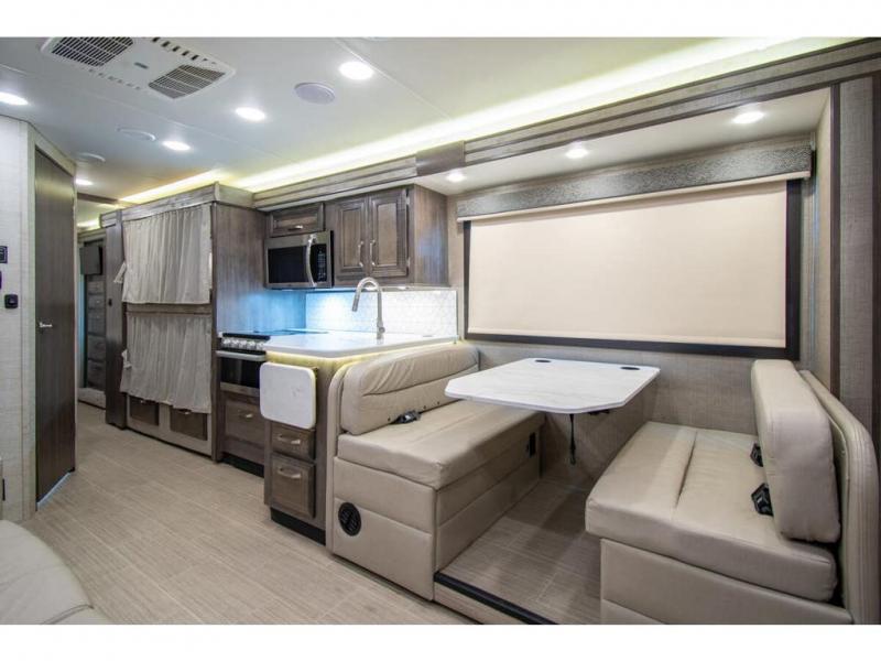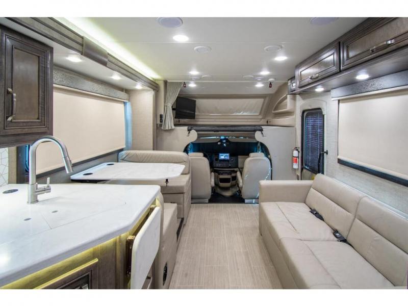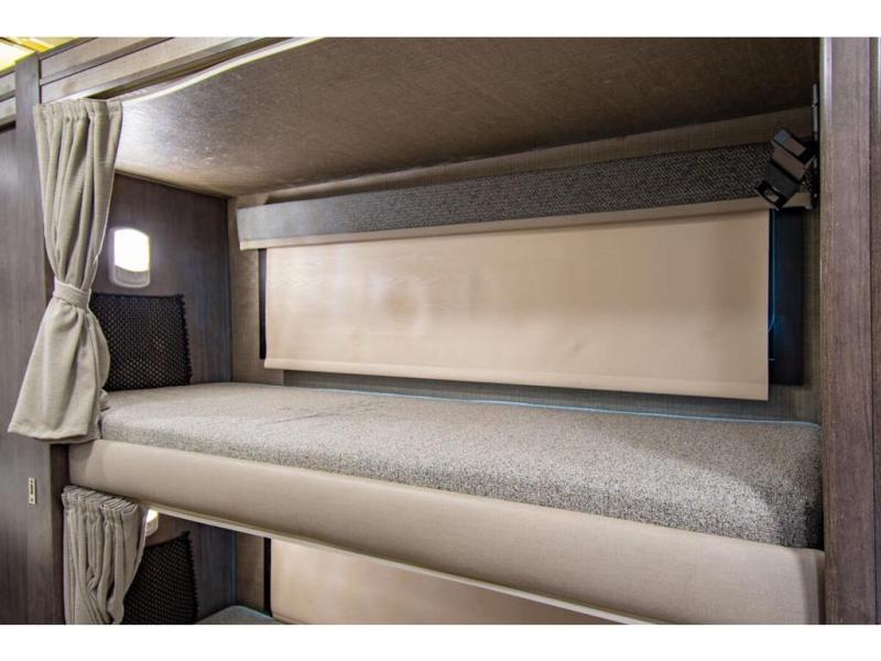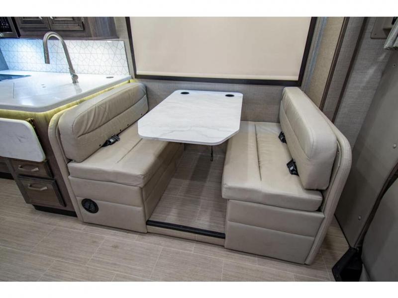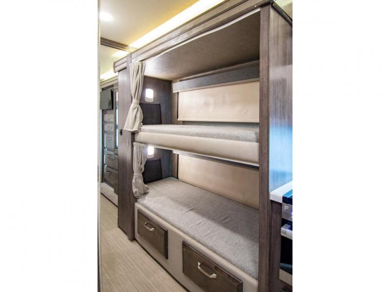 The whole family can travel together in this motorhome! The kiddos can sleep on the set of bunk beds and you can sleep on the 60" x 74" queen bed in the rear private bedroom. Everyone can easily access the dual entry bathroom to freshen up in the 32" radius shower each morning. Cook up delicious meals on the three burner cooktop, then head to the booth dinette which can also transform into an extra sleeping space. You can take an afternoon nap on the sofa or head outdoors to watch the big game at the exterior LED HD Smart TV underneath the 18' electric awning with LED lights to highlight the good times!