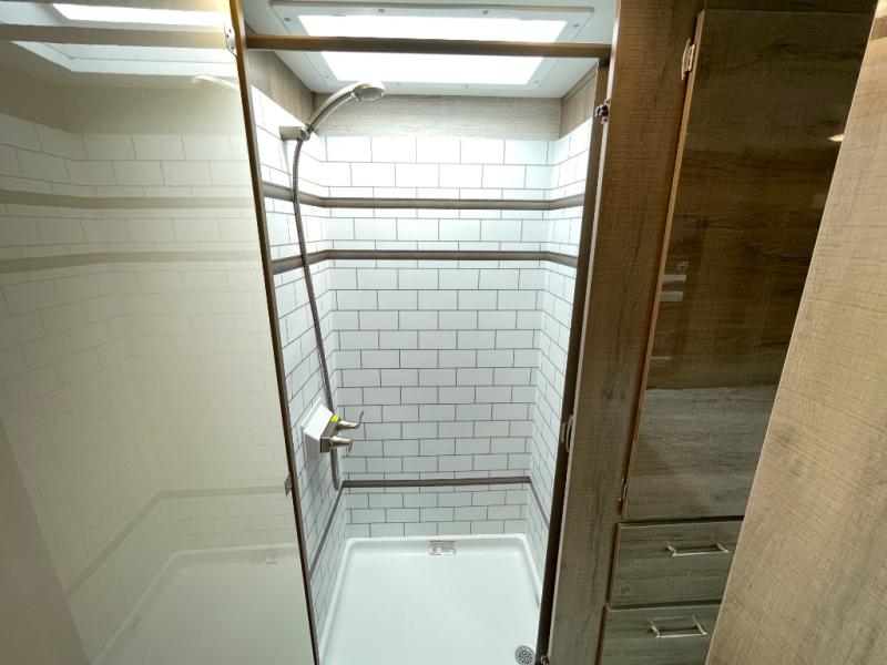 You will love the versatility of this coach that can sleep three to four people each night. The rear L-shaped sofa allows you to relax during the day, and the Murphy bed here provides a comfortable bed at night. The private toilet and sink is right across from the 24" x 32" shower so two people can freshen up at the same time. The kitchen includes everything you need to prepare meals, including a stainless steel convection microwave and a stainless steel sink with a wooden cover/cutting board. The swivel seats allow you to enjoy your morning coffee while watching news on the living room LED TV, and the little ones will love climbing up in the cab-over bunk!