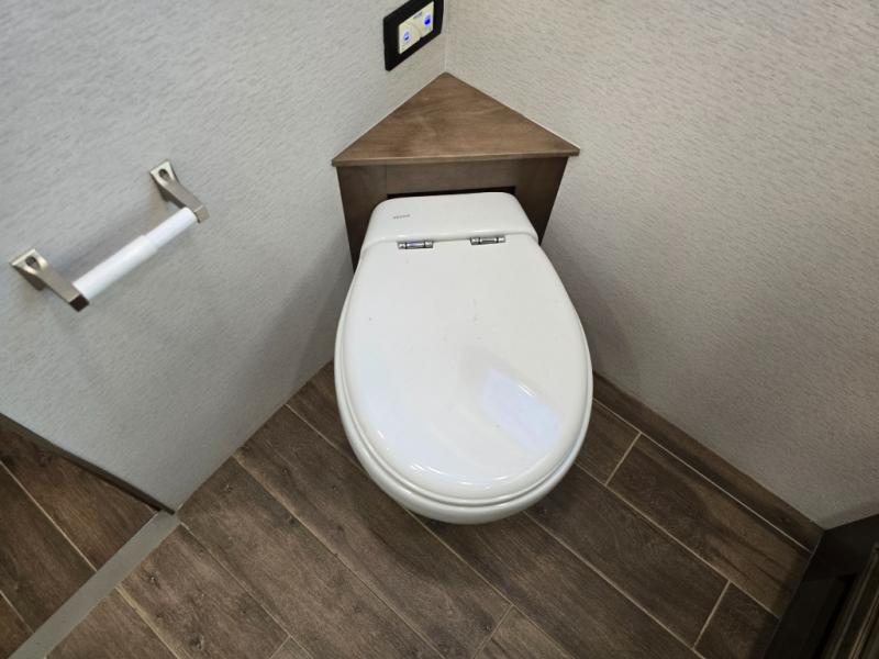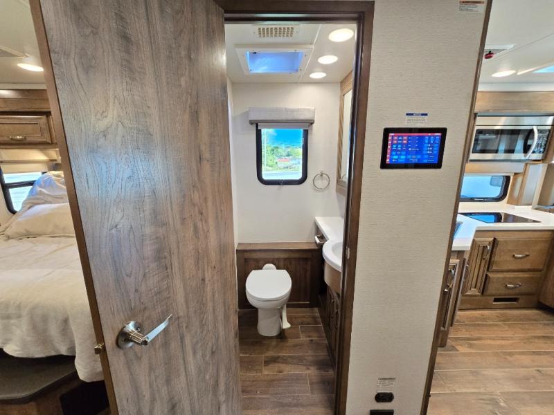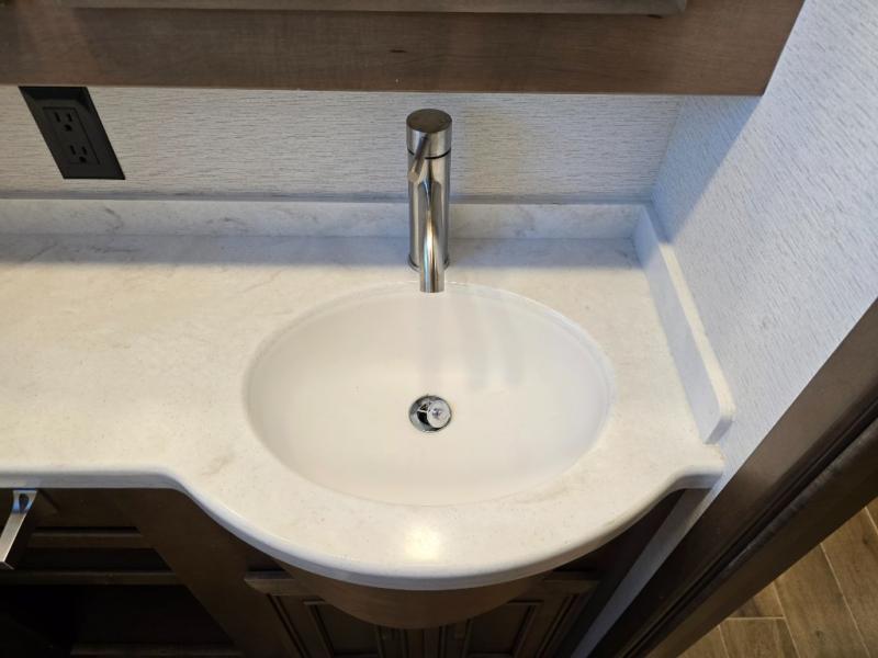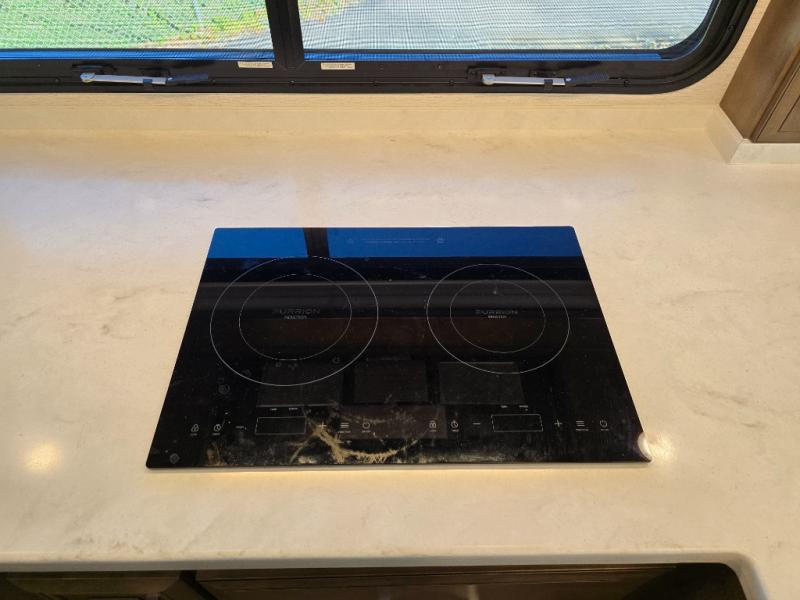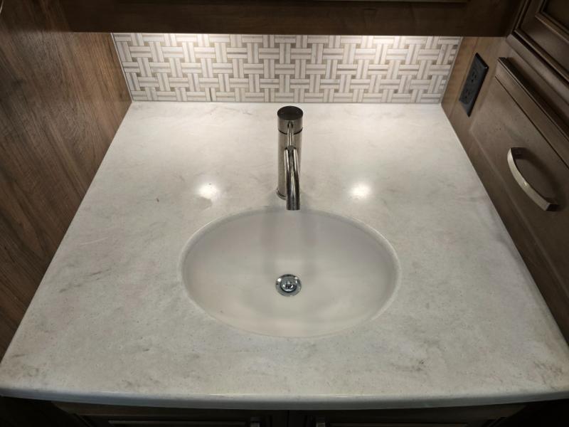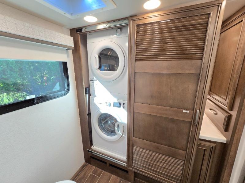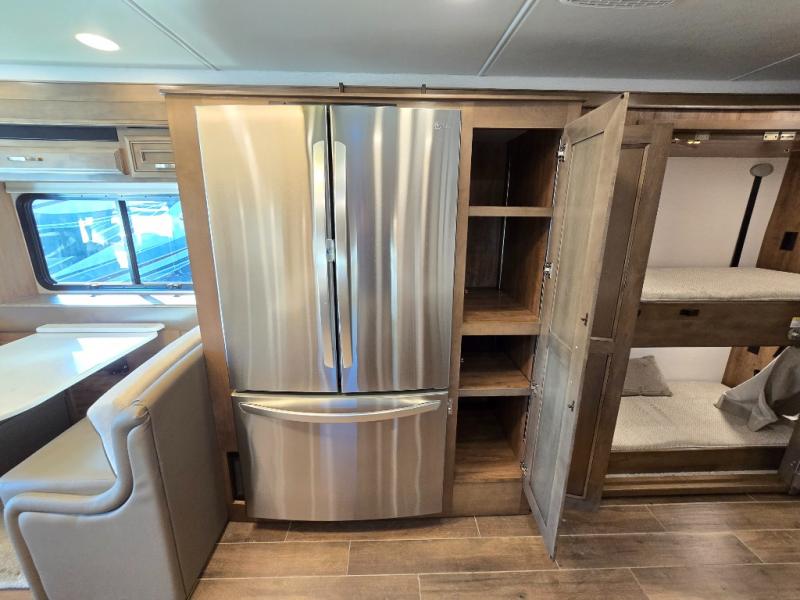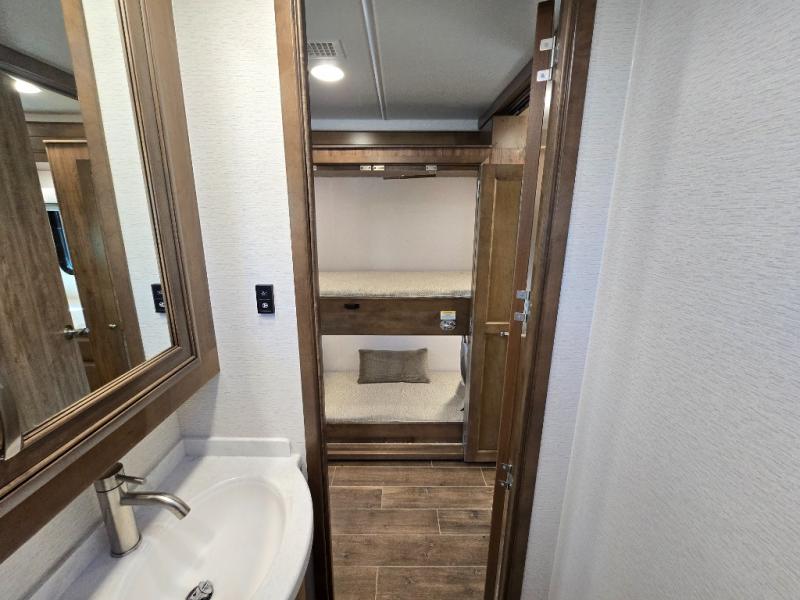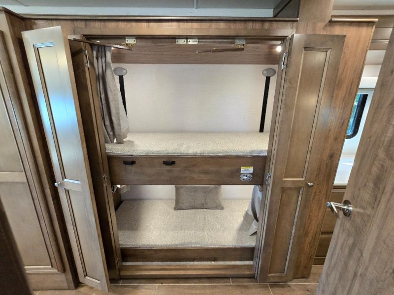 You can comfortably sleep seven to eight people in this spacious coach thanks to the power bunk beds across from the half bath, the power head lift king bed, plus the tri-fold sofa and booth dinette within the main living area. You'll find the full rear bath to be convenient with its large linen closet and separate washer and dryer, plus there is a one-piece fiberglass shower with a skylight for more standing space. The chef of your group will love cooking in this Reatta XL kitchen that includes a two burner induction cooktop, a convection microwave oven, plus a plenty of overhead cabinets and a pantry for snacks. Since there is a 50" Samsung 4K UHD Smart TV in the living area, you can make it a movie night, or head outdoors to relax under the Carefree power awnings!
