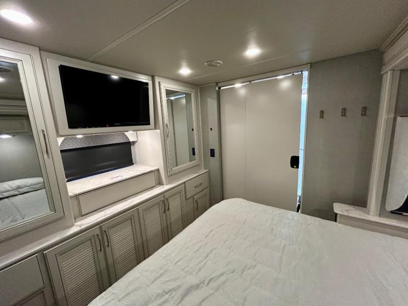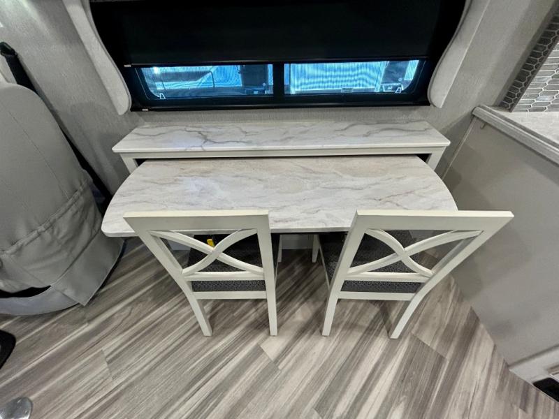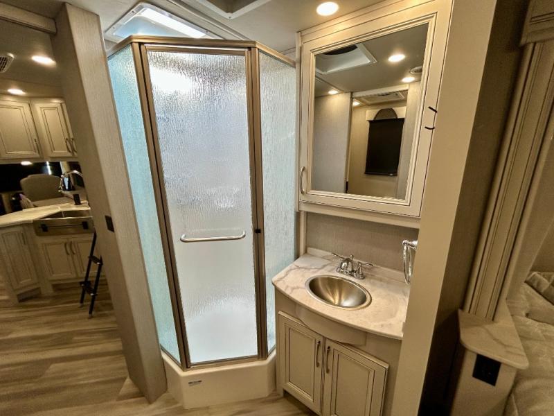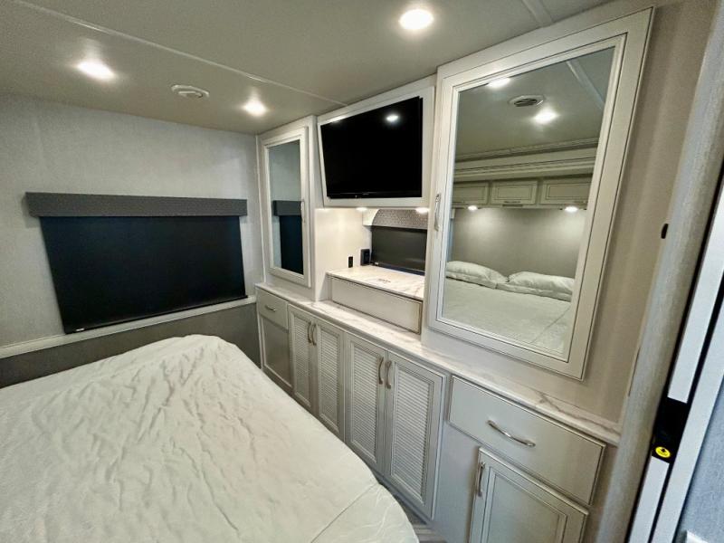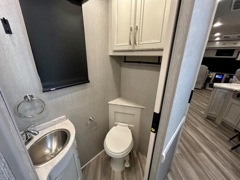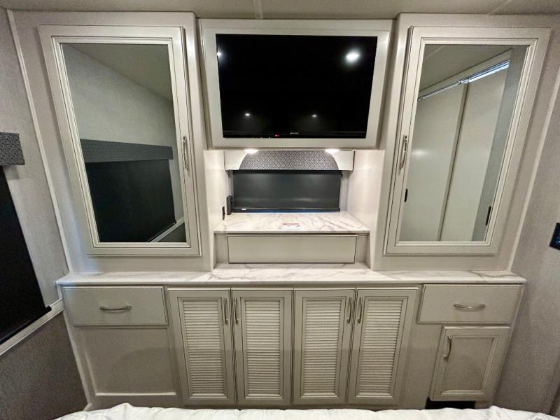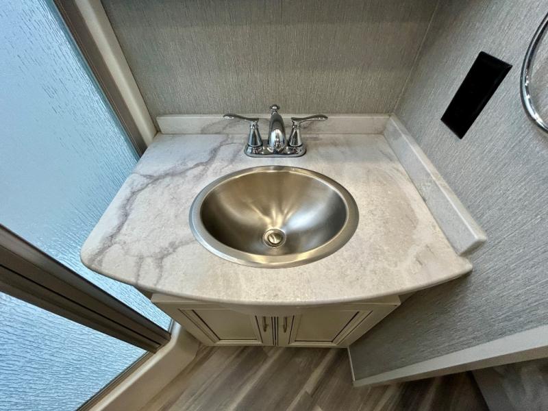 Looking for a spacious RV with a mid-coach entry, four distinct areas, and offers a way to work while on the road plus be able to host a dinner party for friends and family? This Bounder gives you all that and so much more like a stainless steel farmhouse sink, a solid surface top in the galley, and full extension drawer guides with latches, plus full amenities to make any meals including a convection microwave and residential refrigerator. The split bathroom is super convenient when trying to get ready in the mornings. One person can be washing their hands in the private sink and toilet room while another person can be using the second sink beside the neo-angled shower. Yet you can also close two sliding doors to make this one big bathroom for yourself. And the multi-purpose Adapt-table dinette allows you to work or eat breakfast for two, and you can easily swing the table out vertically to host four. The rear bedroom offers a slide out king bed, plus plenty of storage and an LED TV to watch before falling asleep. If you like to host overnight guests, the jack knife sofa is available.