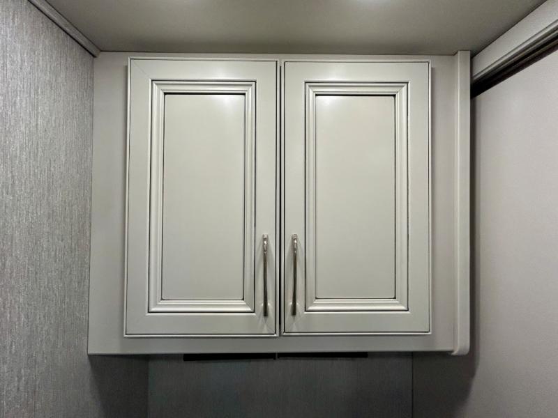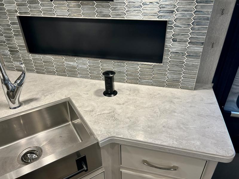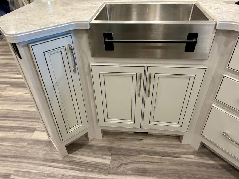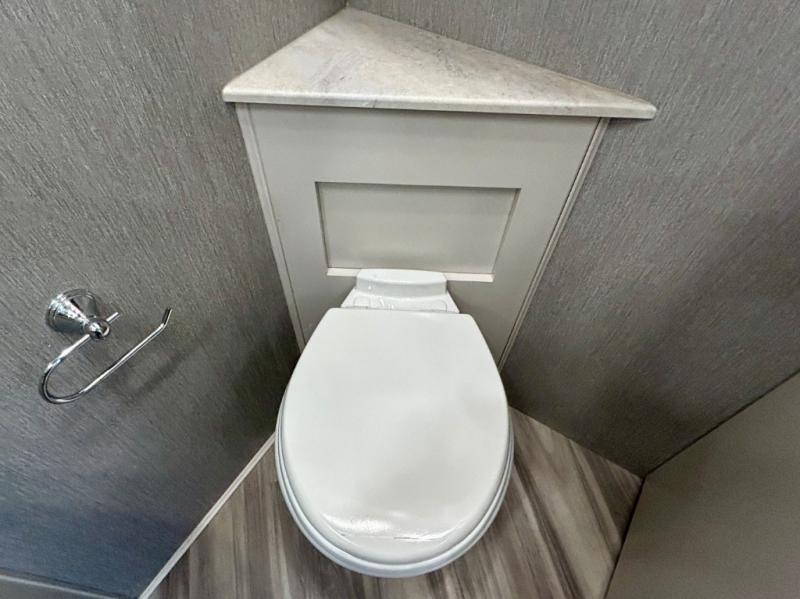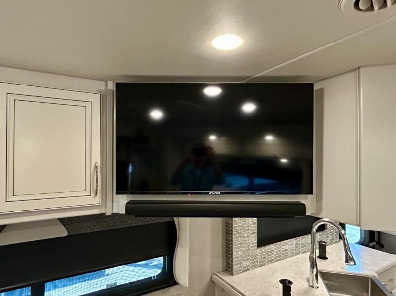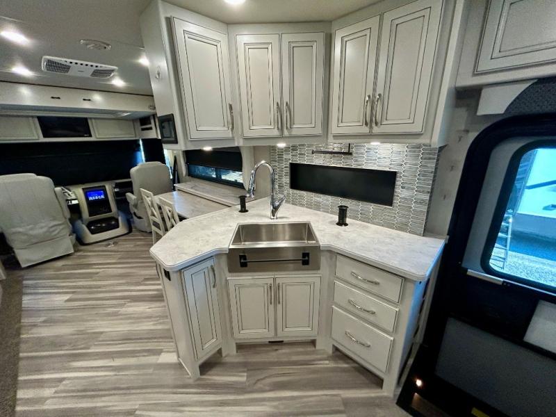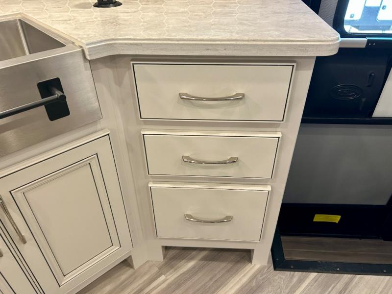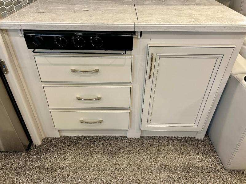 Looking for a spacious RV with a mid-coach entry, four distinct areas, and offers a way to work while on the road plus be able to host a dinner party for friends and family? This Bounder gives you all that and so much more like a stainless steel farmhouse sink, a solid surface top in the galley, and full extension drawer guides with latches, plus full amenities to make any meals including a convection microwave and residential refrigerator. The split bathroom is super convenient when trying to get ready in the mornings. One person can be washing their hands in the private sink and toilet room while another person can be using the second sink beside the neo-angled shower. Yet you can also close two sliding doors to make this one big bathroom for yourself. And the multi-purpose Adapt-table dinette allows you to work or eat breakfast for two, and you can easily swing the table out vertically to host four. The rear bedroom offers a slide out king bed, plus plenty of storage and an LED TV to watch before falling asleep. If you like to host overnight guests, the jack knife sofa is available.