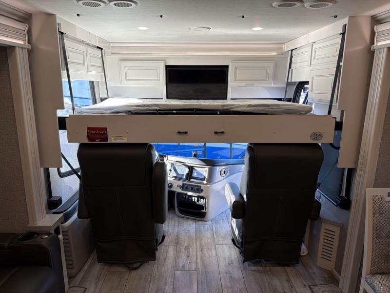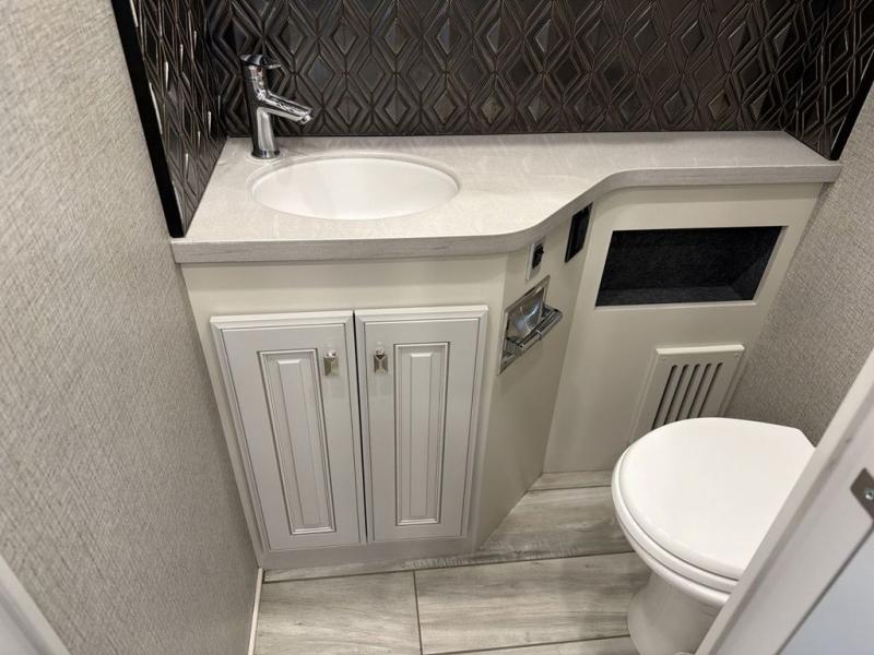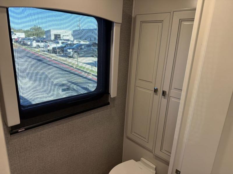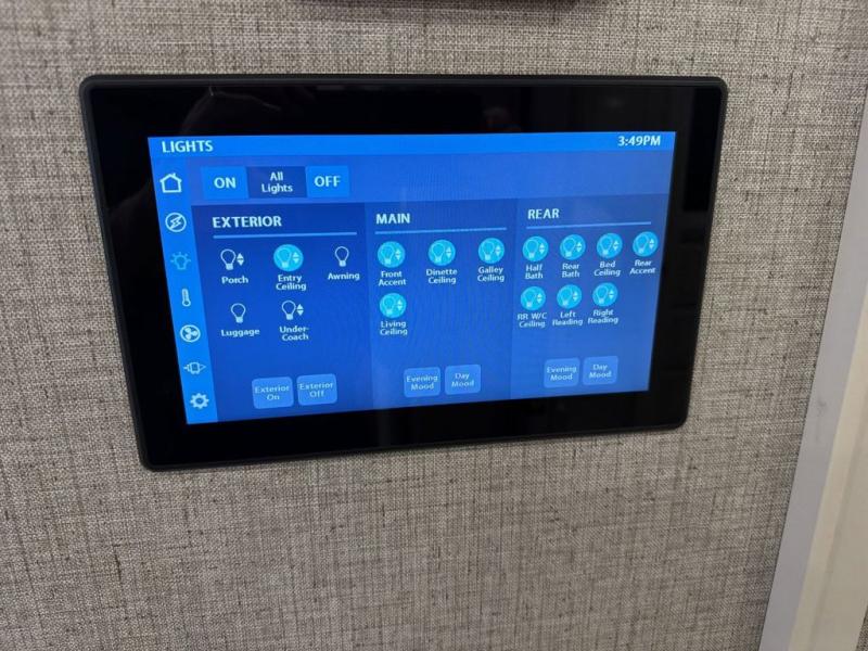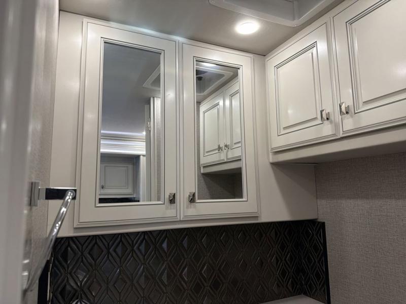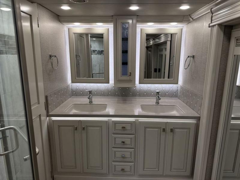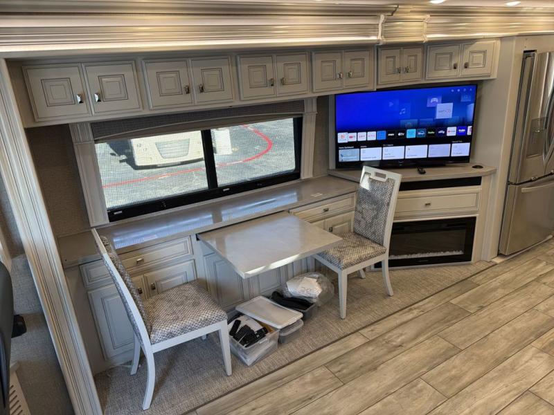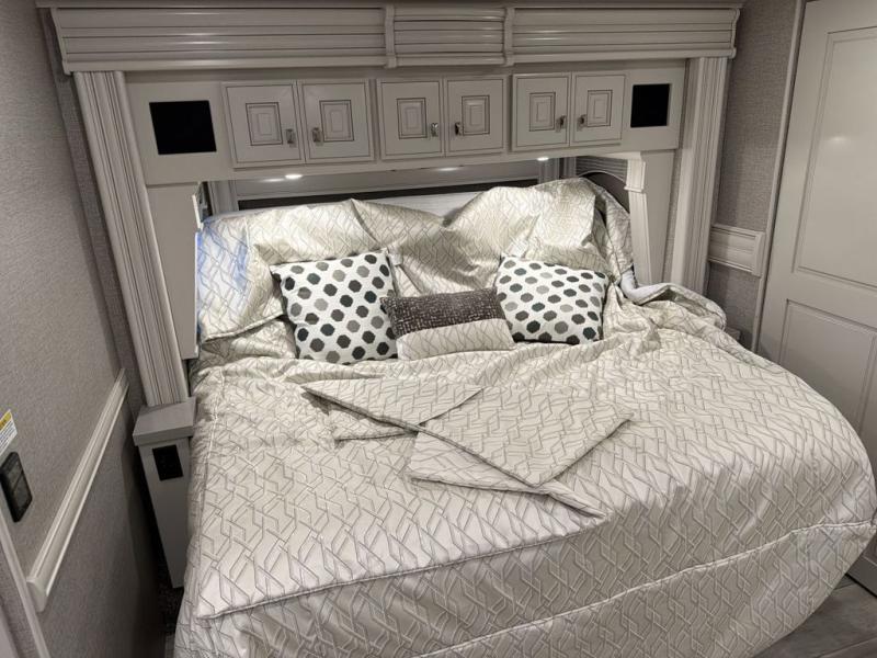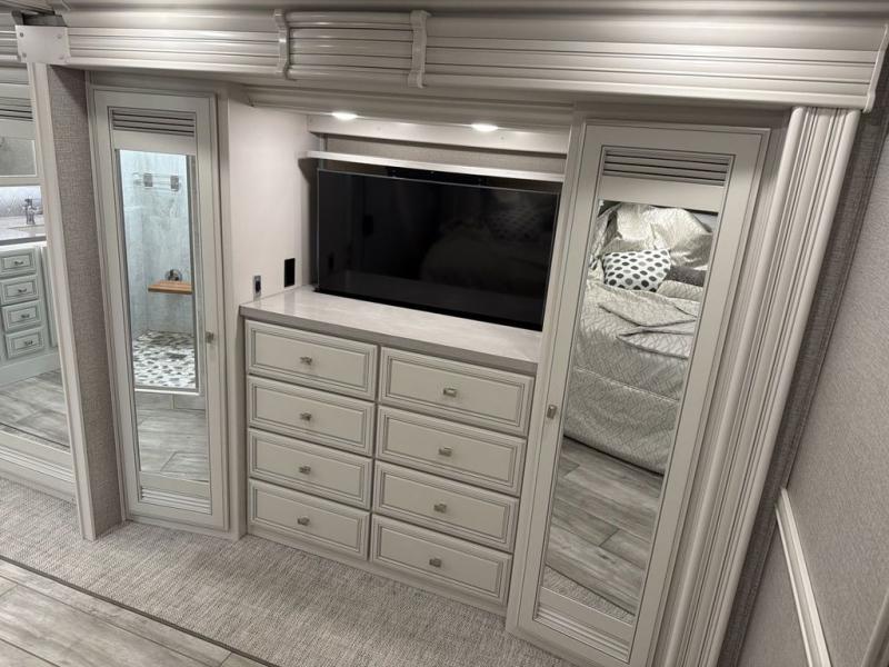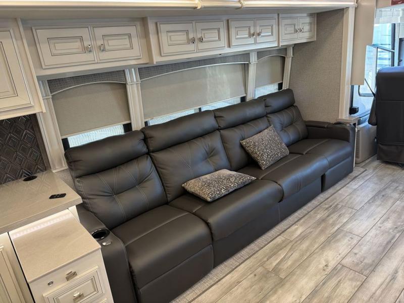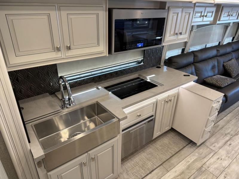 Going full-time has never been easier than in this coach with four slides, a bath and a half, and a huge master suite! You can wake up each morning in your king bed slide out, and catch up on the news with your 43" pop-up LED TV. The rear bath includes a dual sink vanity so you both can get ready at the same time, and there is even a private lavy for convenience. The master suite also includes a hanging wardrobe storage with a washer and dryer to make wash day a breeze. Head to the main living area to make breakfast on the two burner induction cooktop, or use the convection microwave. There is a residential refrigerator with ice and water in the door, plus a dishwasher drawer for added convenience. Your crew will love to relax on the power motion lounges that sit on either side of the sofa sleeper with full mattress, and there is a free-standing dinette with Credenza for your morning cup of joe!