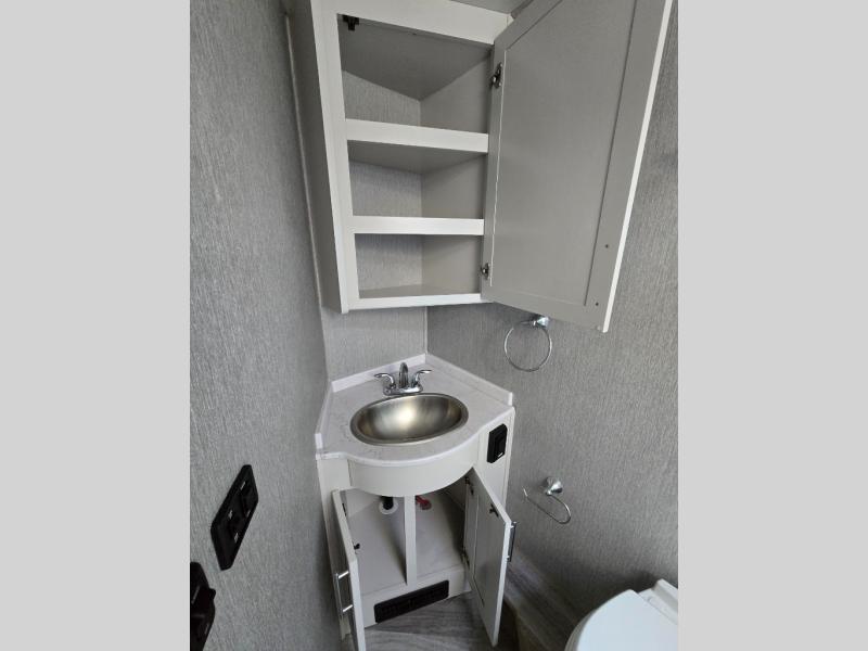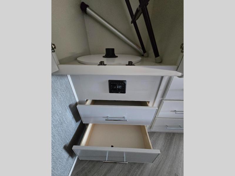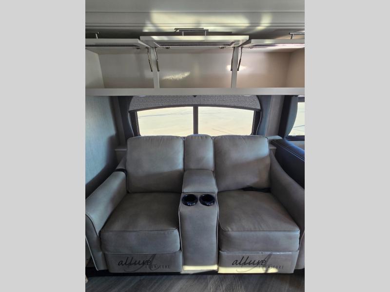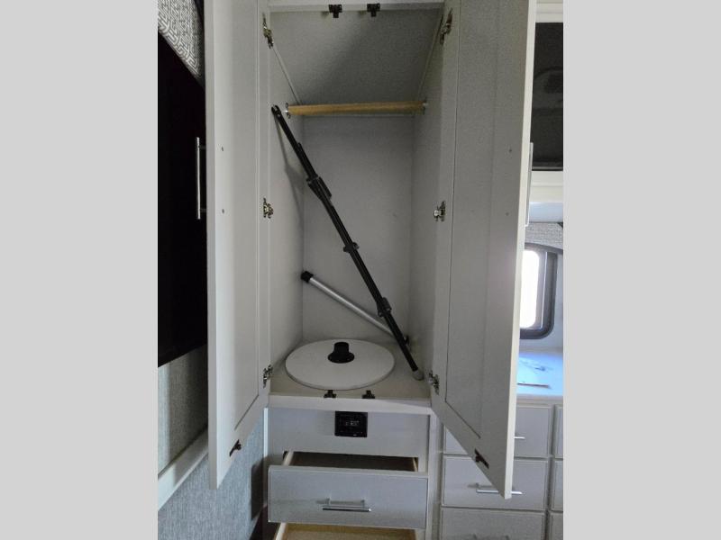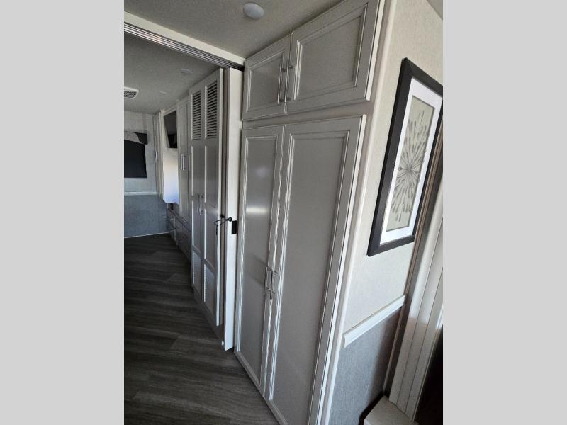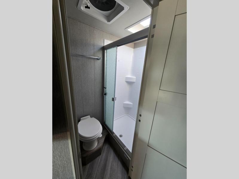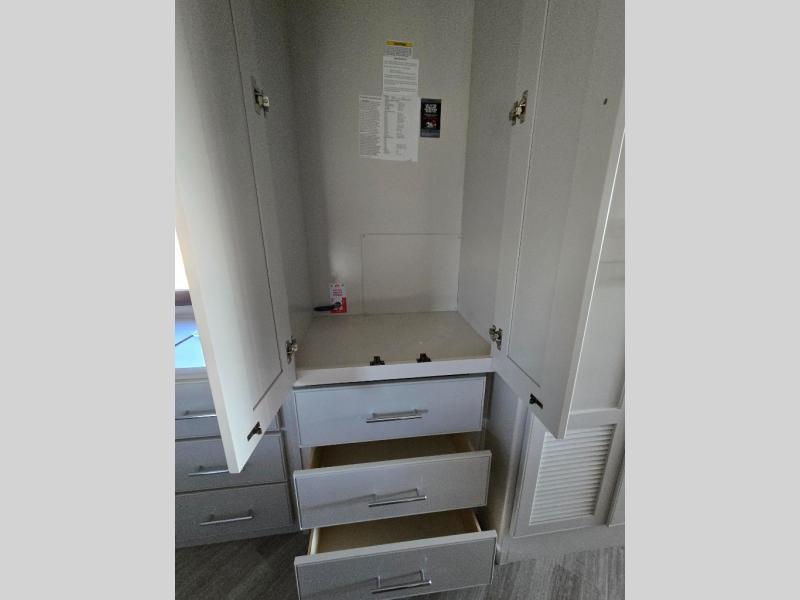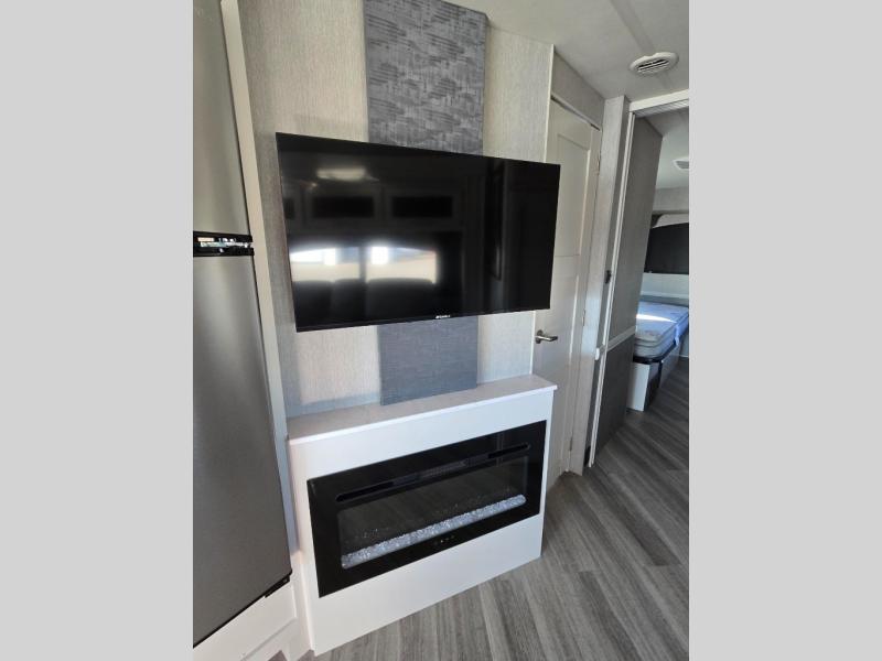 There is great convenience found in this Fortis Class A gas motorhome! But don't take our word for it; come check it out for yourself. You'll find that the private bedroom is one of your favorite spots with the Serenity Series RV king bed that sits on a slide out, the large wardrobe/dresser, and the LED TV across from the bed. Another great location is the kitchen because it has a pantry with swing and fixed shelves, a residential refrigerator, a convection microwave, and a three-burner cooktop. As you rest on the jackknife sofa or Dream Dinette, you'll enjoy entertainment from the LED TV, and you will also enjoy some added coziness from the fireplace.