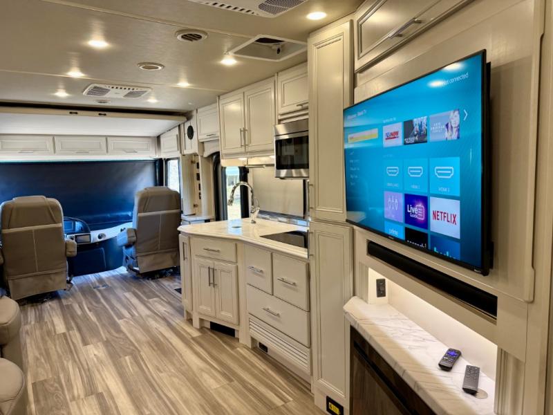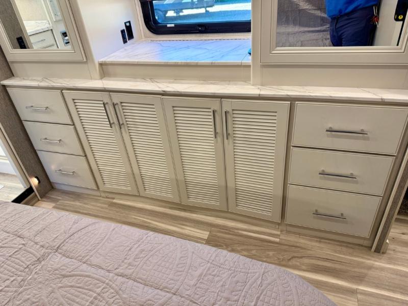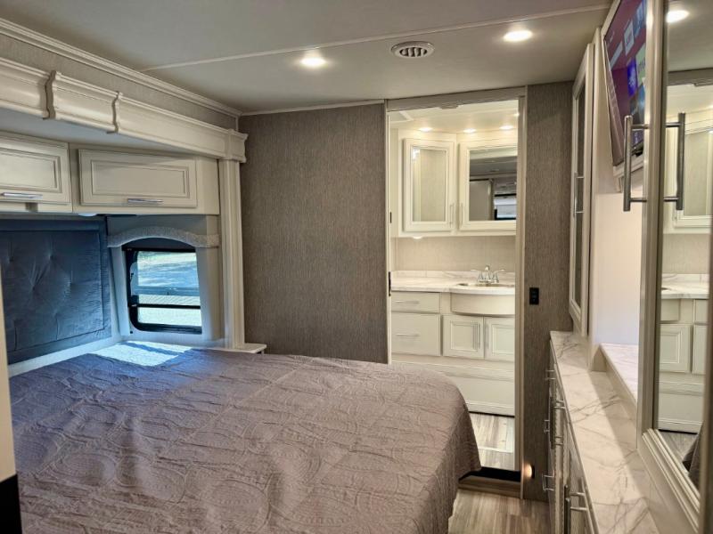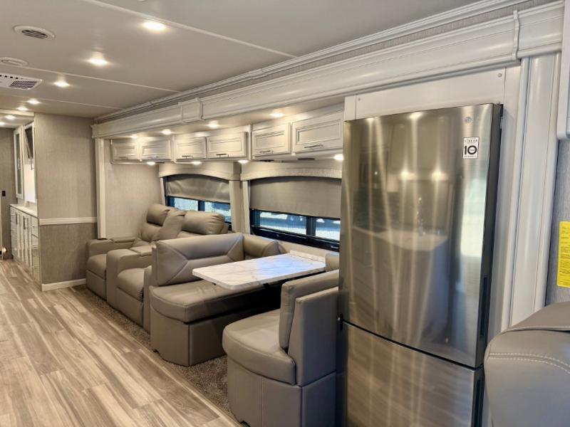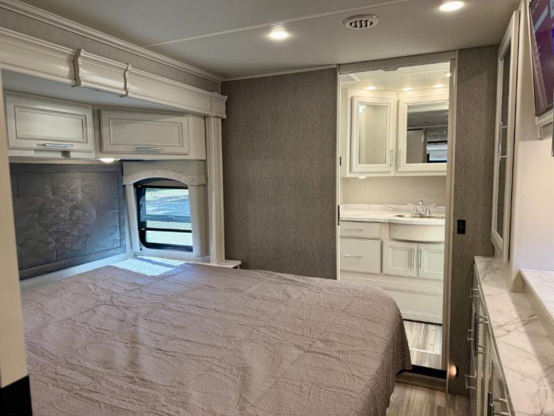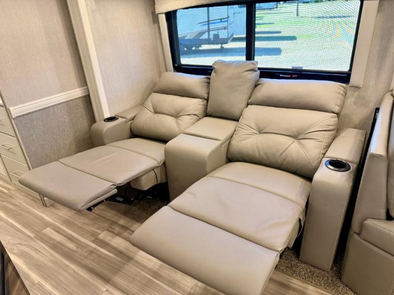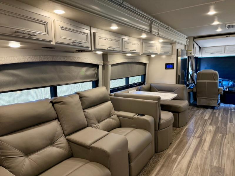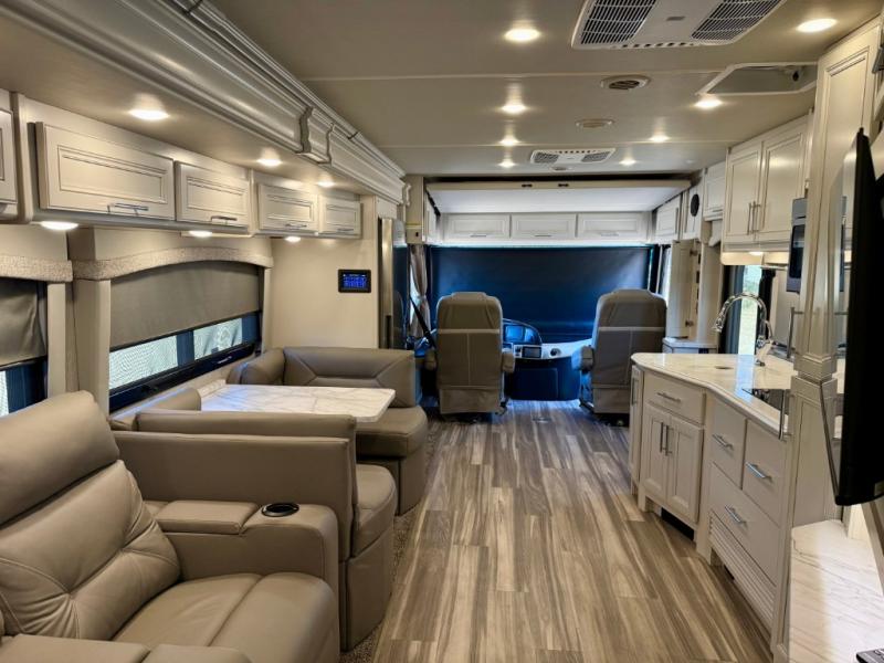 Looking for a spacious living and kitchen area in your next coach? This Pace Arrow provides that with the large slide that offers a sofa with a jackknife sleeper for overnight guests and a booth dinette, plus a residential refrigerator for lots of food storage. And the captain's chairs with pedestal table offer more seating when you have friends over to visit. The cook will love the galley kitchen with a convection microwave and induction cooktop, plus a pantry and a counter extension for more prep space. The handy half bath is mid-coach, and the master suite offers an Encore Series king bed that slides out, wardrobes with a dresser, an LED TV, and is a step away from the full bathroom. The exterior includes extra towing for your off-road toy trailer or a cargo rack for totes or even a vehicle, plus storage for outdoor chairs and such, a steel constructed entry step box, an electric awning with lighting and motion sensor retract, a Winegard 360-degree air antenna plus the coach is solar and satellite ready