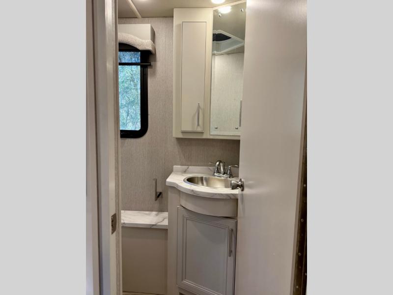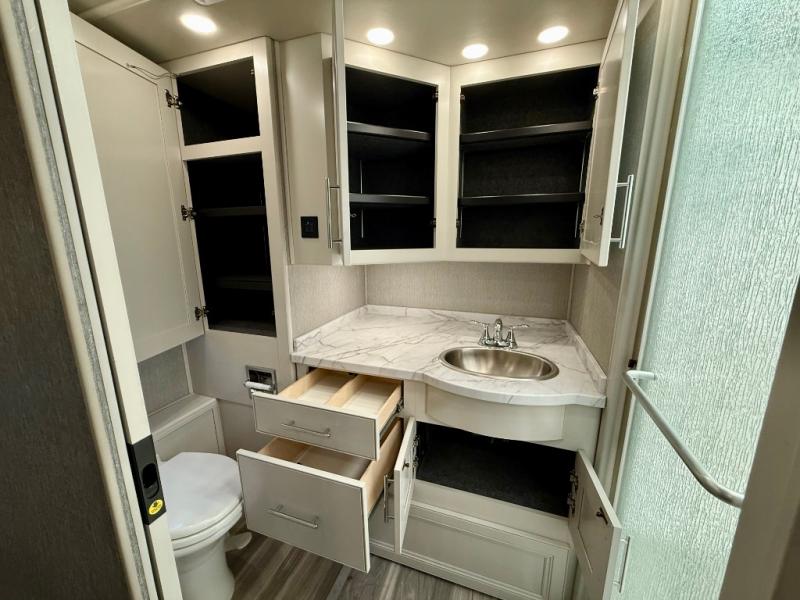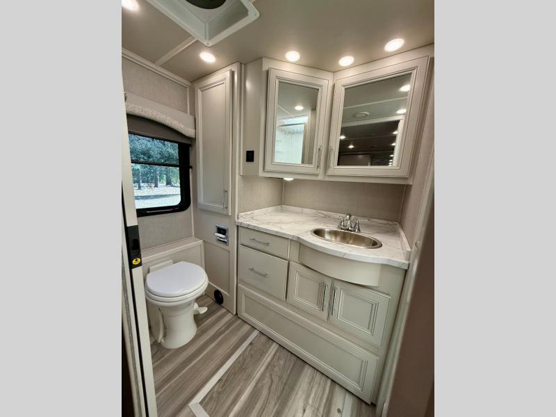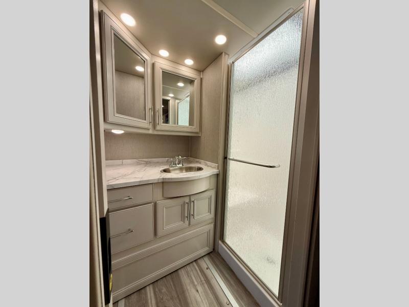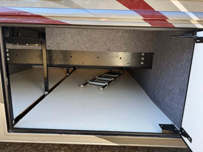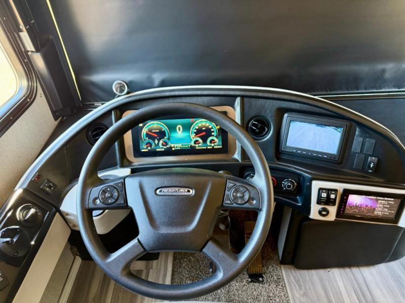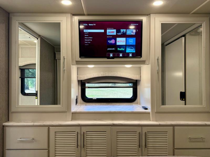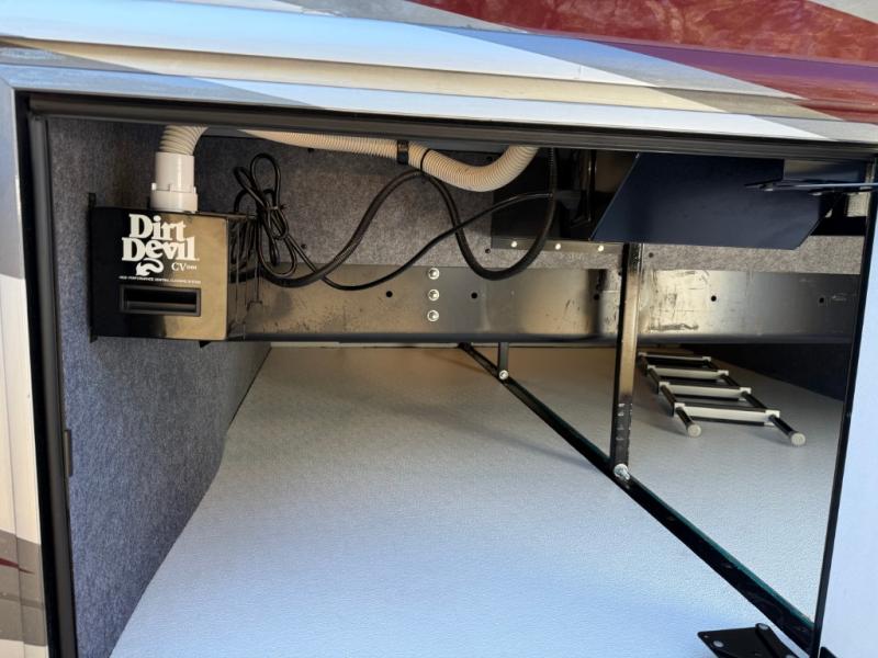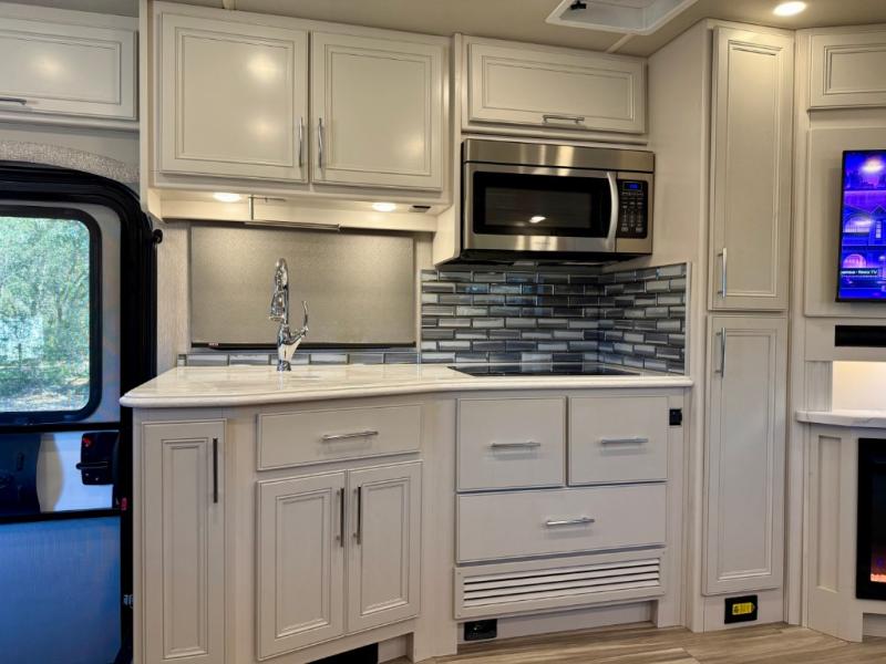 Looking for a spacious living and kitchen area in your next coach? This Pace Arrow provides that with the large slide that offers a sofa with a jackknife sleeper for overnight guests and a booth dinette, plus a residential refrigerator for lots of food storage. And the captain's chairs with pedestal table offer more seating when you have friends over to visit. The cook will love the galley kitchen with a convection microwave and induction cooktop, plus a pantry and a counter extension for more prep space. The handy half bath is mid-coach, and the master suite offers an Encore Series king bed that slides out, wardrobes with a dresser, an LED TV, and is a step away from the full bathroom. The exterior includes extra towing for your off-road toy trailer or a cargo rack for totes or even a vehicle, plus storage for outdoor chairs and such, a steel constructed entry step box, an electric awning with lighting and motion sensor retract, a Winegard 360-degree air antenna plus the coach is solar and satellite ready