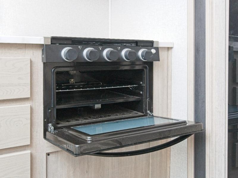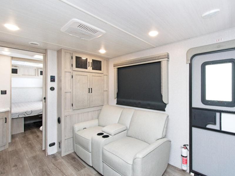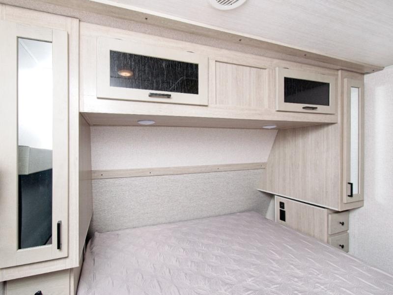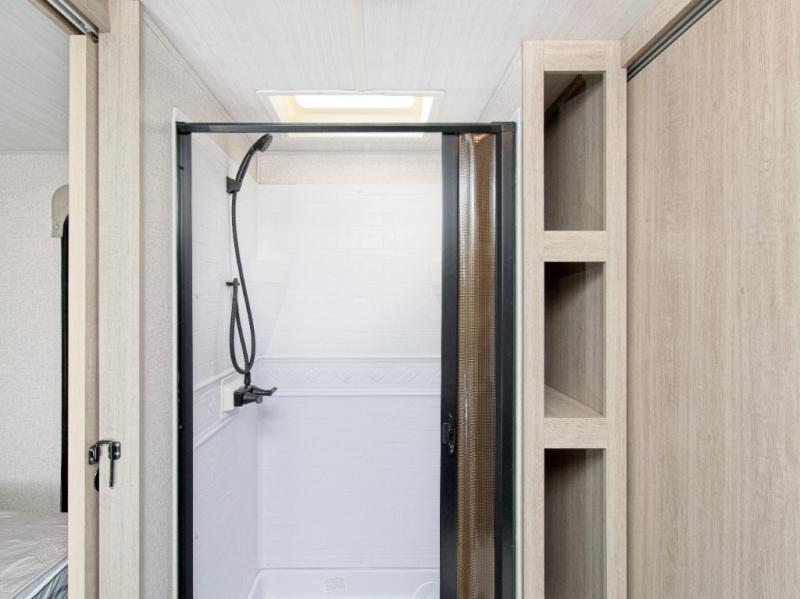 The walk-through bathroom is easily accessible from both the living area and bedroom, and the shower skylight brings in extra daylight for a more open feel. Up front, the private bedroom features a comfortable king-size bed, giving you the rest you deserve after a day of adventure.