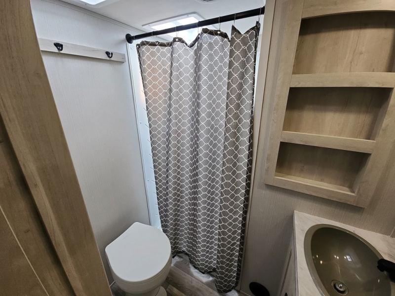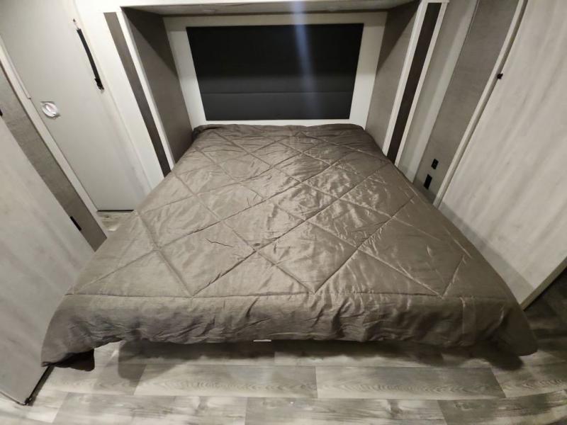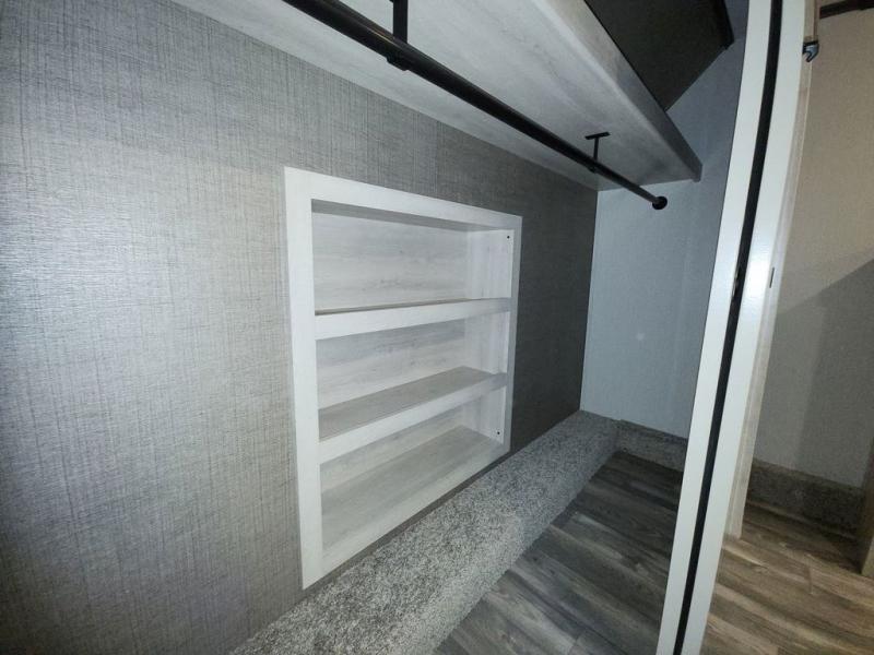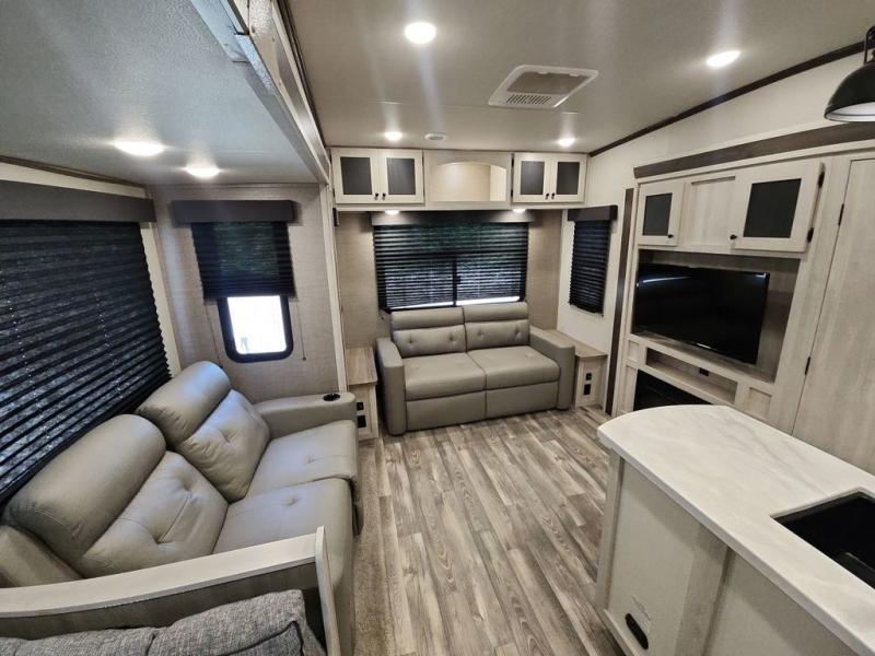 If you like the 29RL floorplan of the Forest River Cardinal RED, you might want to size up to the 31RL! With an additional slide out in the bedroom, the king bed is positioned differently, which allows for a full-width wardrobe. A second closet also has shelving plus space to hang garments. The bathroom is adjacent to the bedroom and includes a shower with skylight. The kitchen has a great counter island with sink for working, and there's even more counter space along the wall. A rear sofa and theater seats offer plenty of choices for seating, and they all have a great view of the electric fireplace.