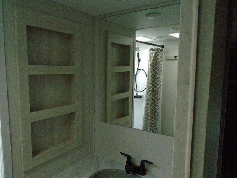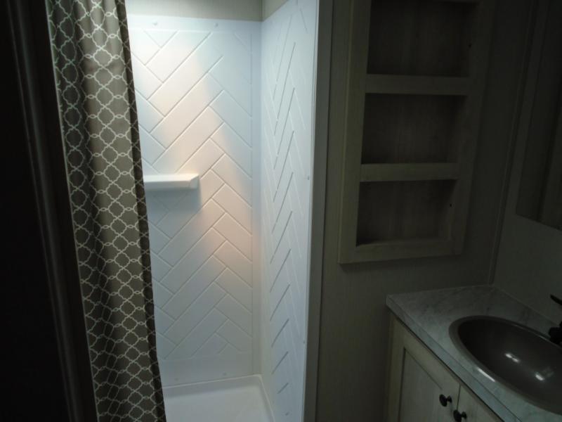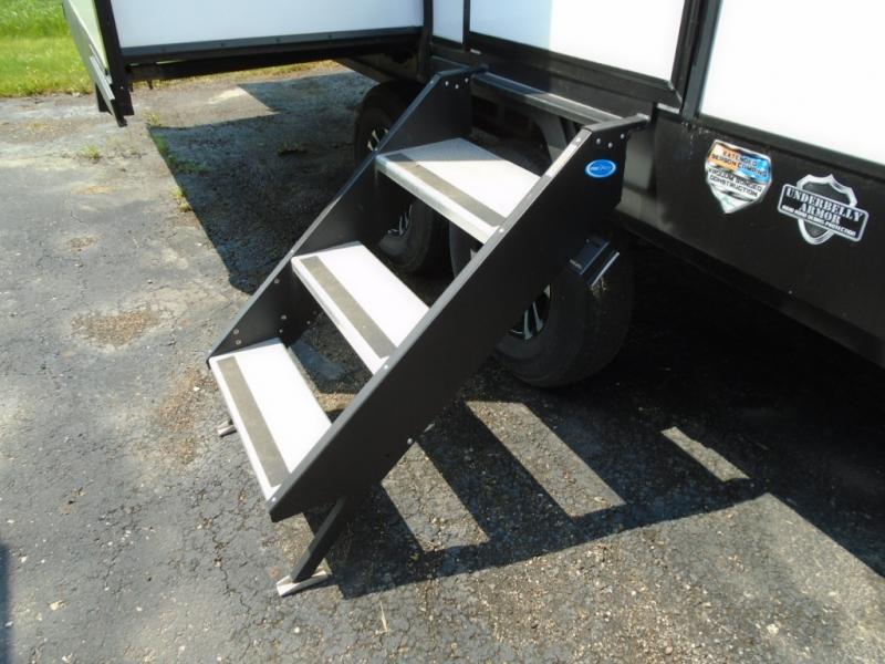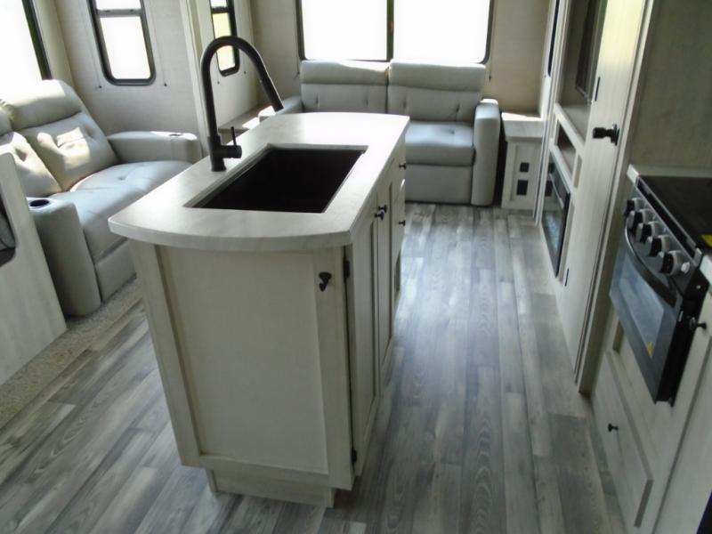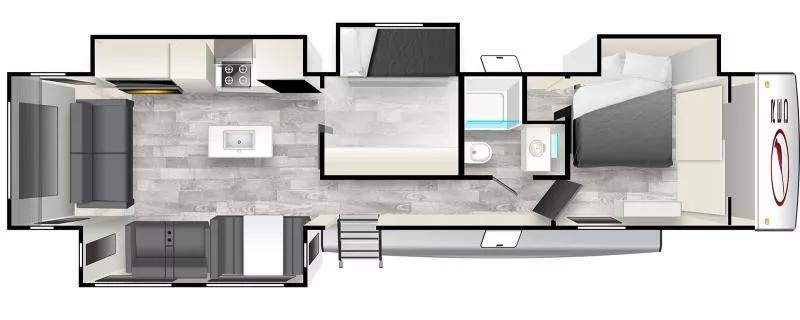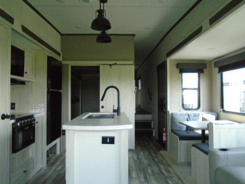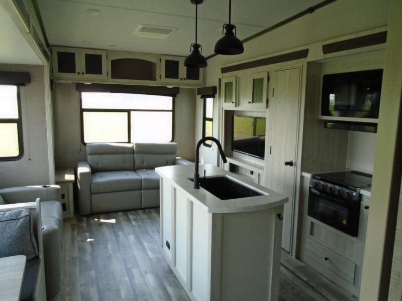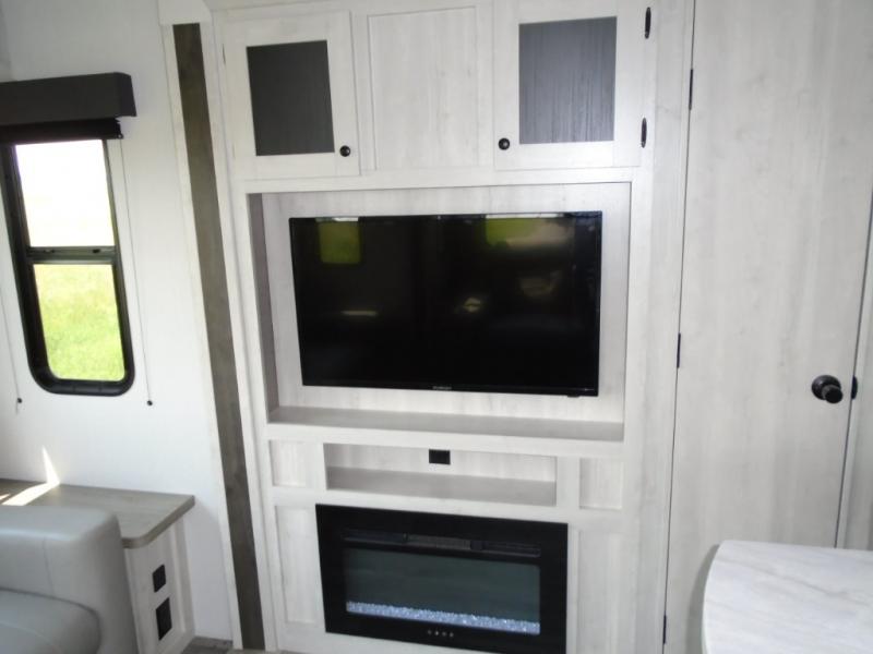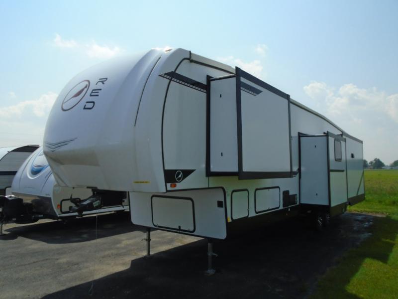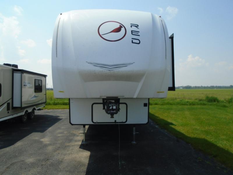 Cardinal RED is a new fifth wheel offering from Forest River. With flexible family-friendly designs, these models are designed to make camping affordable and accessible to everyone. A vacuum bonded and welded aluminum structure underlies the laminated sidewalls, while the underbelly features armor ABS panels and forced air heat to all holding tanks to prevent freezing. Inside will be comfortable as well with a high efficiency 35,000 BTU furnace, dual 13,500 BTU air conditioners, and an electric fireplace with thermostat control and remote.