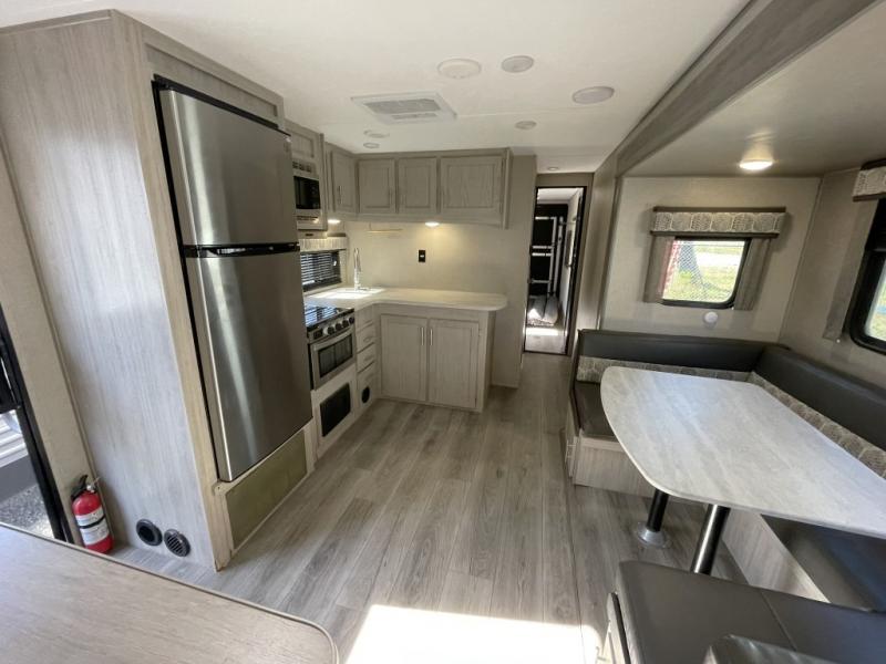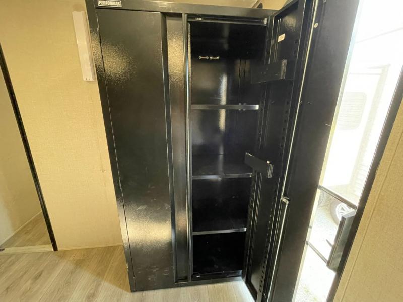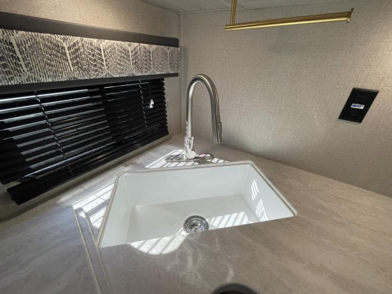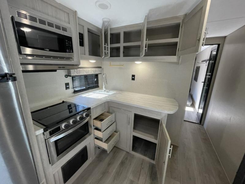 With its separate garage space, you can haul ATVs, bikes, kayaks, or anything else you need to fuel your weekend adventure. Guests can enjoy privacy in the garage area or relax outside with the optional ramp door party deck. After a day on the trails, rinse off with the convenient outside shower and gather for dinner around the U-shaped dinette. The fully equipped kitchen includes a three burner range, microwave, and plenty of counter space.