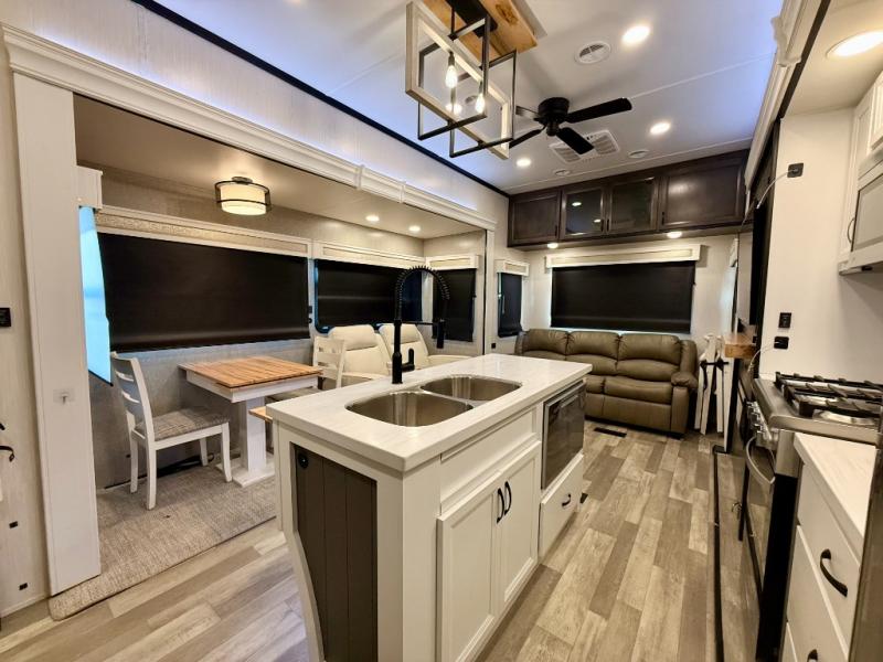 Pack your bags and hitch up this fifth wheel for a fun camping trip! When mother nature rains on your parade, relax in the rear living area on either the hide-a-bed sofa or power theater seating with USB charging across from the entertainment center with a fireplace and 50" flat screen TV. The chef can prepare their best meals with the kitchen island and there is a fold-down breakfast counter here for convenience. You could even add the optional pull-out kitchen for breakfast outdoors. The full bathroom has a 48" x 30" shower with a seat to wash the sand out of your hair after a fun day at the beach. The king bed slide in the front private bedroom welcomes you to enjoy a good night's rest and the front wardrobe has storage shelves and an area prepped to add an optional washer and dryer for you to have clean clothes throughout your entire trip!