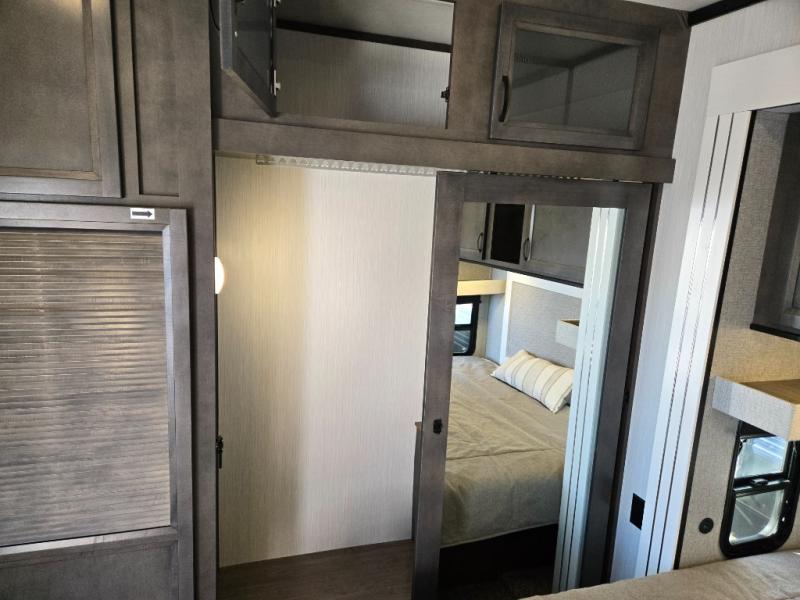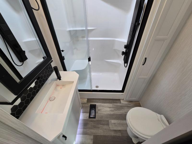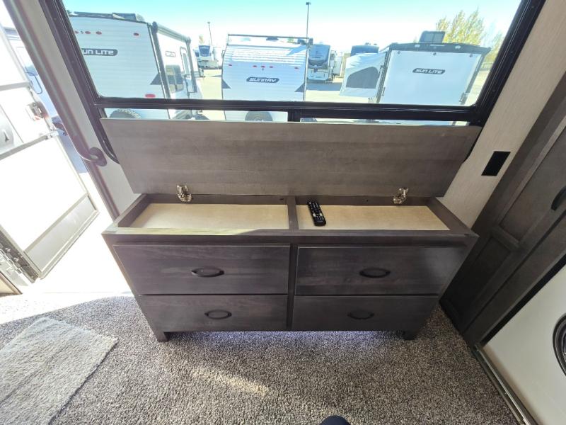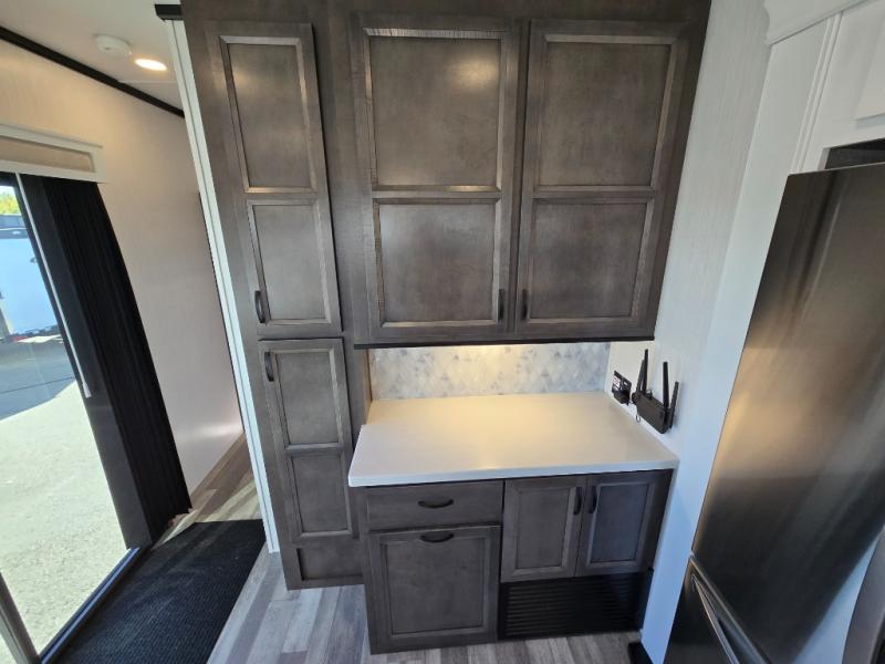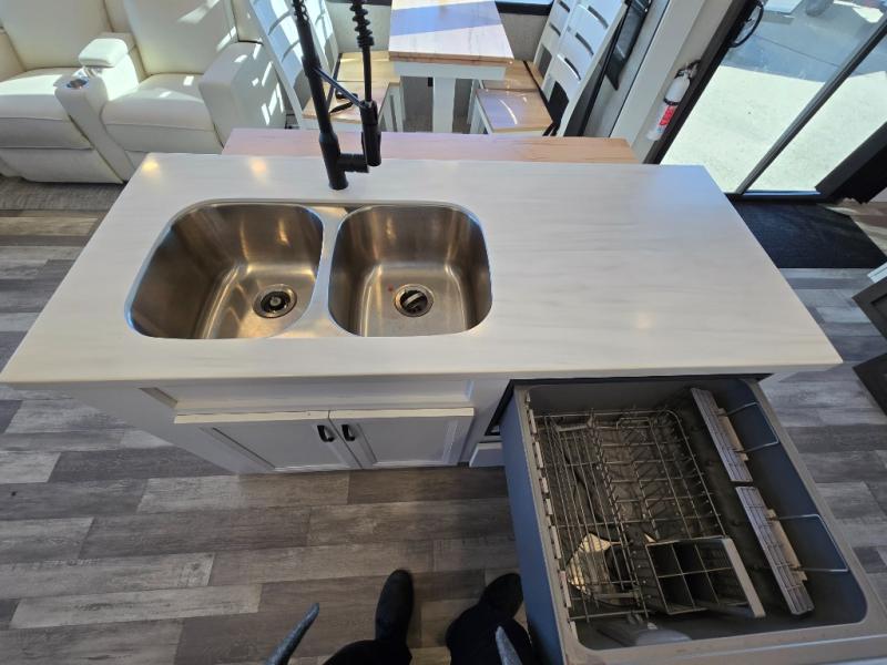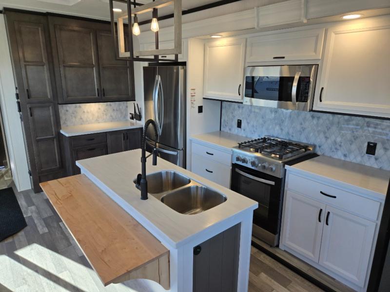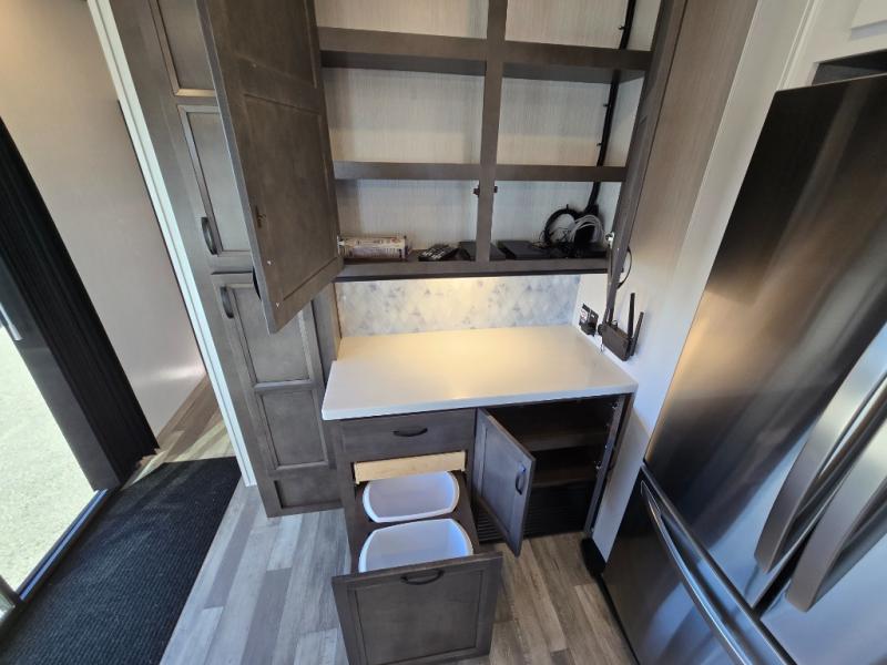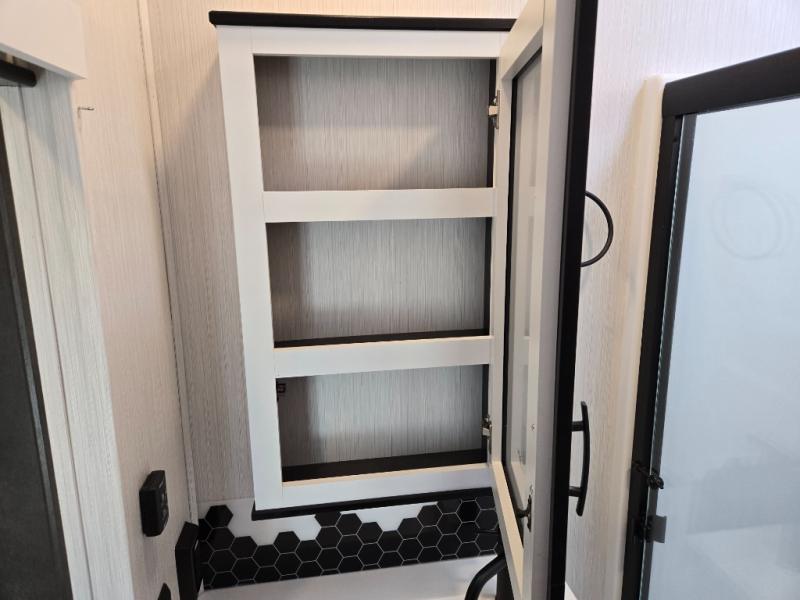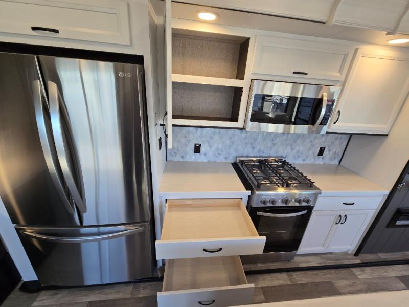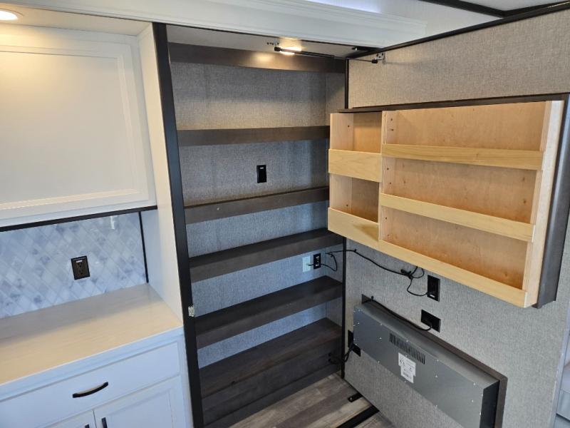 Spend some time getting to know your family a little bit better in this Cedar Creek Cottage destination trailer! You will have plenty of space to do all sorts of indoor activities with the opposing slides and king bed slide, and the free-standing table with chairs has a hidden table leaf extension that you can use if you are working on a bigger puzzle or have guests over for dinner. The kitchen has a Create-A-Breeze Fantastic Fan with thermostat and rain sensor to keep you cool as you work on the 24” free-standing four-burner gas range and stainless steel 30” over-the-range microwave with built-in vent. The full pantry has all the space needed to store many treats, and you can add an optional dishwasher to help you clean up much faster.