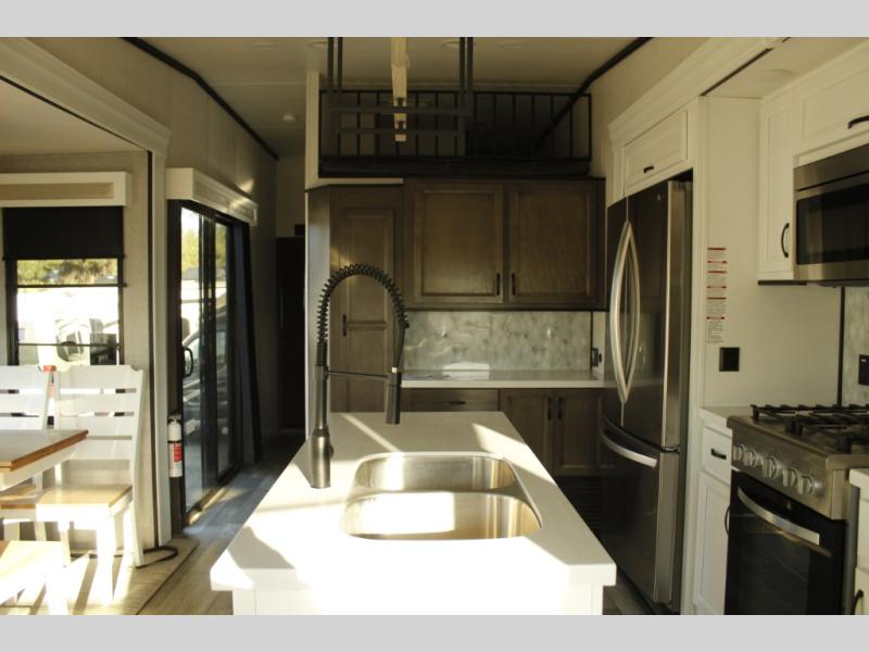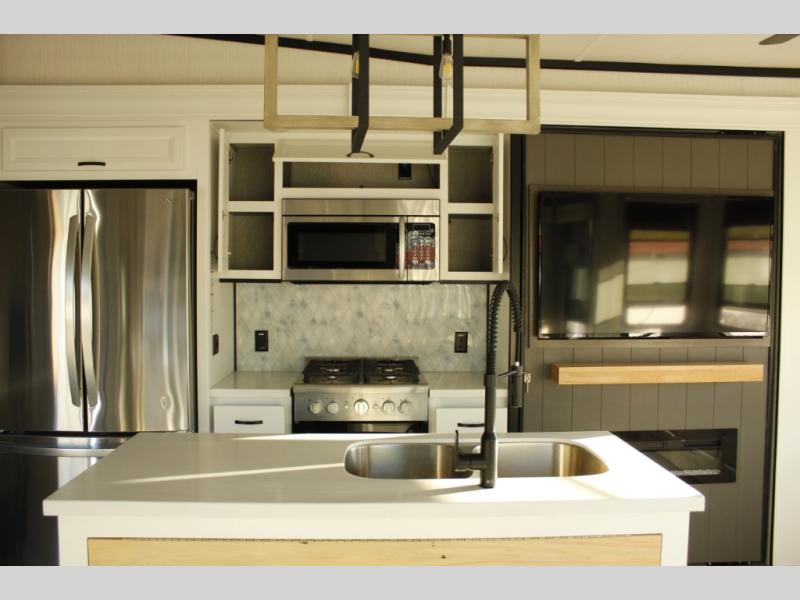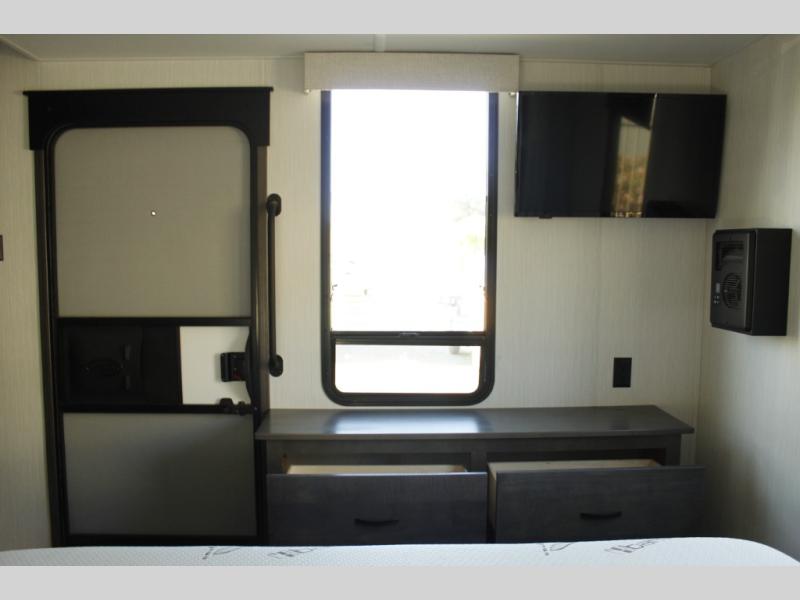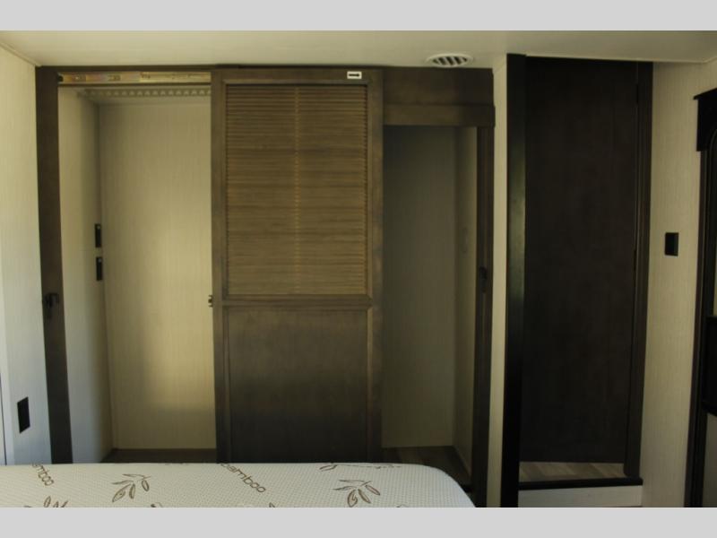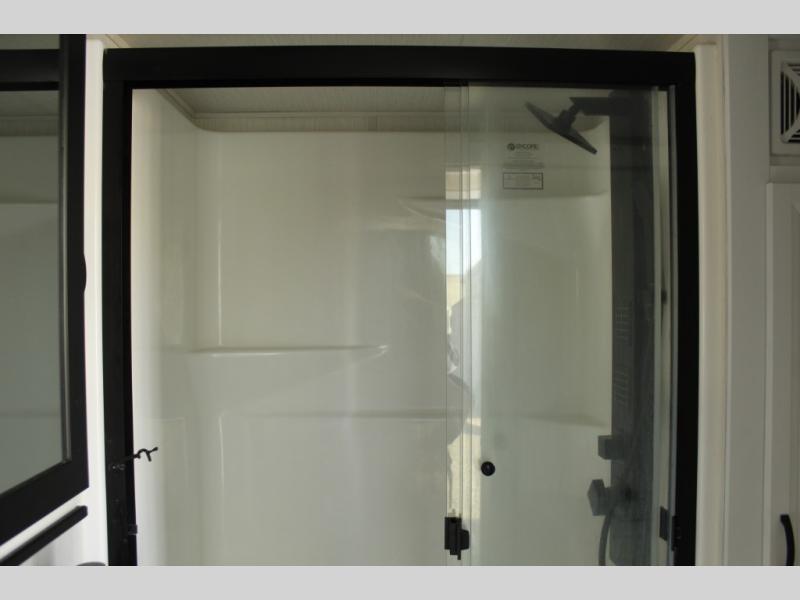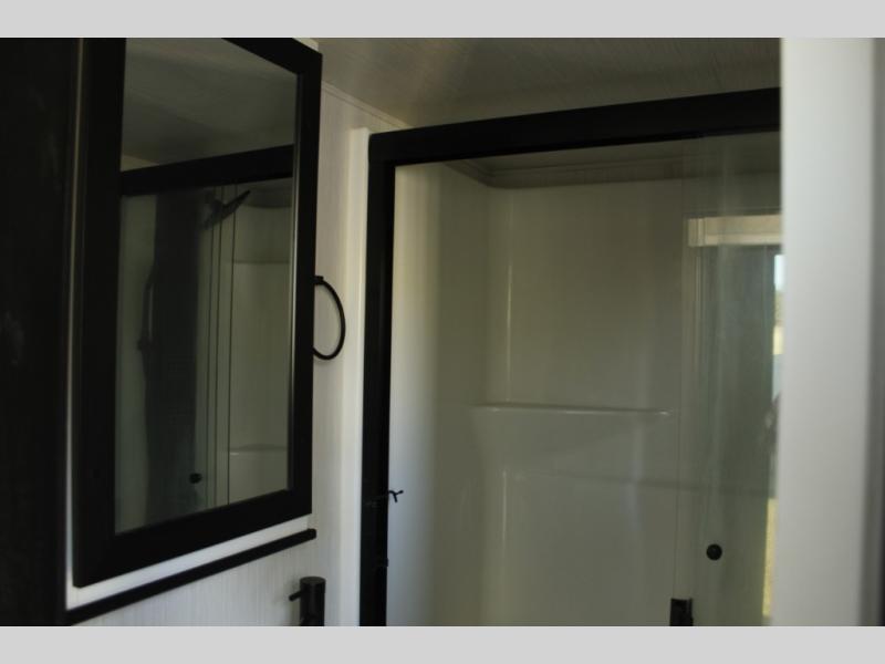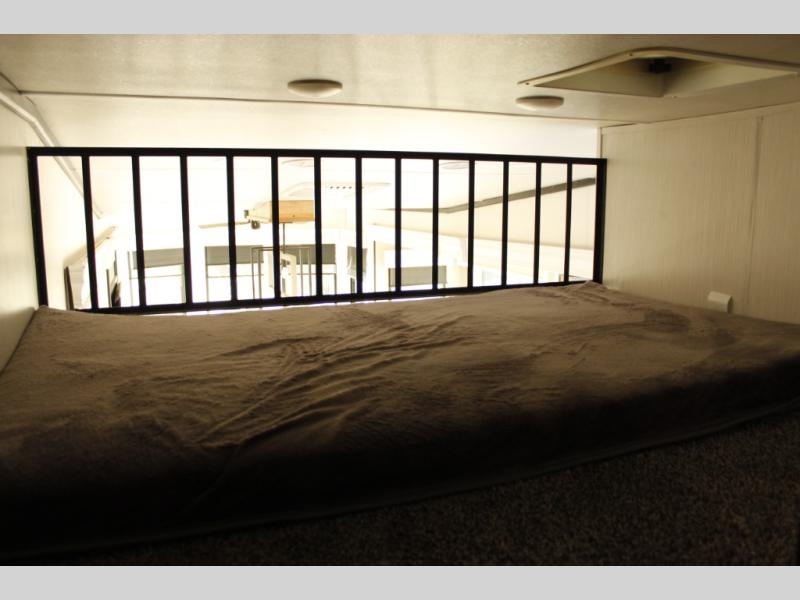The star feature of this Cedar Creek Cottage destination trailer is the huge loft area. Take the stairs up to the loft to see the three bunk mats and wardrobe. There is also a railing that prevents anyone from falling off the edge. The rear private bedroom offers you another sleeping area with a king bed slide for the most comfort, and there is also a six-drawer dresser that you can use to store your socks and t-shirts. The full bathroom comes with a 30" x 48" fiberglass shower with seat, a bath towel rack, a toilet paper holder, a large, mirrored medicine cabinet with overhead makeup lights, and a linen closet, and the kitchen is also fully equipped with a full pantry, a one-piece backsplash, a Create-A-Breeze Fantastic Fan with thermostat and rain sensor, a stainless steel 30” over-the-range microwave with built-in vent, and crown molding that complements all overhead cabinets.