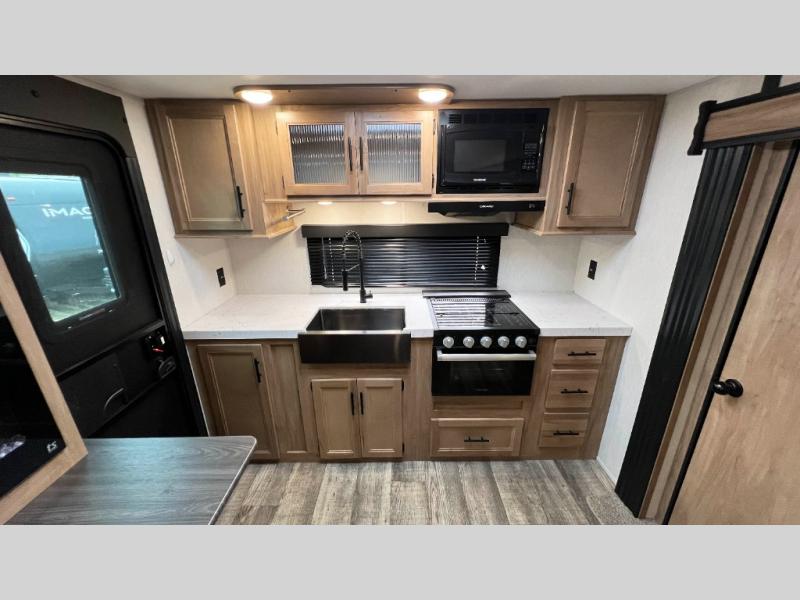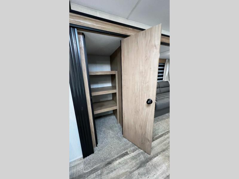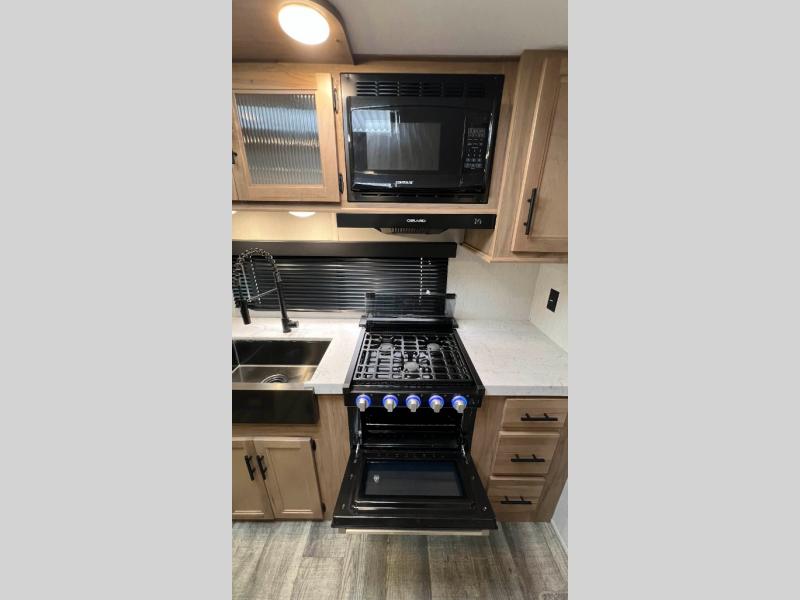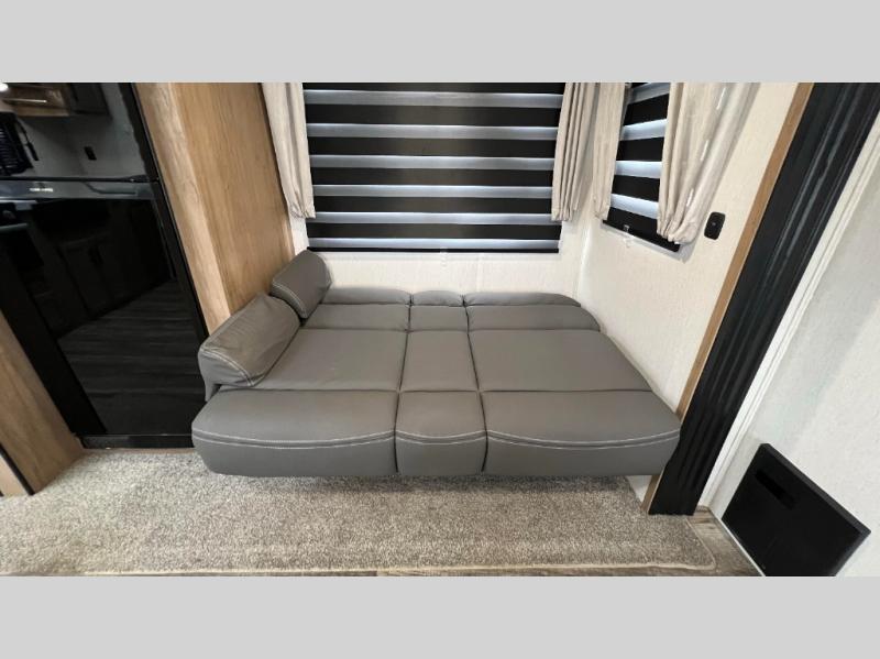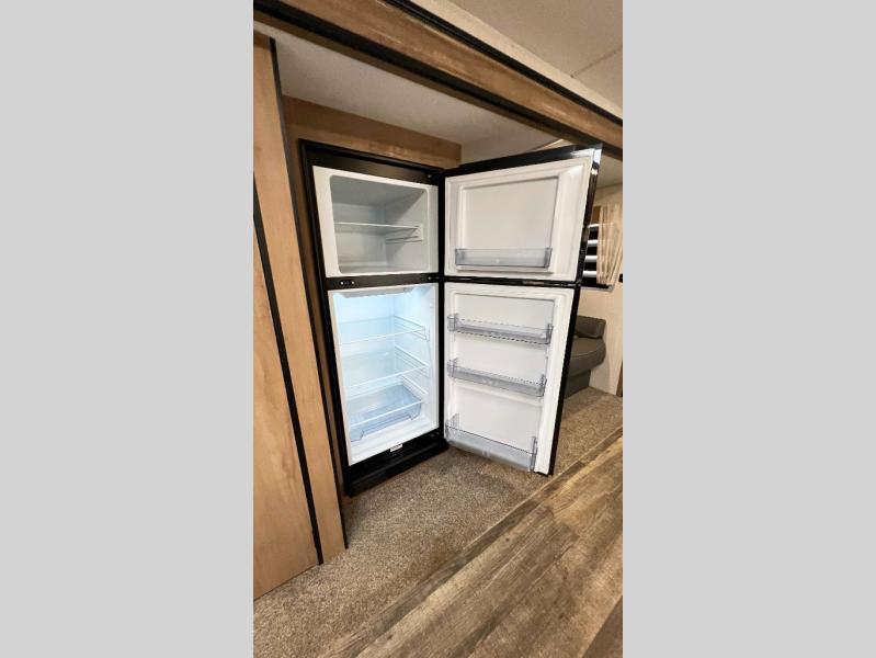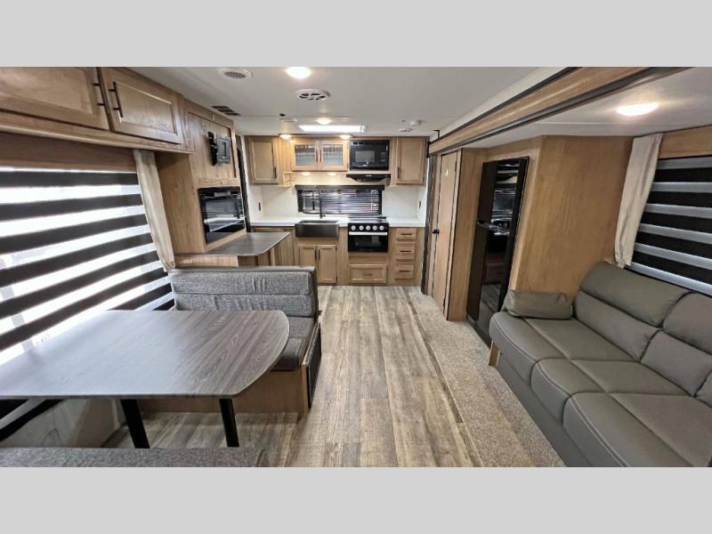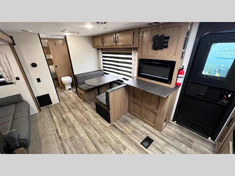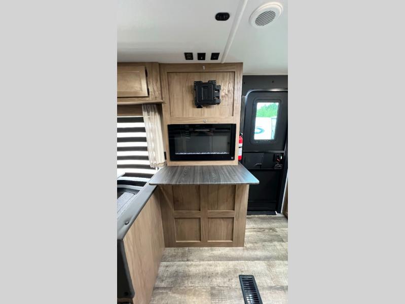 There is much to love about this travel trailer! Starting with the rear kitchen with a pantry, refrigerator and sofa in a slide for more walking around space. Enjoy your meals at the booth dinette then play a card game while you enjoy the fireplace next to it. You could even prepare your meals at the outside kitchen with an outside TV mount ready for you to hook up your TV. Freshen up each morning in the walk-through bathroom and head directly into the front private bedroom which has a queen bed with wardrobes on either side, a TV mount, and one of the dual entry doors to the unit so you can slip out for an early morning fishing trip!