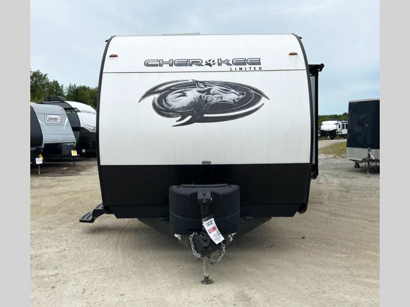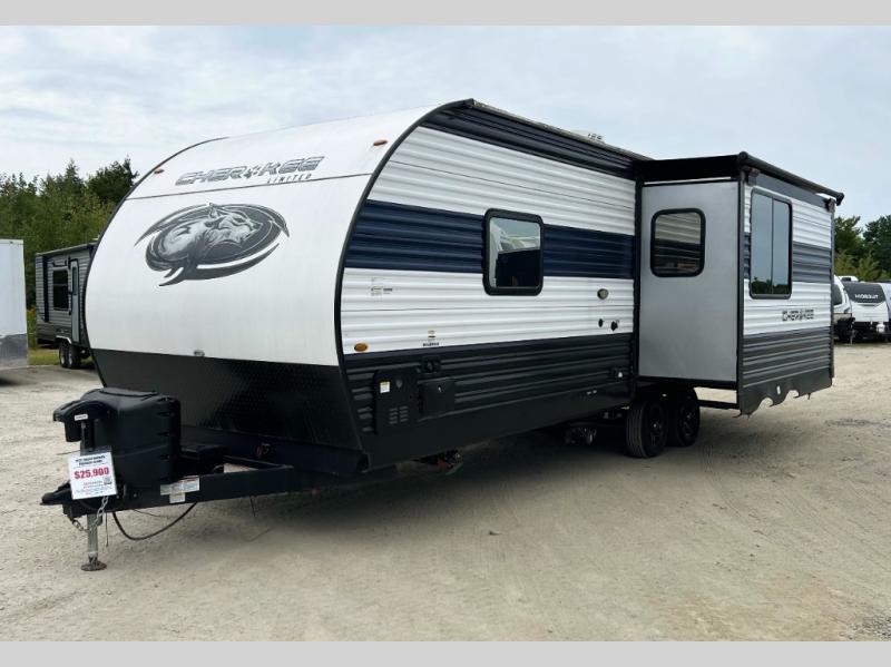 If the open road is calling your name, then answer it with one of these Forest River Cherokee travel trailers or toy haulers! A seamless roofing membrane with heat reflectivity covers these units and an armored underbelly tank enclosure protects it from road debris. The Power Gear frame technology holds them together and also comes with a space saver rail design. An outside shower with hot and cold water helps to keep the dirt outside where it belongs. With the Campfire package, you will get a beautiful entertainment center to watch your favorite movies, a sink cover for more prepping space, and a 6 gallon DSI gas/electric water heater for hot showers each morning. The Cherokee Total Control app and remote control system allows you to control your unit at the touch of a finger. A few other features you will appreciate include a super kitchen, USB charging station, and light filtering sheer shading premium blackout zebra shades for added privacy. Come find your favorite model today!