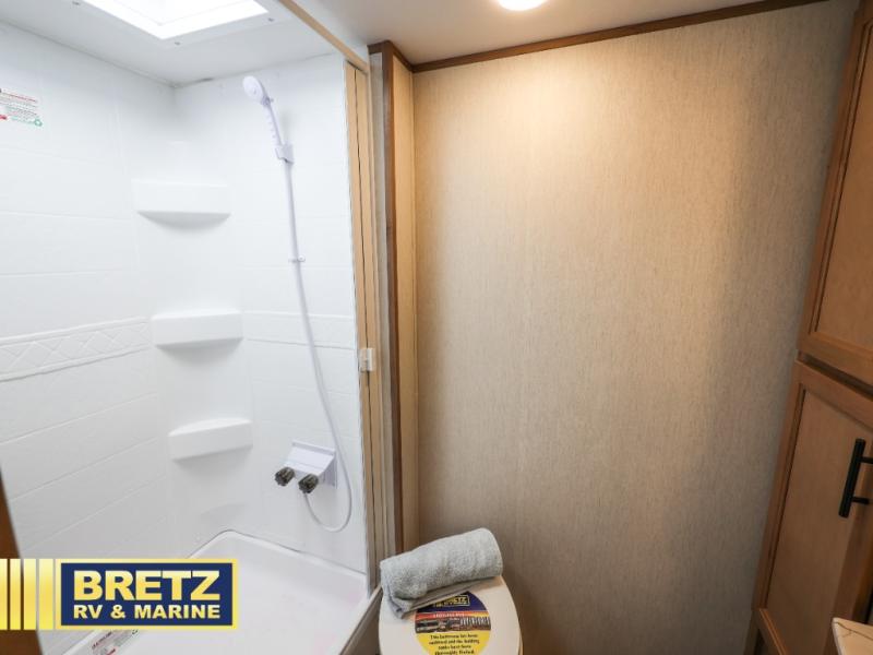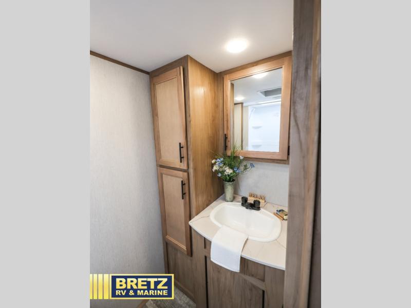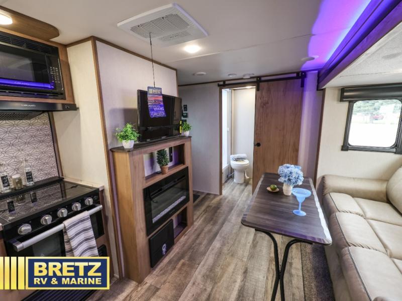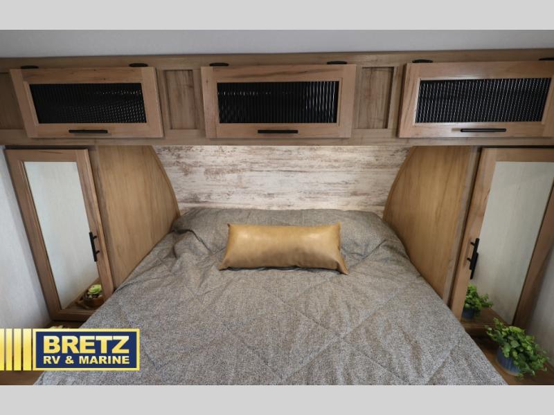Looking for the perfect trailer for two with a spacious bathroom and bedroom? This Alpha Wolf provides a rear oversized bathroom complete with linen storage and a barn-style door that saves space and looks great. The front bedroom includes a walk-around queen bed, dual shirt closets and nightstands, a farm-style door plus windows for natural lighting and great views. The main living and kitchen area is spacious as well with a large slide out that includes a theatre seat with a removable table, a 12V residential refrigerator for lots of cold storage, and a pantry for your snacks and dry goods. You can decide to cook indoors on the three burner cooktop, or head outdoors to cook on the deluxe outside kitchen, complete with a two burner cooktop, a refrigerator, a sink, and ice!