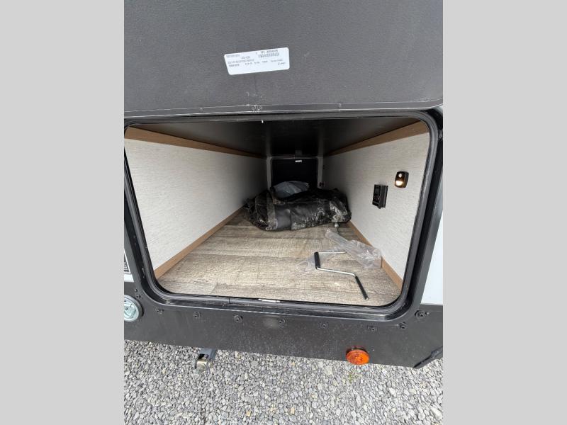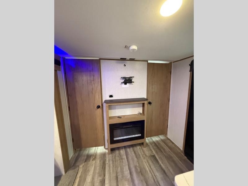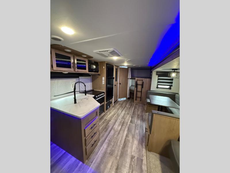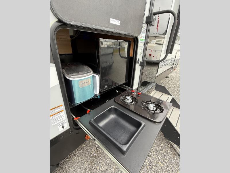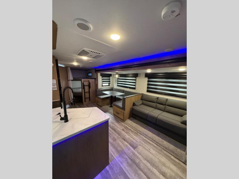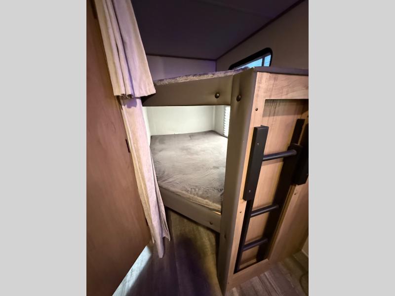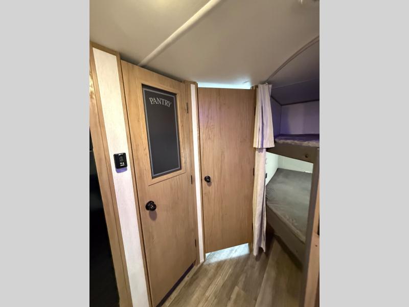 Looking for a multi-sleeper trailer to sleep nine to ten happy campers? You've found it in this dual entry model with a deluxe outside kitchen, double-size bunks, and a large slide out! The main living and kitchen area has a U-shaped dinette to utilize as a dining table, game table, work station, and/or an extra sleeping space. You will also find a walk-in pantry and full kitchen amenities including a farm-style sink, a residential refrigerator, and dual pots and pans drawers. The exterior provides a 20' awning for an outdoor living area, a pass-through storage, plus removable and adjustable steps for convenience. You will also appreciate the Juice Pack that comes with a 100W solar panel, a Series 27 battery, a 30 AMP solar charger, and more!