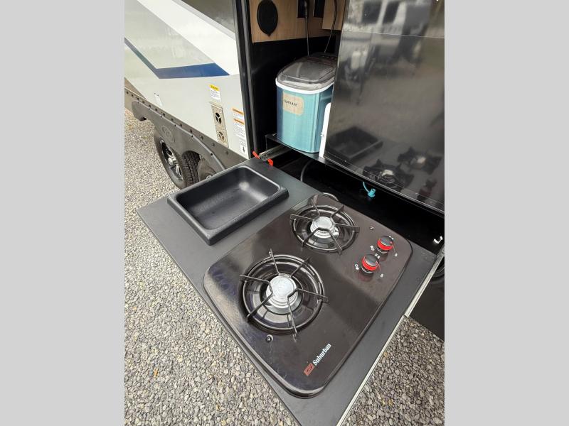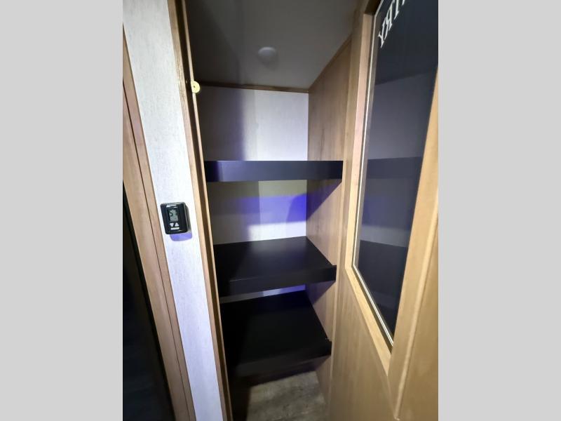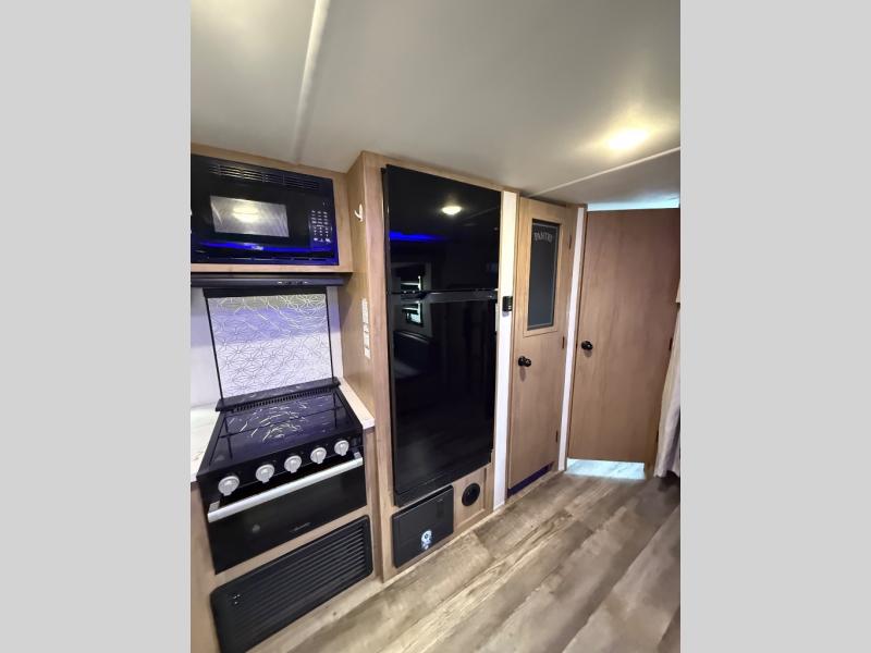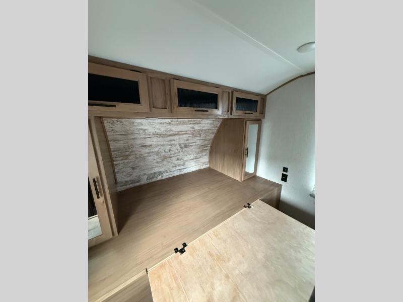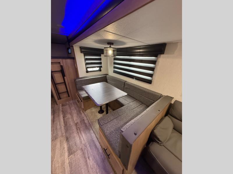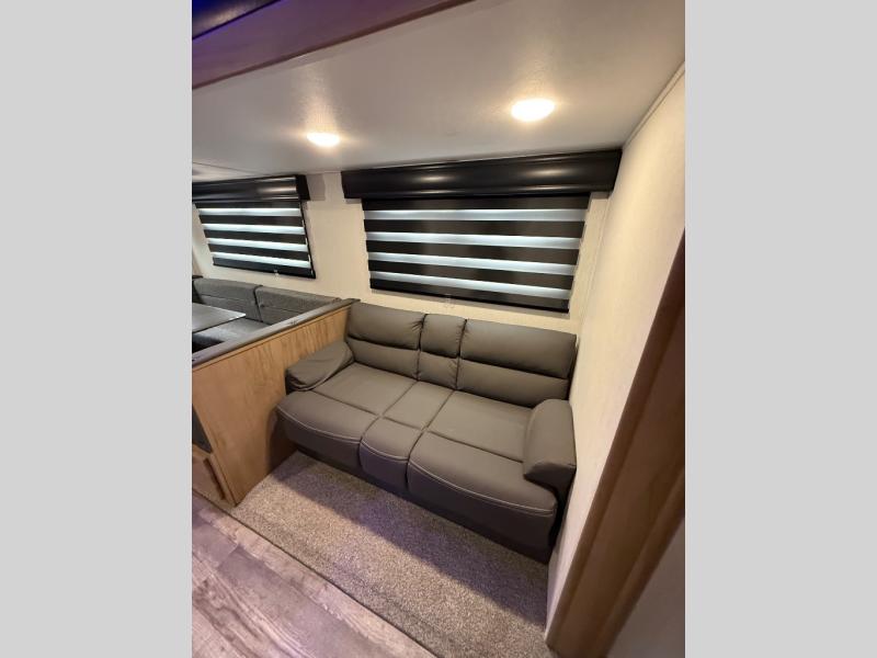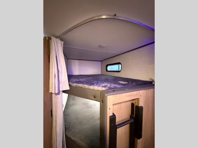 Looking for a multi-sleeper trailer to sleep nine to ten happy campers? You've found it in this dual entry model with a deluxe outside kitchen, double-size bunks, and a large slide out! The main living and kitchen area has a U-shaped dinette to utilize as a dining table, game table, work station, and/or an extra sleeping space. You will also find a walk-in pantry and full kitchen amenities including a farm-style sink, a residential refrigerator, and dual pots and pans drawers. The exterior provides a 20' awning for an outdoor living area, a pass-through storage, plus removable and adjustable steps for convenience. You will also appreciate the Juice Pack that comes with a 100W solar panel, a Series 27 battery, a 30 AMP solar charger, and more!