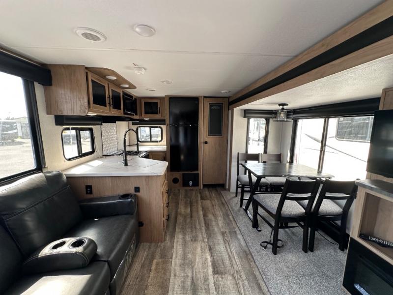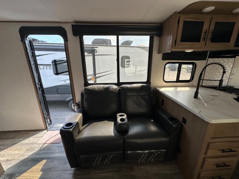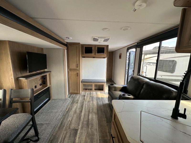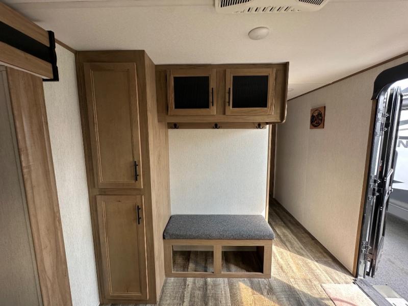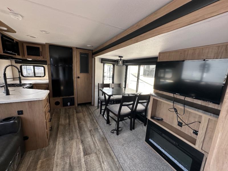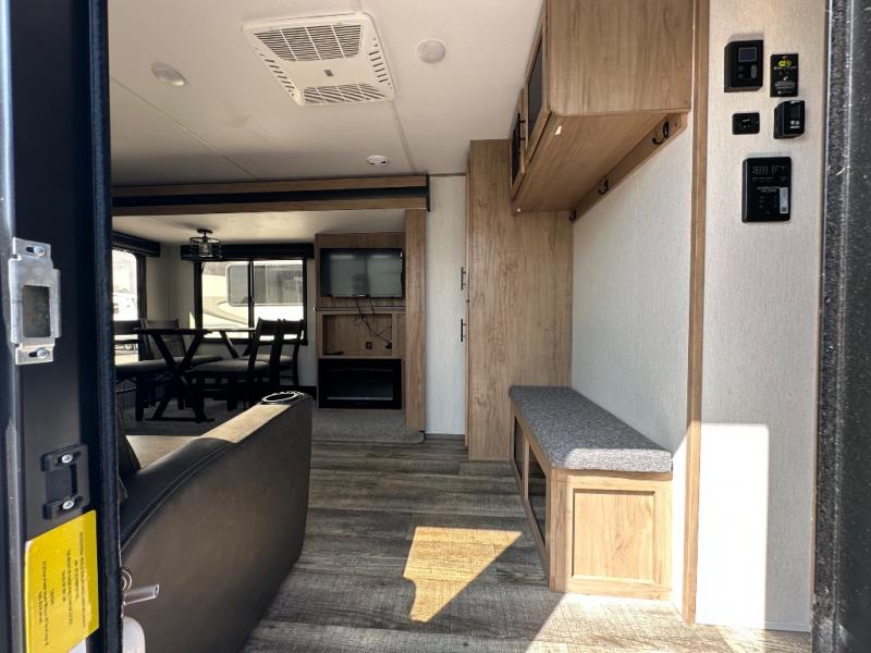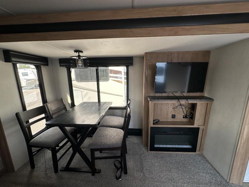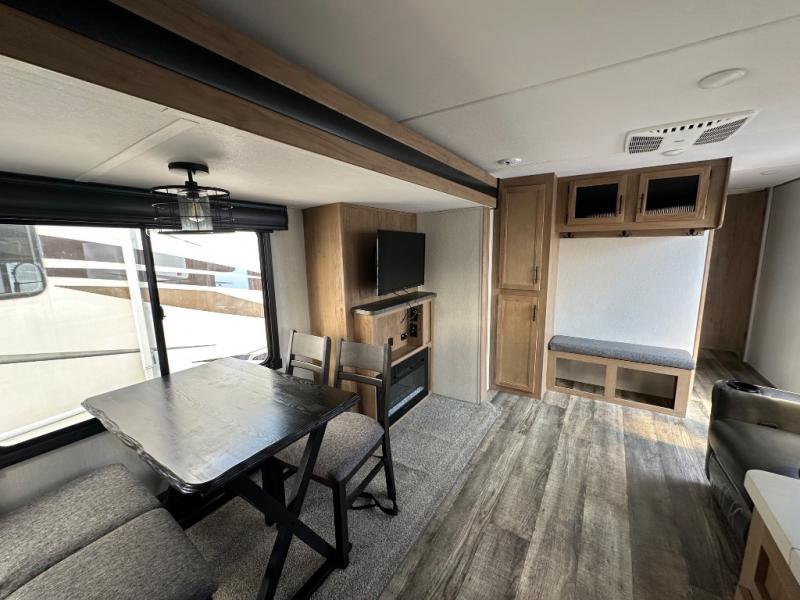 When you are looking for a couples trailer, you might want to stop your search after stepping inside this one! Some of highlights include theater seating to relax in while enjoying the fireplace, a walk-in pantry, and a large slide out. You can dine at the free-standing table with two fixed chairs and two folding chairs, and this space is great if you need a work area. There is bench seating with storage allowing you to sit down while taking off your shoes, plus overhead storage for belongings. The double entry bathroom is convenient, and the front bedroom offers a queen bed with two sides of storage, plus windows for cross-ventilation when you want some fresh air inside.
