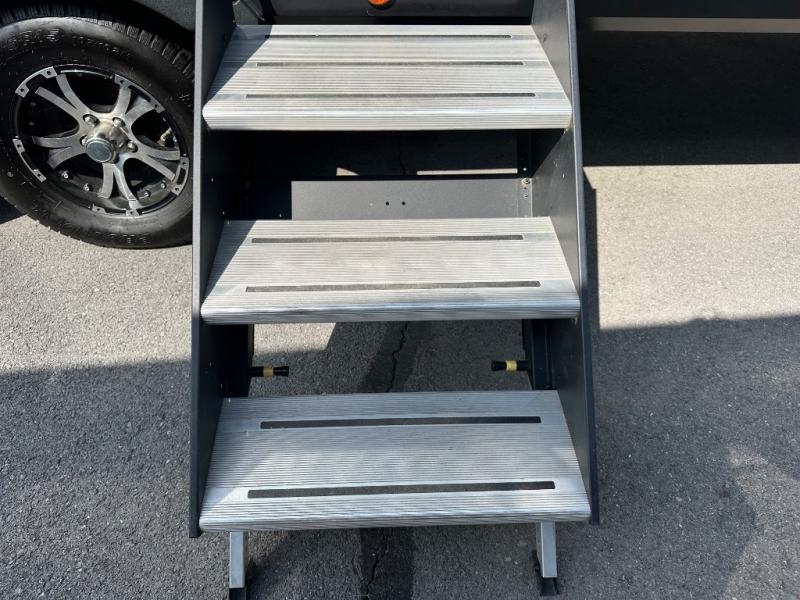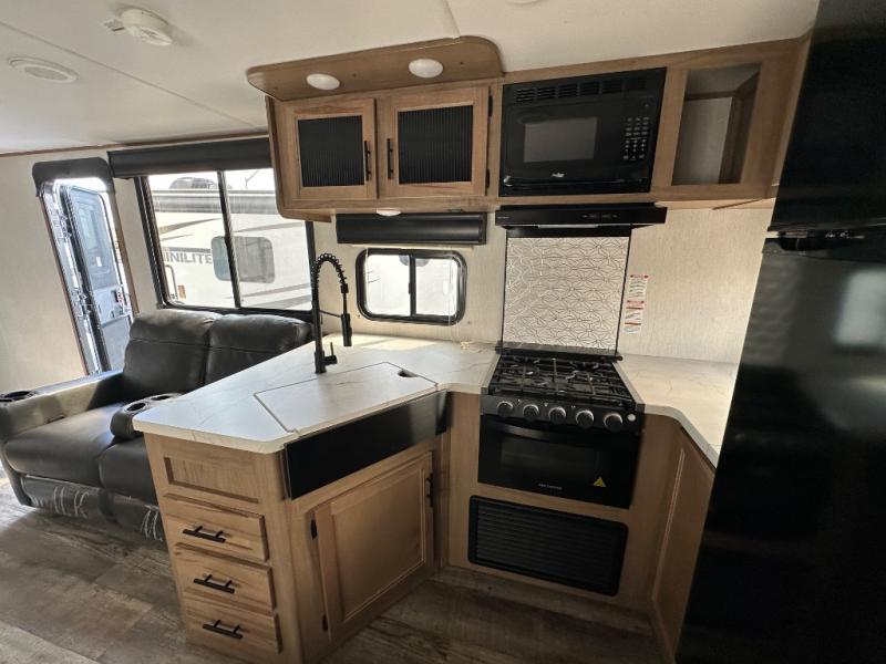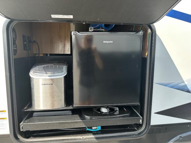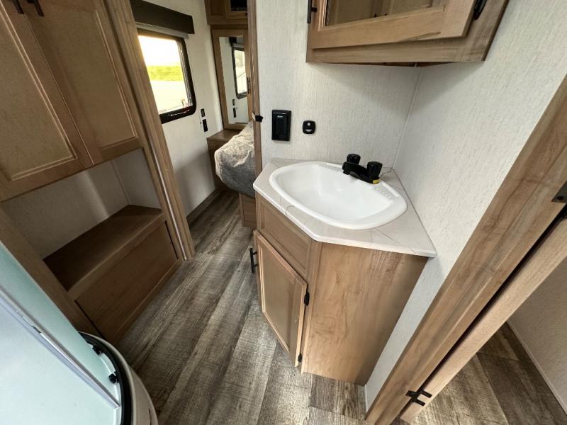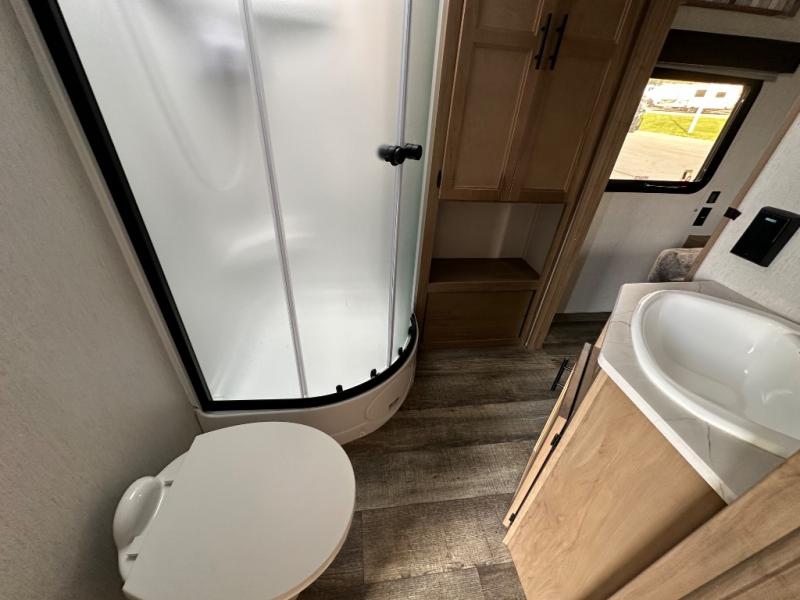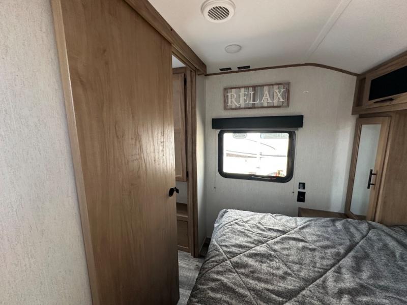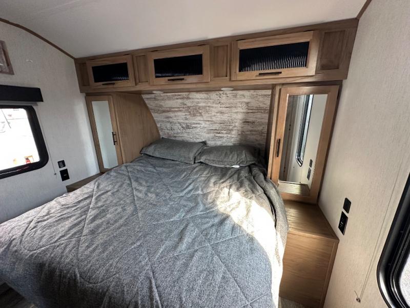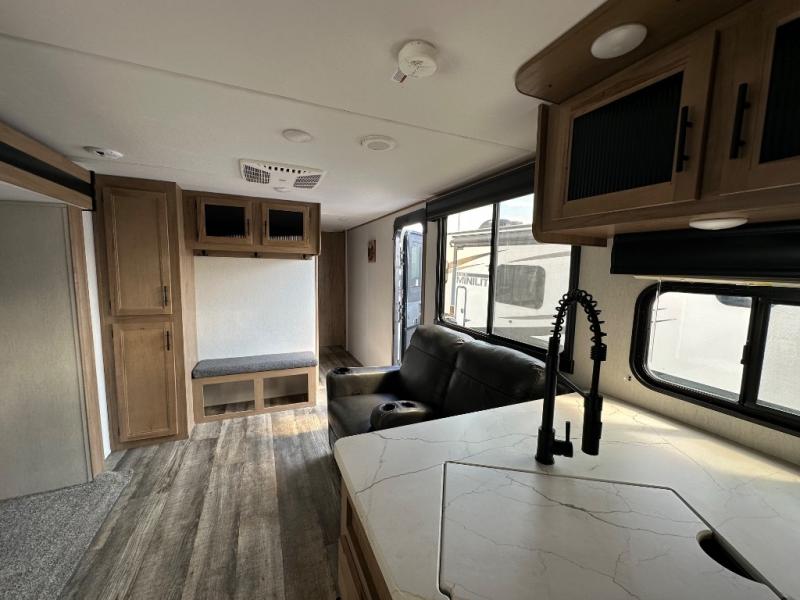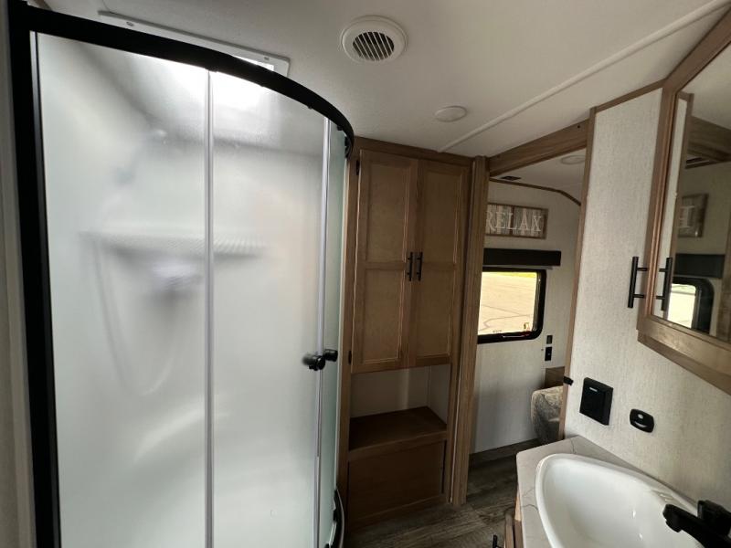 When you are looking for a couples trailer, you might want to stop your search after stepping inside this one! Some of highlights include theater seating to relax in while enjoying the fireplace, a walk-in pantry, and a large slide out. You can dine at the free-standing table with two fixed chairs and two folding chairs, and this space is great if you need a work area. There is bench seating with storage allowing you to sit down while taking off your shoes, plus overhead storage for belongings. The double entry bathroom is convenient, and the front bedroom offers a queen bed with two sides of storage, plus windows for cross-ventilation when you want some fresh air inside.