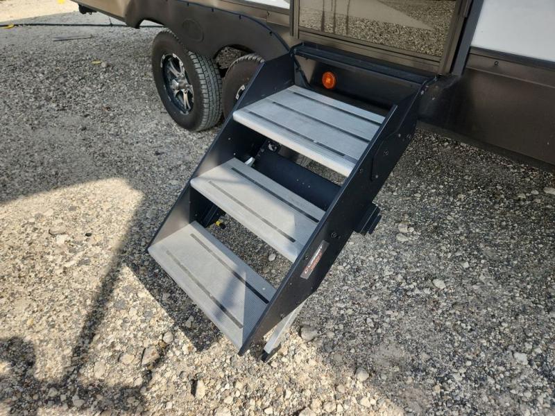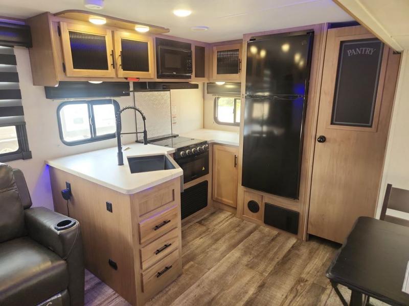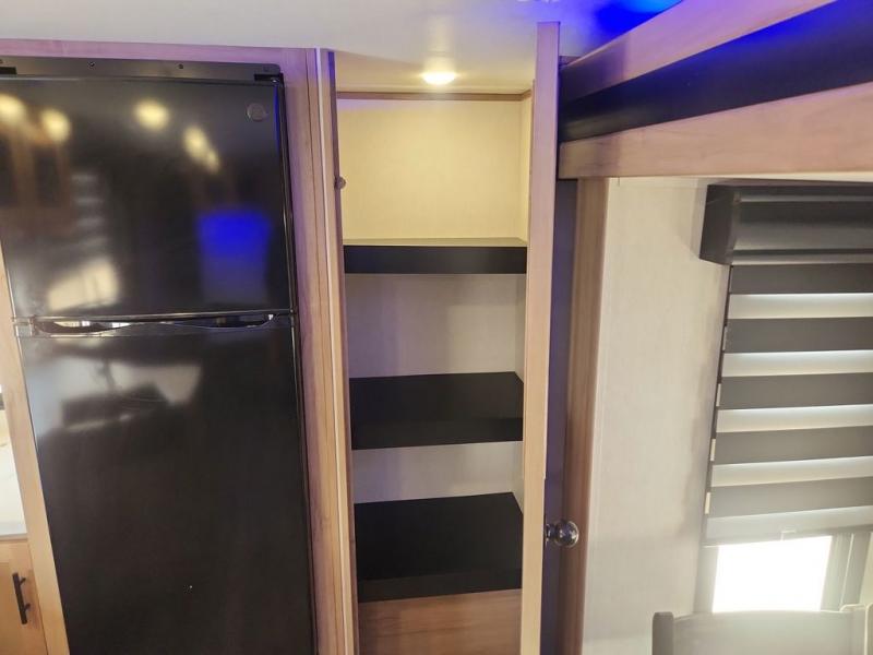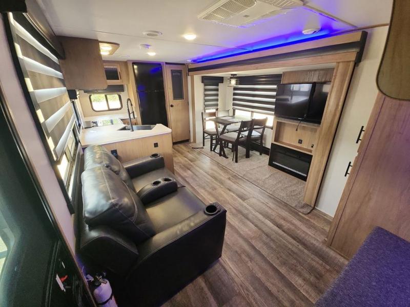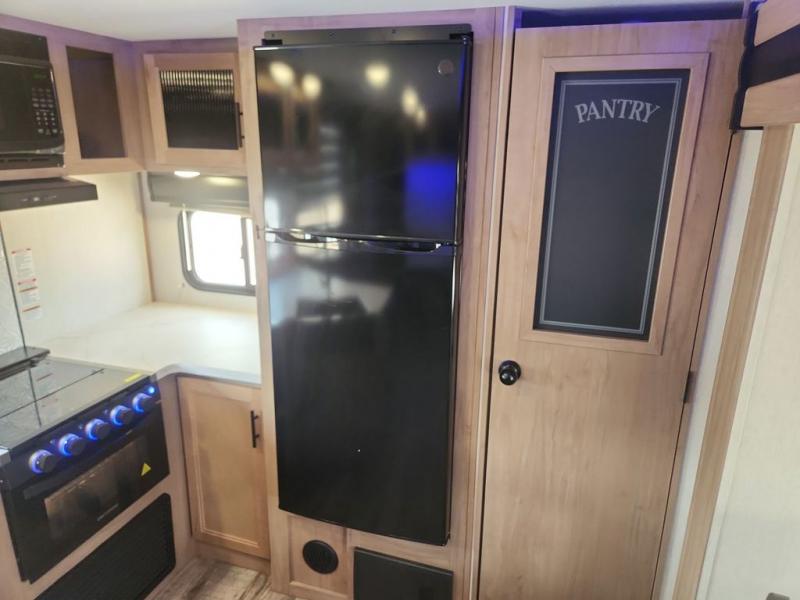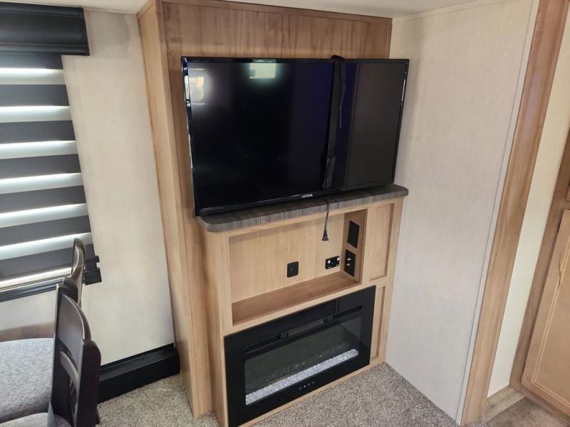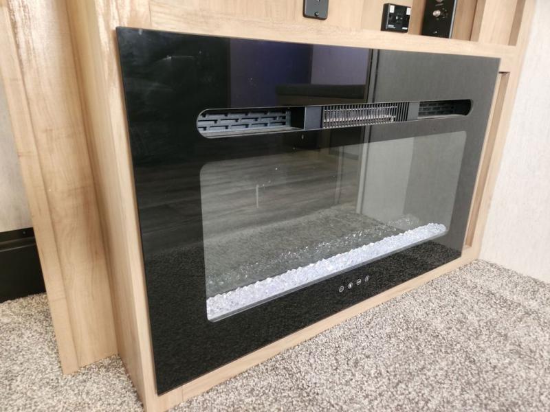 When you are looking for a couples trailer, you might want to stop your search after stepping inside this one! Some of highlights include theater seating to relax in while enjoying the fireplace, a walk-in pantry, and a large slide out. You can dine at the free-standing table with two fixed chairs and two folding chairs, and this space is great if you need a work area. There is bench seating with storage allowing you to sit down while taking off your shoes, plus overhead storage for belongings. The double entry bathroom is convenient, and the front bedroom offers a queen bed with two sides of storage, plus windows for cross-ventilation when you want some fresh air inside.