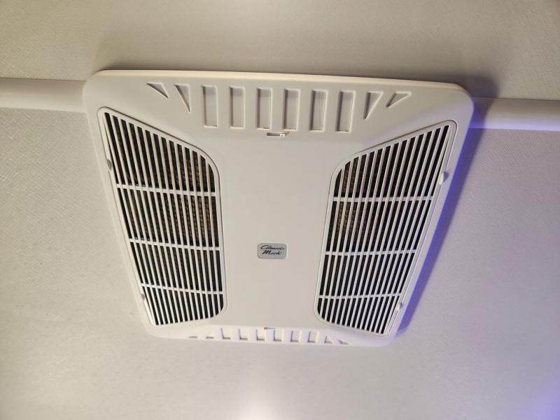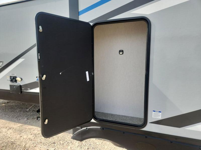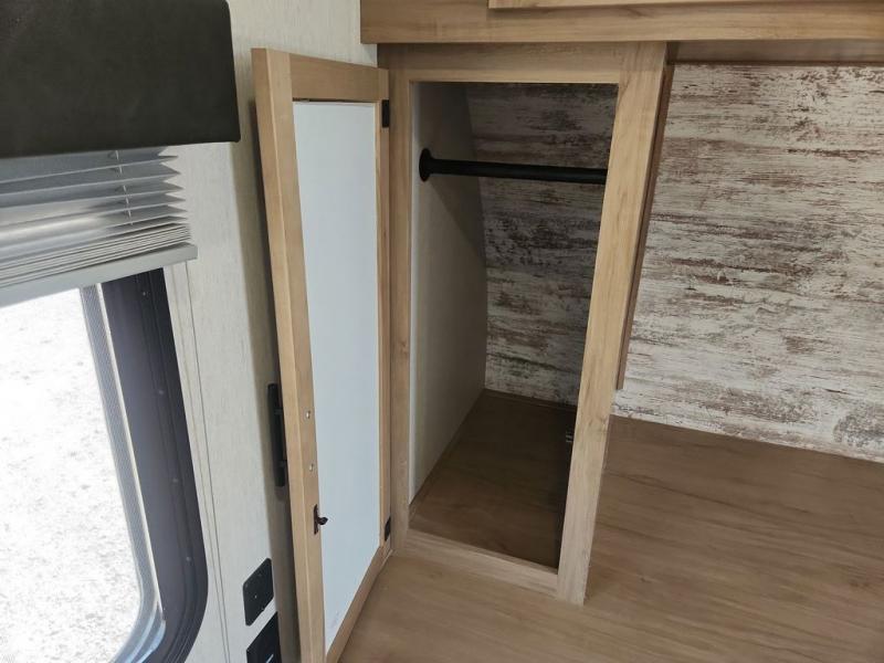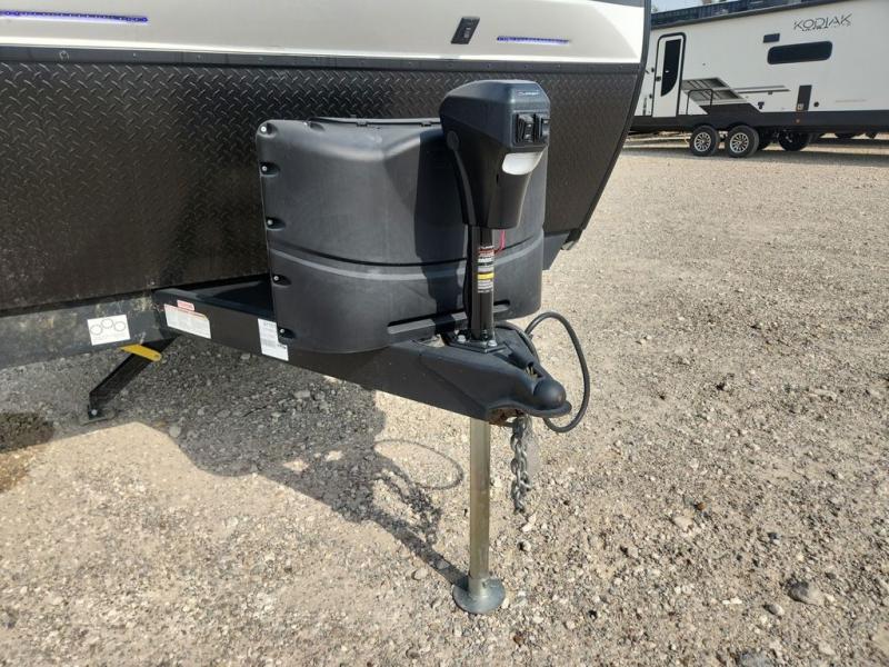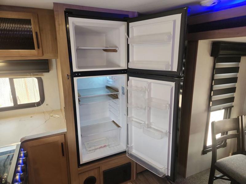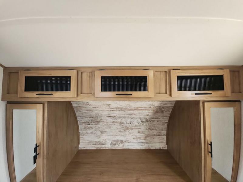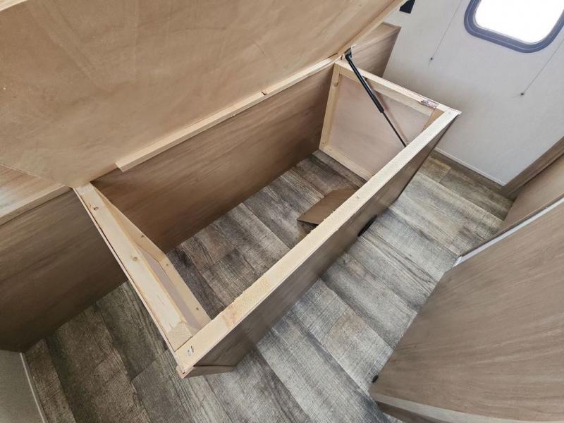 When you are looking for a couples trailer, you might want to stop your search after stepping inside this one! Some of highlights include theater seating to relax in while enjoying the fireplace, a walk-in pantry, and a large slide out. You can dine at the free-standing table with two fixed chairs and two folding chairs, and this space is great if you need a work area. There is bench seating with storage allowing you to sit down while taking off your shoes, plus overhead storage for belongings. The double entry bathroom is convenient, and the front bedroom offers a queen bed with two sides of storage, plus windows for cross-ventilation when you want some fresh air inside.