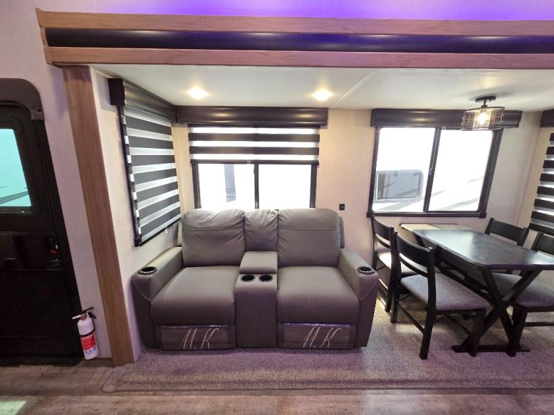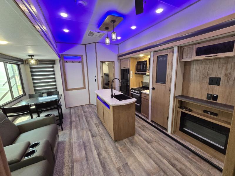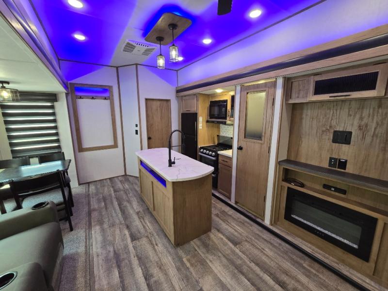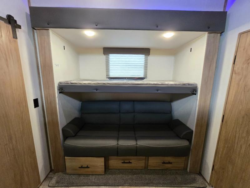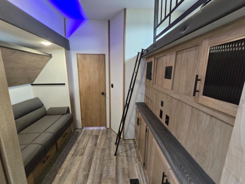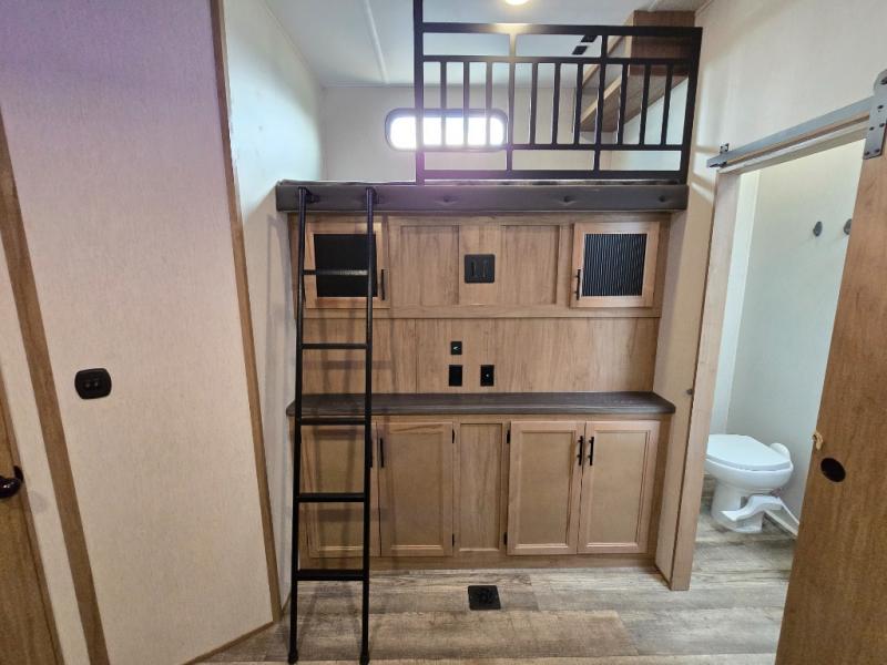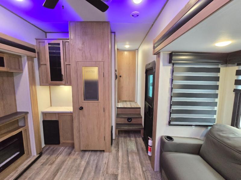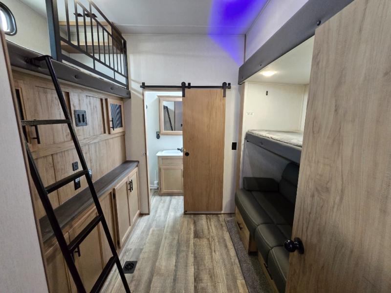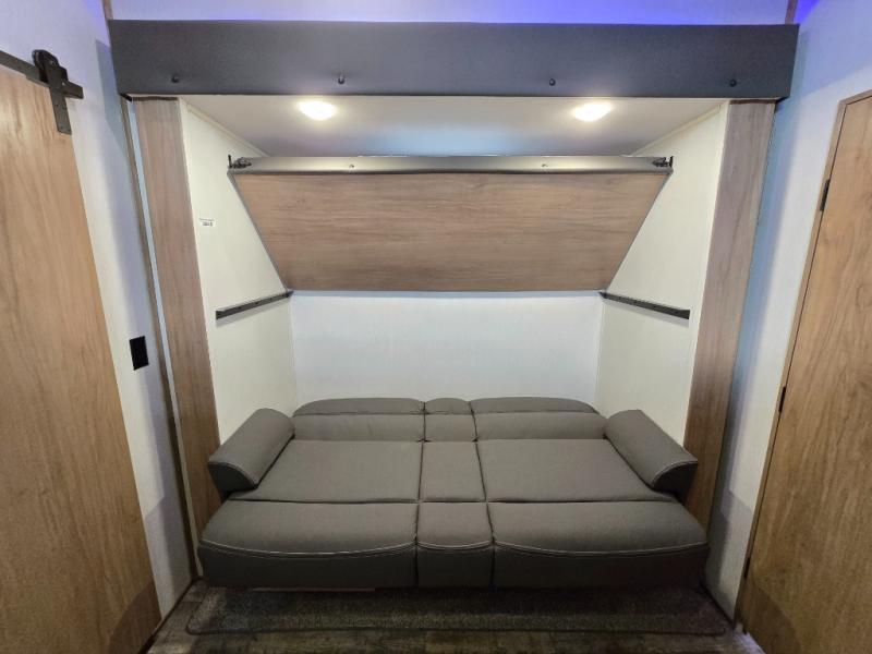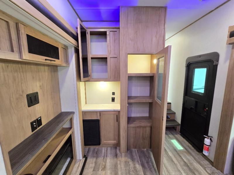 You can't beat this dual entry fifth wheel packed with luxury amenities! Your guests will love the rear private bunkhouse with their own full bath and exterior entry door, plus a jackknife sofa with drawers and a flip-up bunk. There is even a loft with a bunk mat for more sleeping space! The main kitchen and living area includes dual opposing slides, theater seating across from the fireplace, and even a coffee bar where you can set up your Keurig machine. There is also a table with two fixed chairs and two folding chairs, a second pantry, plus a 12V refrigerator for food storage. You'll find the second full bath to be super convenient when traveling with friends and family, and the front private bedroom will feel just like home. Here, you'll find a king bed slide out, an oversized front bedroom closet with built in shelves and sliding doors, plus a desk with a makeup area that can double as a work desk if needed. Head outdoors to enjoy the exterior griddle and two exterior refrigerators, plus the 15' power awning and pass-through storage!