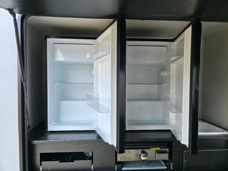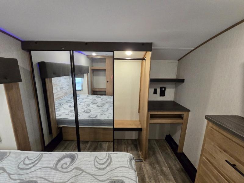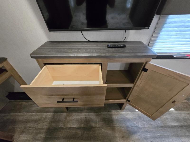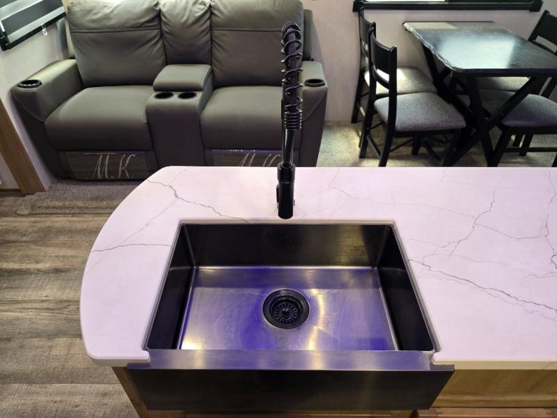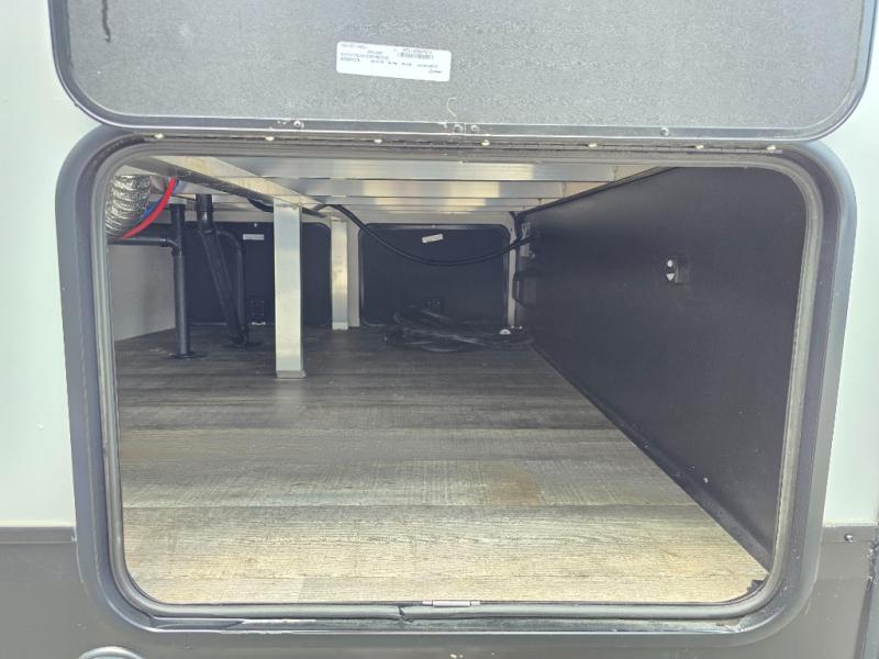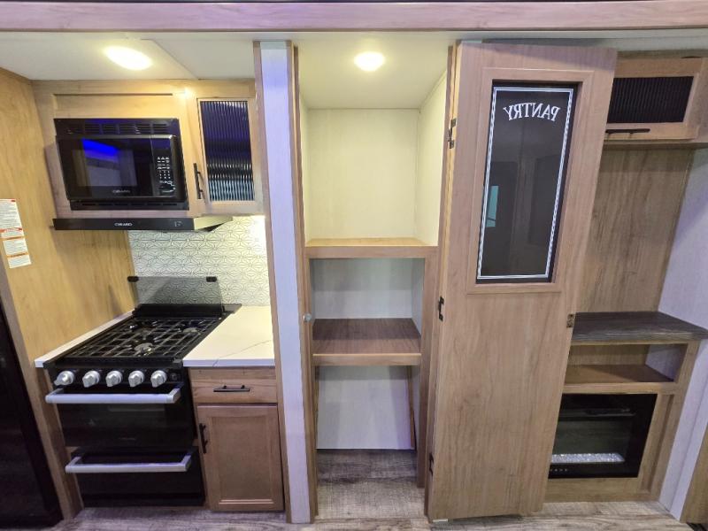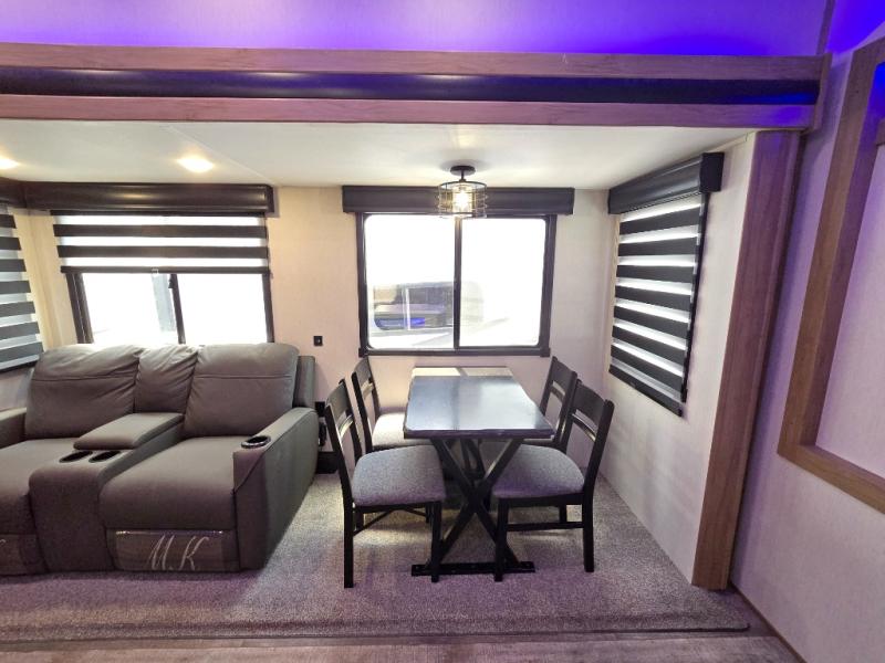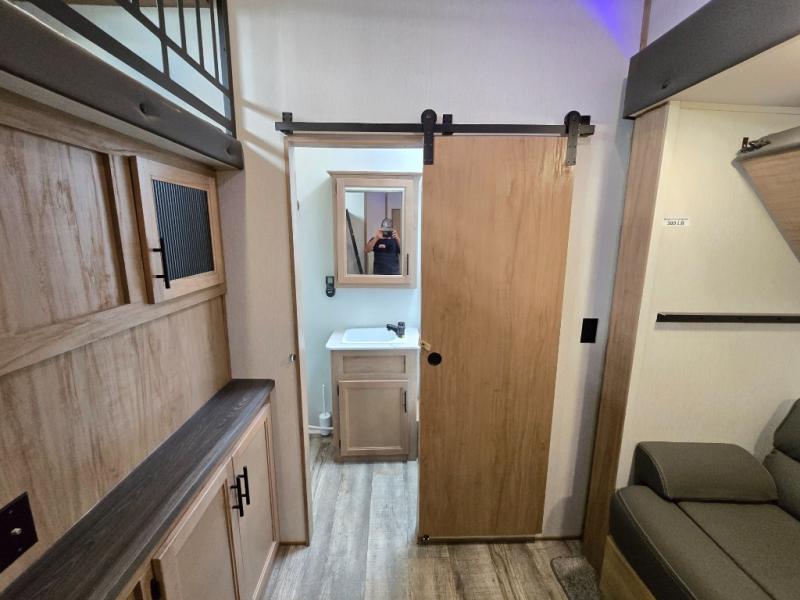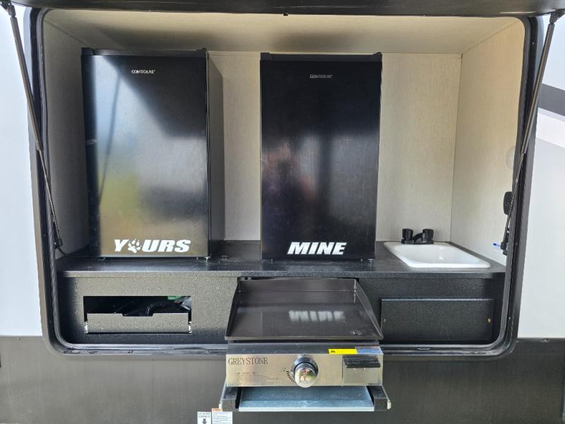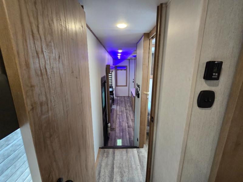 You can't beat this dual entry fifth wheel packed with luxury amenities! Your guests will love the rear private bunkhouse with their own full bath and exterior entry door, plus a jackknife sofa with drawers and a flip-up bunk. There is even a loft with a bunk mat for more sleeping space! The main kitchen and living area includes dual opposing slides, theater seating across from the fireplace, and even a coffee bar where you can set up your Keurig machine. There is also a table with two fixed chairs and two folding chairs, a second pantry, plus a 12V refrigerator for food storage. You'll find the second full bath to be super convenient when traveling with friends and family, and the front private bedroom will feel just like home. Here, you'll find a king bed slide out, an oversized front bedroom closet with built in shelves and sliding doors, plus a desk with a makeup area that can double as a work desk if needed. Head outdoors to enjoy the exterior griddle and two exterior refrigerators, plus the 15' power awning and pass-through storage!