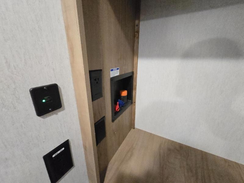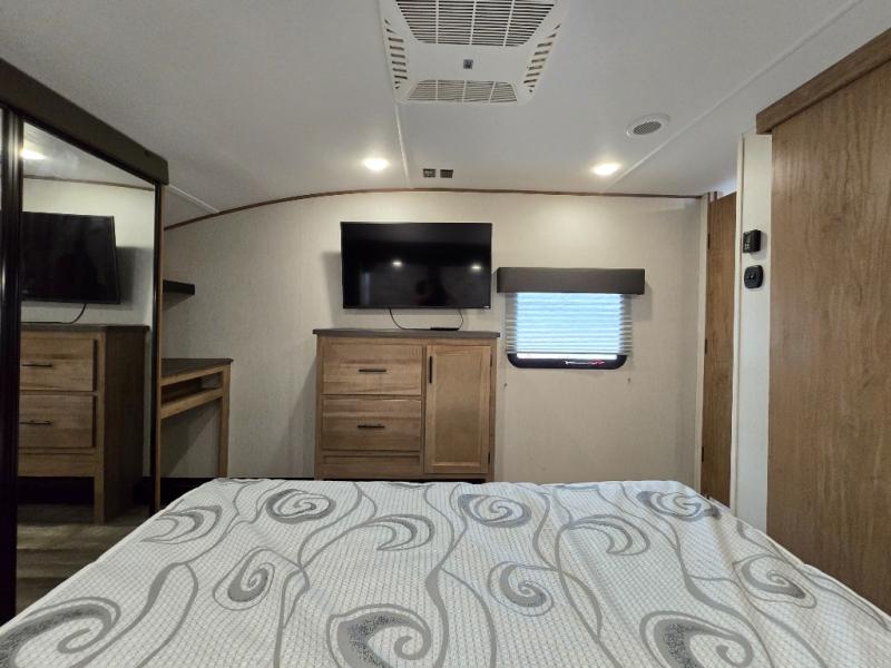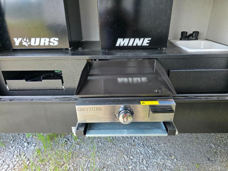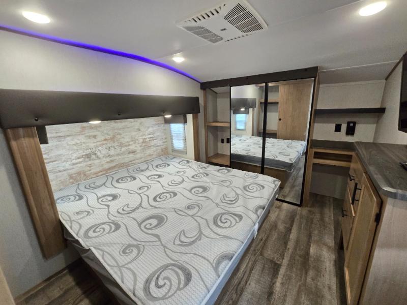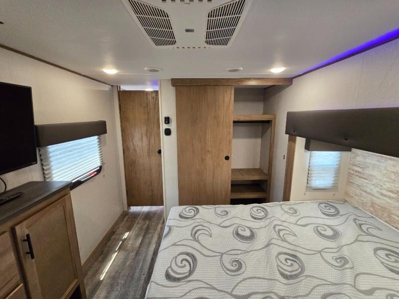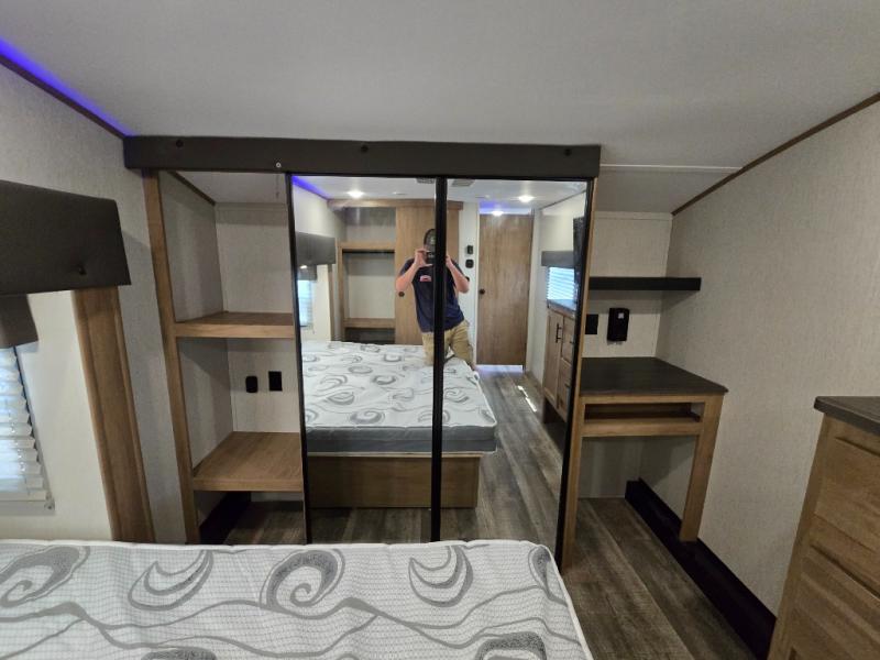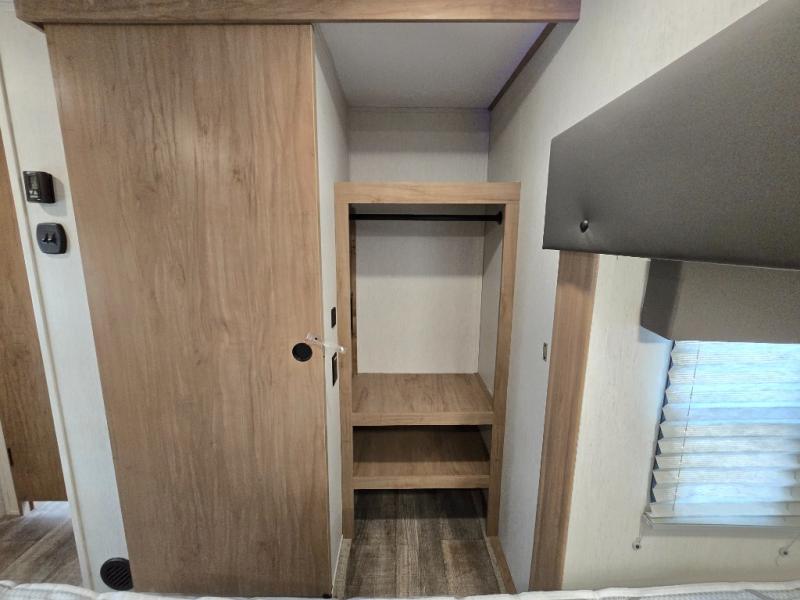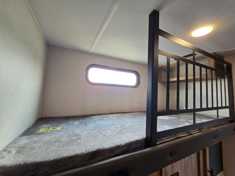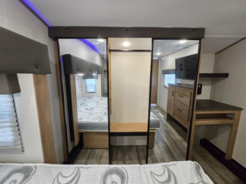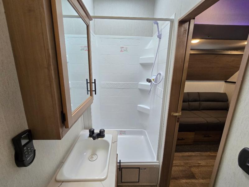 You can't beat this dual entry fifth wheel packed with luxury amenities! Your guests will love the rear private bunkhouse with their own full bath and exterior entry door, plus a jackknife sofa with drawers and a flip-up bunk. There is even a loft with a bunk mat for more sleeping space! The main kitchen and living area includes dual opposing slides, theater seating across from the fireplace, and even a coffee bar where you can set up your Keurig machine. There is also a table with two fixed chairs and two folding chairs, a second pantry, plus a 12V refrigerator for food storage. You'll find the second full bath to be super convenient when traveling with friends and family, and the front private bedroom will feel just like home. Here, you'll find a king bed slide out, an oversized front bedroom closet with built in shelves and sliding doors, plus a desk with a makeup area that can double as a work desk if needed. Head outdoors to enjoy the exterior griddle and two exterior refrigerators, plus the 15' power awning and pass-through storage!