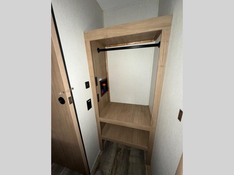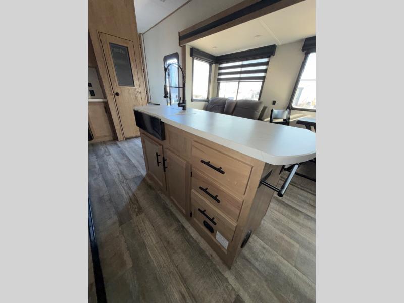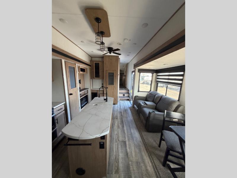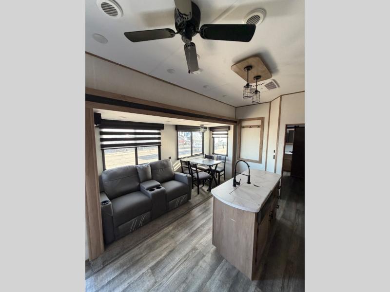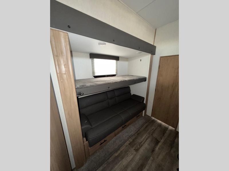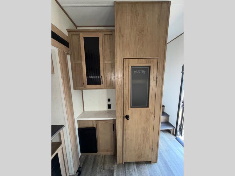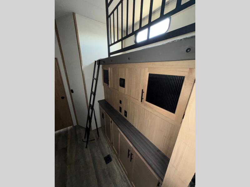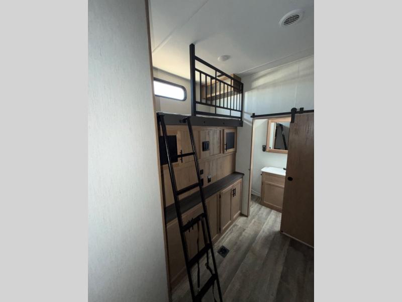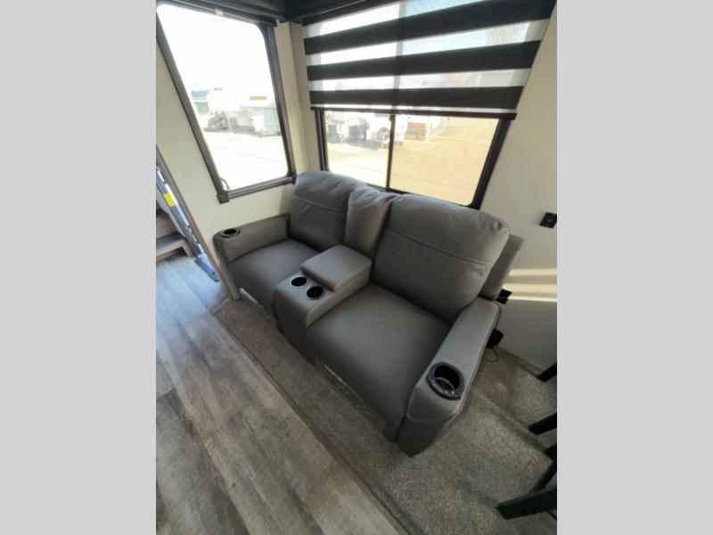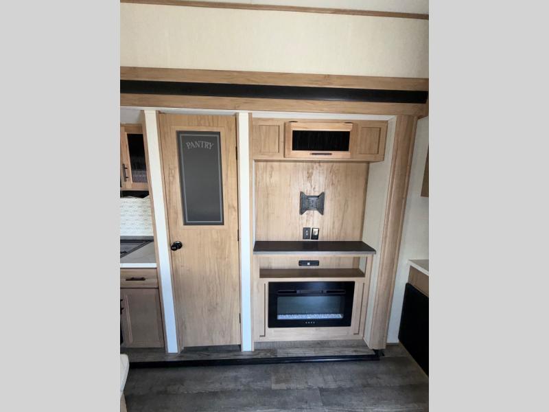 You can't beat this dual entry fifth wheel packed with luxury amenities! Your guests will love the rear private bunkhouse with their own full bath and exterior entry door, plus a jackknife sofa with drawers and a flip-up bunk. There is even a loft with a bunk mat for more sleeping space! The main kitchen and living area includes dual opposing slides, theater seating across from the fireplace, and even a coffee bar where you can set up your Keurig machine. There is also a table with two fixed chairs and two folding chairs, a second pantry, plus a 12V refrigerator for food storage. You'll find the second full bath to be super convenient when traveling with friends and family, and the front private bedroom will feel just like home. Here, you'll find a king bed slide out, an oversized front bedroom closet with built in shelves and sliding doors, plus a desk with a makeup area that can double as a work desk if needed. Head outdoors to enjoy the exterior griddle and two exterior refrigerators, plus the 15' power awning and pass-through storage!