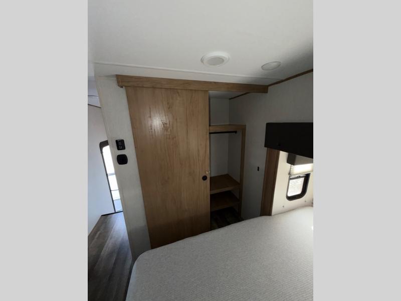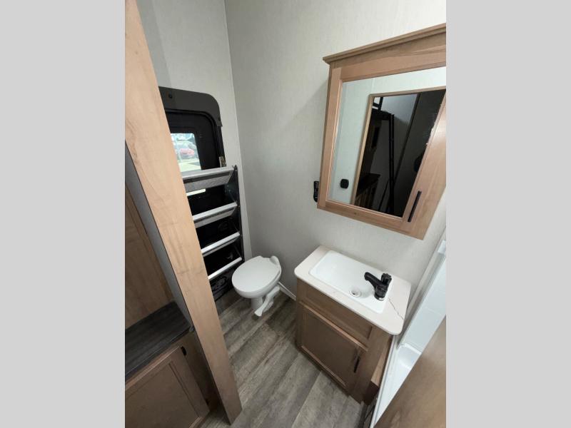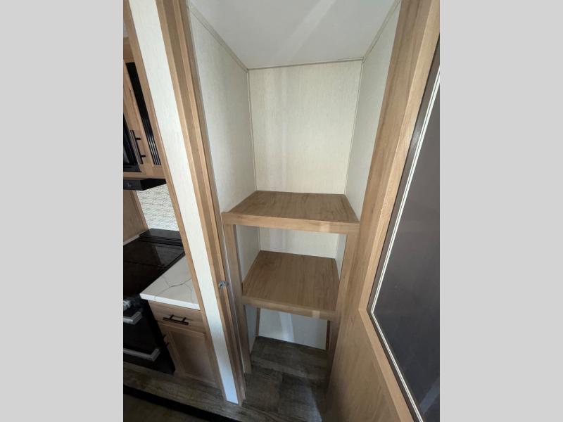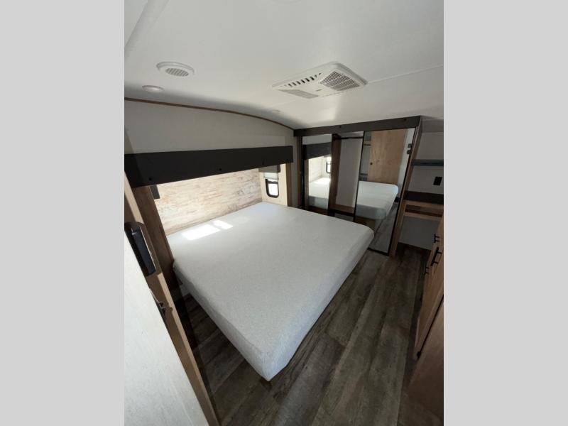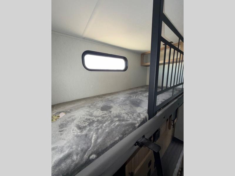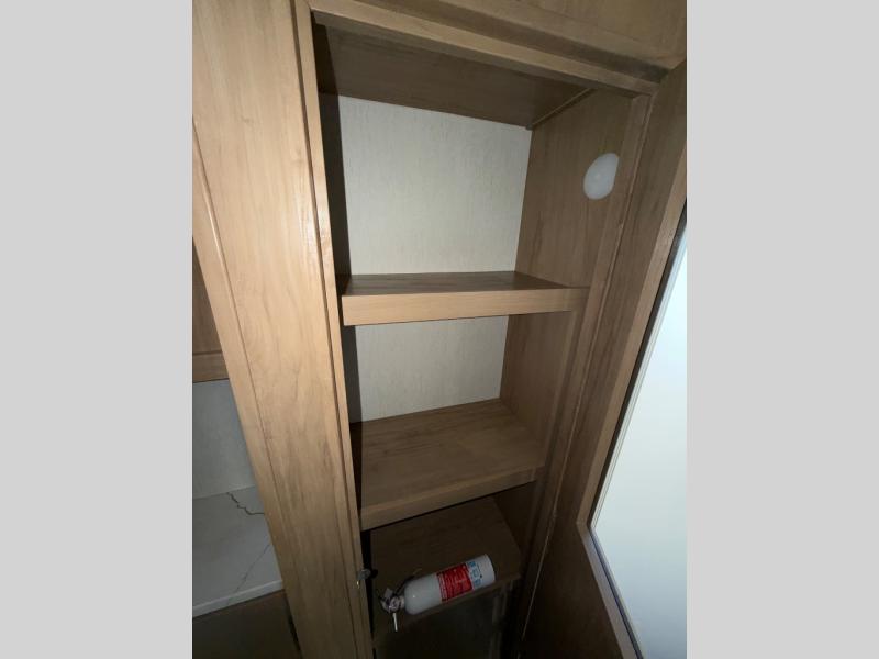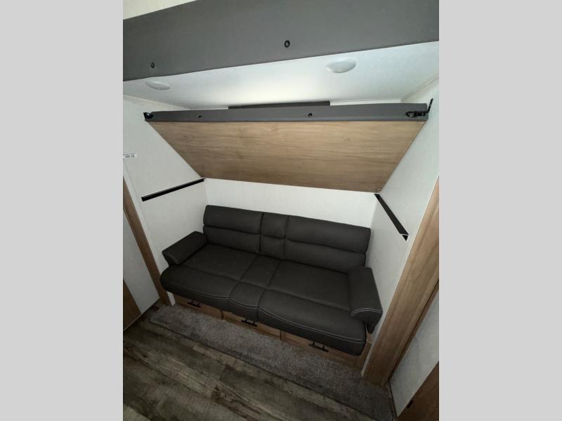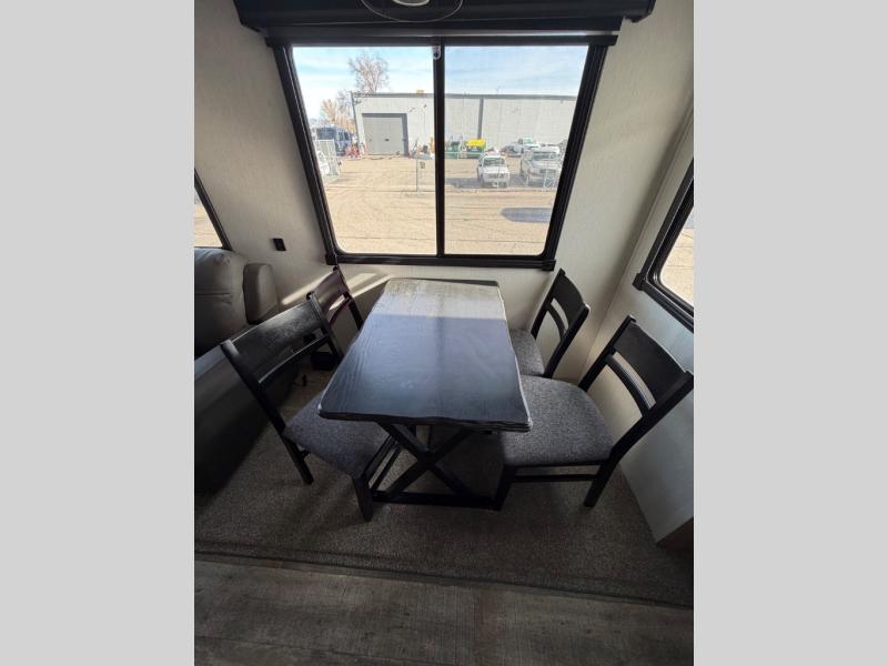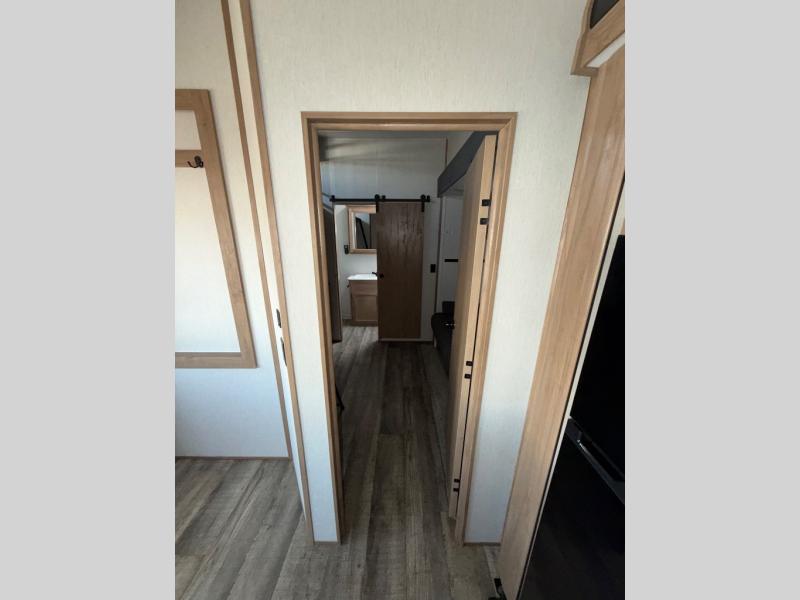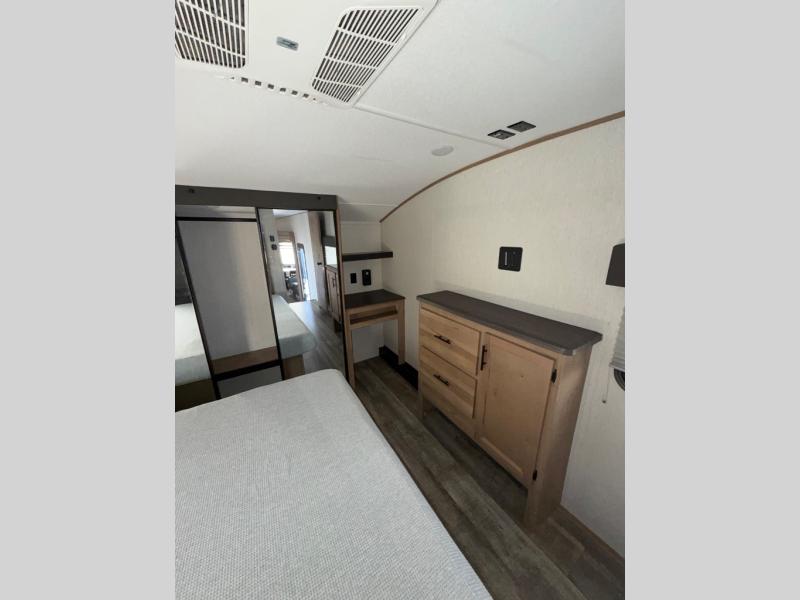 You can't beat this dual entry fifth wheel packed with luxury amenities! Your guests will love the rear private bunkhouse with their own full bath and exterior entry door, plus a jackknife sofa with drawers and a flip-up bunk. There is even a loft with a bunk mat for more sleeping space! The main kitchen and living area includes dual opposing slides, theater seating across from the fireplace, and even a coffee bar where you can set up your Keurig machine. There is also a table with two fixed chairs and two folding chairs, a second pantry, plus a 12V refrigerator for food storage. You'll find the second full bath to be super convenient when traveling with friends and family, and the front private bedroom will feel just like home. Here, you'll find a king bed slide out, an oversized front bedroom closet with built in shelves and sliding doors, plus a desk with a makeup area that can double as a work desk if needed. Head outdoors to enjoy the exterior griddle and two exterior refrigerators, plus the 15' power awning and pass-through storage!