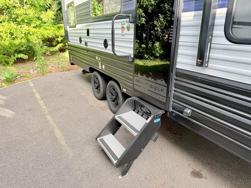 Whether it's a journey that will take you to new locations or a tried-and-true getaway to that favorite and memorable destination, the Forest River Cherokee Grey Wolf travel trailers and toy haulers are going to make the trip worth it every single time! You can travel in confidence with the premium wheel package, seamless roofing membrane with heat reflectivity, Power Gear frame technology with space-saver rail design, and Cherokee back-up camera system. The Cherokee Grey Wolf's interior is highly attractive with its stainless steel kitchen suite package, premium bedding ensemble and comforter, and 8" ceiling-mounted subwoofer with accent lighting. You will also find a black waste tank flush-out kit, an outside shower with hot and cold water, an armored underbelly tank enclosure, a power tongue jack, and an RV grill quick connect.