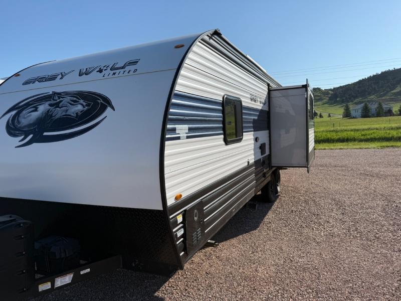Whether it's a journey that will take you to new locations or a tried-and-true getaway to that favorite and memorable destination, the Forest River Cherokee Grey Wolf travel trailers and toy haulers are going to make the trip worth it every single time! You can travel in confidence with the premium wheel package, seamless roofing membrane with heat reflectivity, Power Gear frame technology with space-saver rail design, and Cherokee back-up camera system. The Cherokee Grey Wolf's interior is highly attractive with its stainless steel kitchen suite package, premium bedding ensemble and comforter, and 8" ceiling-mounted subwoofer with accent lighting. You will also find a black waste tank flush-out kit, an outside shower with hot and cold water, an armored underbelly tank enclosure, a power tongue jack, and an RV grill quick connect.