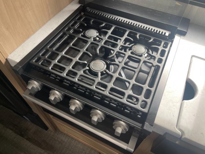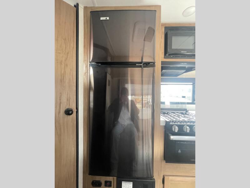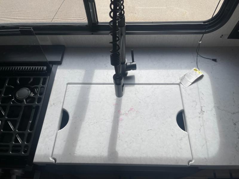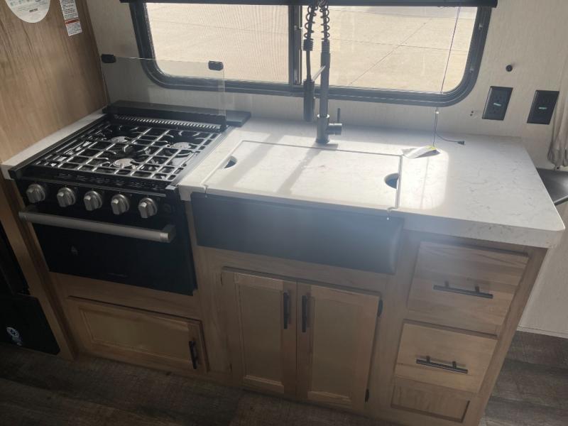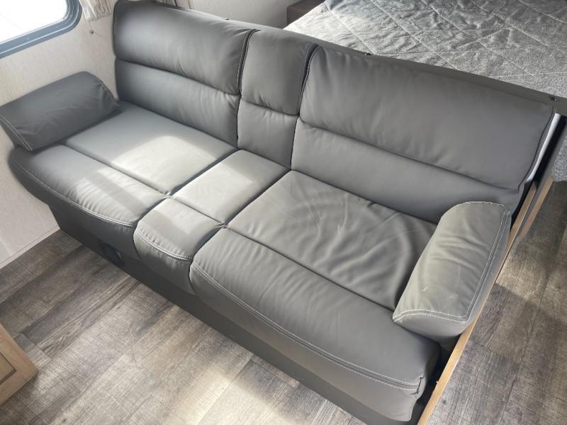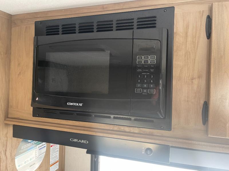 Enjoy cooking for nine in this Cherokee Grey Wolf travel trailer. With a three-burner cooktop, an overhead microwave, and an oven, you can easily cook just like home. The residential farm-style stainless steel sink makes cleaning your larger pots and pans quite simple, and the large overhead cabinets make storage an easy task as well. There is plenty of seating for the whole gang with the sofa and the booth dinette to play a game or two after you have enjoyed your delicious meal. Your kiddos are sure to love having their own set of double-size bunks conveniently located next to the rear bath, and you will love having your own front bedroom. You can also create some outdoor living space beneath the 15' power awning so that you can enjoy the great outdoors whether rain or shine!