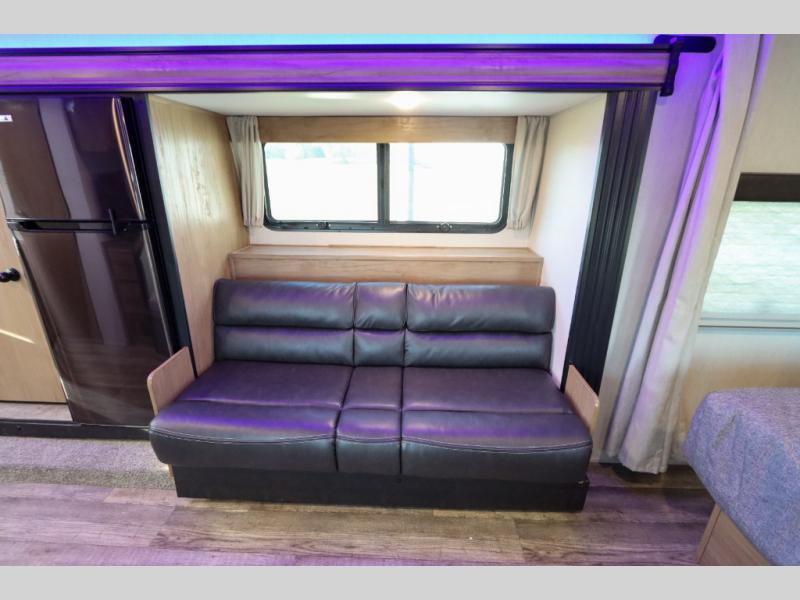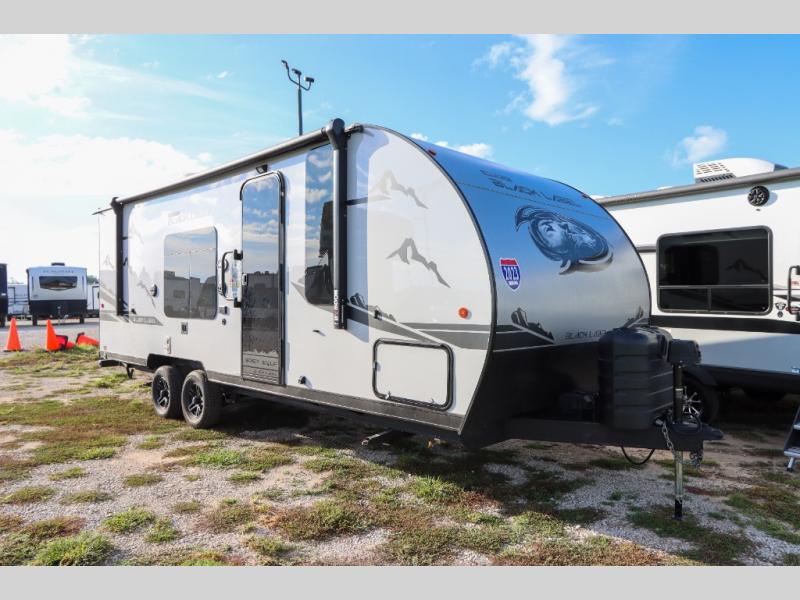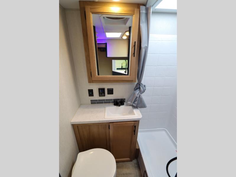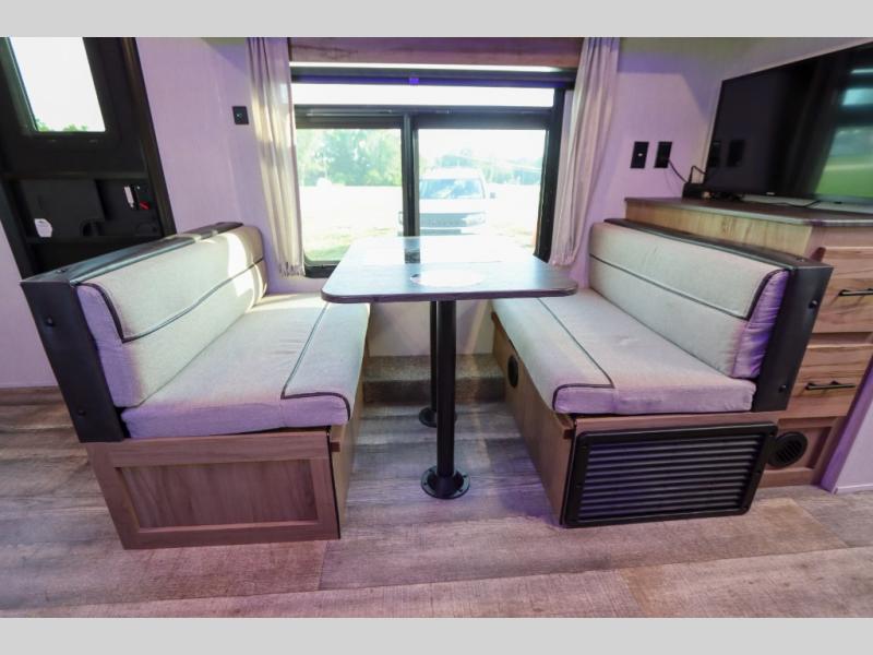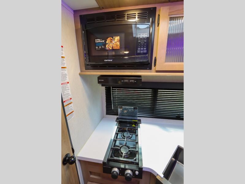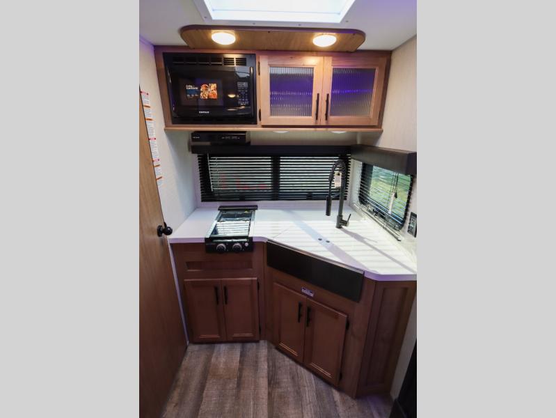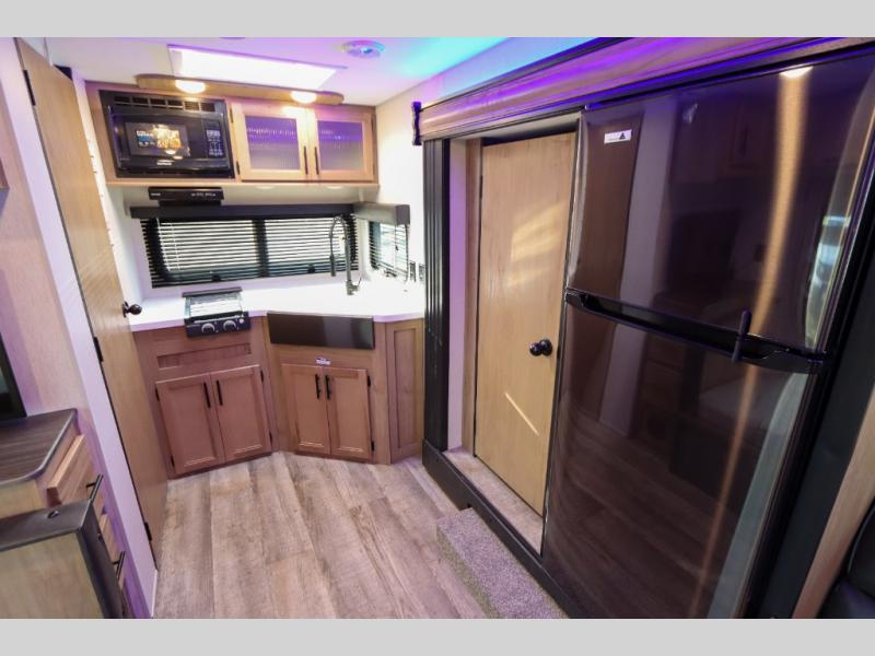 Make yourself at home in this Cherokee Grey Wolf Black Label travel trailer model which features a single slide for added interior space. The slide houses your sofa with upgraded fabric, an 11 cu. ft. 12 volt refrigerator, and pantry for tons of storage. You will find a two burner range top and microwave oven next to the farm style black stainless steel sink with upgraded faucet. In the rear corner bathroom, enjoy the added headroom and natural lighting that streams in each morning due to the skylight overhead in the shower. The upgraded showerhead is also a plus, as well as the on demand tankless water heater! You will enjoy the booth dinette and sofa for seating when inside, and when it's time to head to bed, a queen bed is a welcome retreat. The sofa and dinette can also be converted for children or an extra guest.